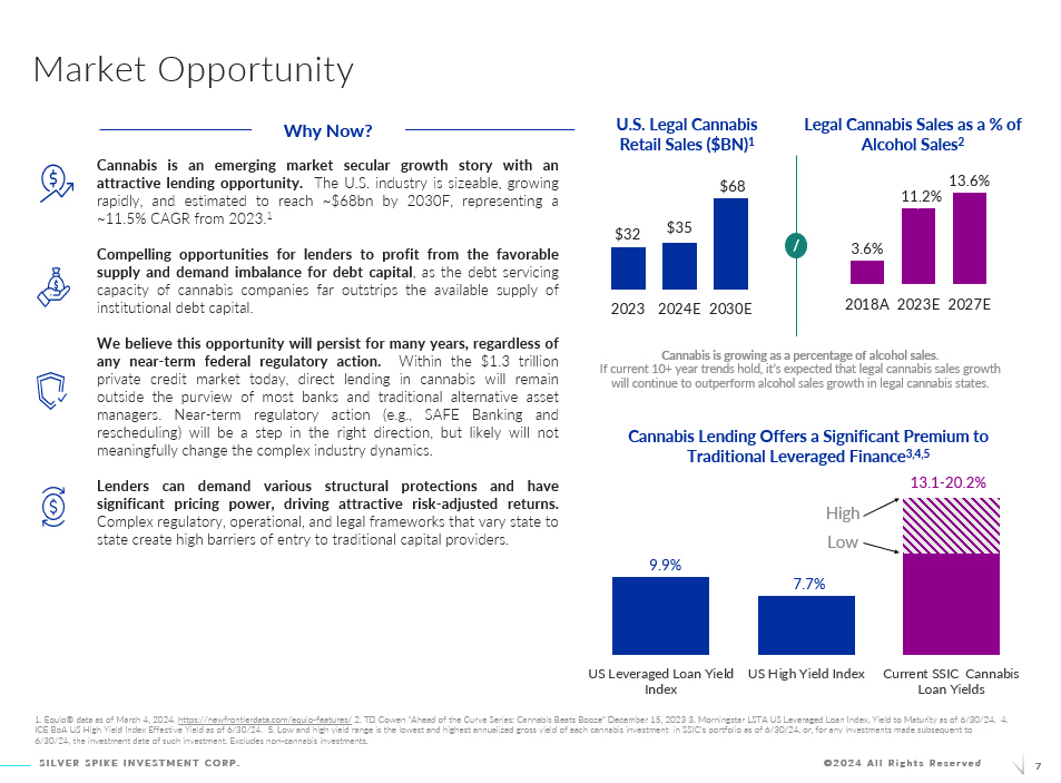 6 SILVER SPIKE INVESTMENT CORP. ©2024 All Rights Reserved Competitive Advantages M ANAGEMENT T EAM First mover in the cannabis BDC landscape — currently the only public BDC focused on direct - lending to the cannabis sector BDCs are direct lending vehicles that are more flexible than REITS: Deep background, experience, and skills across credit and special situations, in both developed and emerging markets across dozens of jurisdictions Our four partners have an average of nearly 31 years of experience in credit and capital markets Successful track record scaling credit, trading and asset management businesses Cannabis operating and investing expertise BDC S TRUCTURE VS REIT » SSIC can lend against cash flows as well as multiple types of collateral, including real estate, equipment, cash and receivables, and the equity of subsidiaries which often own cannabis licenses » REITs must have 75% of their assets invested in real estate or mortgages, narrowing the investable universe » We believe cash - flow lending is a much larger addressable market in the cannabis industry