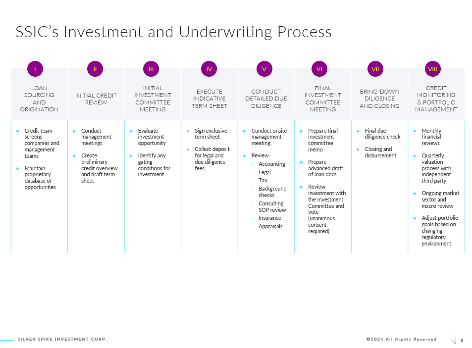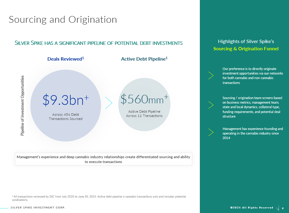 8 SILVER SPIKE INVESTMENT CORP. ©2024 All Rights Reserved CREDIT MONITORING & PORTFOLIO MANAGEMENT BRING - DOWN DILIGENCE AND CLOSING FINAL INVESTMENT COMMITTEE MEETING CONDUCT DETAILED DUE DILIGENCE EXECUTE INDICATIVE TERM SHEET INITIAL INVESTMENT COMMITTEE MEETING INITIAL CREDIT REVIEW LOAN SOURCING AND ORIGINATION Monthly financial reviews Quarterly valuation process with independent third party Ongoing market sector and macro review Adjust portfolio goals based on changing regulatory environment Final due diligence check Closing and disbursement Prepare final investment committee memo Prepare advanced draft of loan docs Review investment with the Investment Committee and vote (unanimous consent required) Conduct onsite management meeting. Review: - Accounting - Legal - Tax - Background checks - Consulting SOP review - Insurance - Appraisals Sign exclusive term sheet Collect deposit for legal and due diligence fees Evaluate investment opportunity Identify any gating conditions for investment Conduct management meetings Create preliminary credit overview and draft term sheet Credit team screens companies and management teams Maintain proprietary database of opportunities SSIC’s Investment and Underwriting Process I II III IV V VI VII VIII