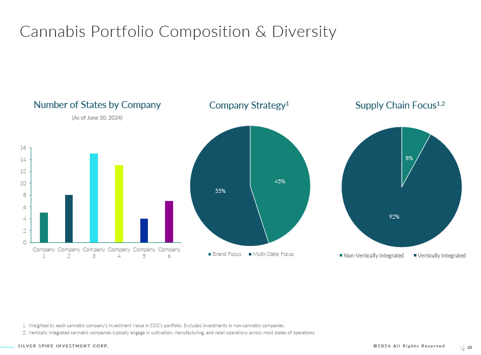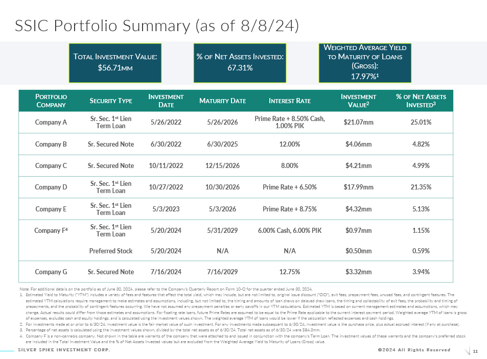 10 SILVER SPIKE INVESTMENT CORP. ©2024 All Rights Reserved Cannabis Portfolio Composition & Diversity Number of States by Company (As of June 30, 2024) 45% 55% Brand Focus Multi-State Focus Company Strategy 1 8% 92% Non-Vertically Integrated Vertically Integrated Supply Chain Focus 1,2 0 2 4 6 8 10 12 14 16 Company 1 Company 2 Company 3 Company 4 Company 5 Company 6 1. Weighted by each cannabis company’s Investment Value in SSIC’s portfolio. Excludes investments in non - cannabis companies. 2. Vertically integrated cannabis companies typically engage in cultivation, manufacturing, and retail operations across most st ate s of operations.