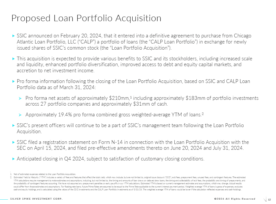 12 SILVER SPIKE INVESTMENT CORP. ©2024 All Rights Reserved Proposed Loan Portfolio Acquisition . 1. Net of estimated expenses related to the Loan Portfolio Acquisition. 2. Estimated Yield to Maturity (“YTM”) includes a variety of fees and features that affect the total yield, which may include, b ut are not limited to, original issue discount (“OID”), exit fees, prepayment fees, unused fees, and contingent features. The es tim ated YTM calculations require management to make estimates and assumptions, including, but not limited to, the timing and amounts of loan draws on delayed draw loans, the timing and collectability of exit fees, the probability and timing of prepayments, and the probability of contingent features occurring. We have not assumed any prepayment penalties or early payoffs in our YTM ca lcu lations. Estimated YTM is based on current management estimates and assumptions, which may change. Actual results could differ from those estimates and assumptions. For floating rate loans, future Prime Rates are assumed to be equal to the Pr ime Rate applicable to the current interest payment period. Weighted average YTM of loans is gross of expenses, excludes cash and equity holdings, and is calculated using the values of the SSIC investments and the CALP Loan Portfolio investments as of 3/31/24. The weighted average YTM of loans would be lower if the calculation reflected expenses and cash holdings. SSIC announced on February 20, 2024, that it entered into a definitive agreement to purchase from Chicago Atlantic Loan Portfolio, LLC (“CALP”) a portfolio of loans (the “CALP Loan Portfolio”) in exchange for newly issued shares of SSIC’s common stock (the “Loan Portfolio Acquisition”). This acquisition is expected to provide various benefits to SSIC and its stockholders, including increased scale and liquidity, enhanced portfolio diversification, improved access to debt and equity capital markets, and accretion to net investment income. Pro forma information following the closing of the Loan Portfolio Acquisition, based on SSIC and CALP Loan Portfolio data as of March 31, 2024: » Pro forma net assets of approximately $210mm, 1 including approximately $183mm of portfolio investments across 27 portfolio companies and approximately $31mm of cash. » Approximately 19.4% pro forma combined gross weighted - average YTM of loans. 2 SSIC’s present officers will continue to be a part of SSIC’s management team following the Loan Portfolio Acquisition. SSIC filed a registration statement on Form N - 14 in connection with the Loan Portfolio Acquisition with the SEC on April 15, 2024, and filed pre - effective amendments thereto on June 20, 2024 and July 31, 2024. Anticipated closing in Q4 2024, subject to satisfaction of customary closing conditions.