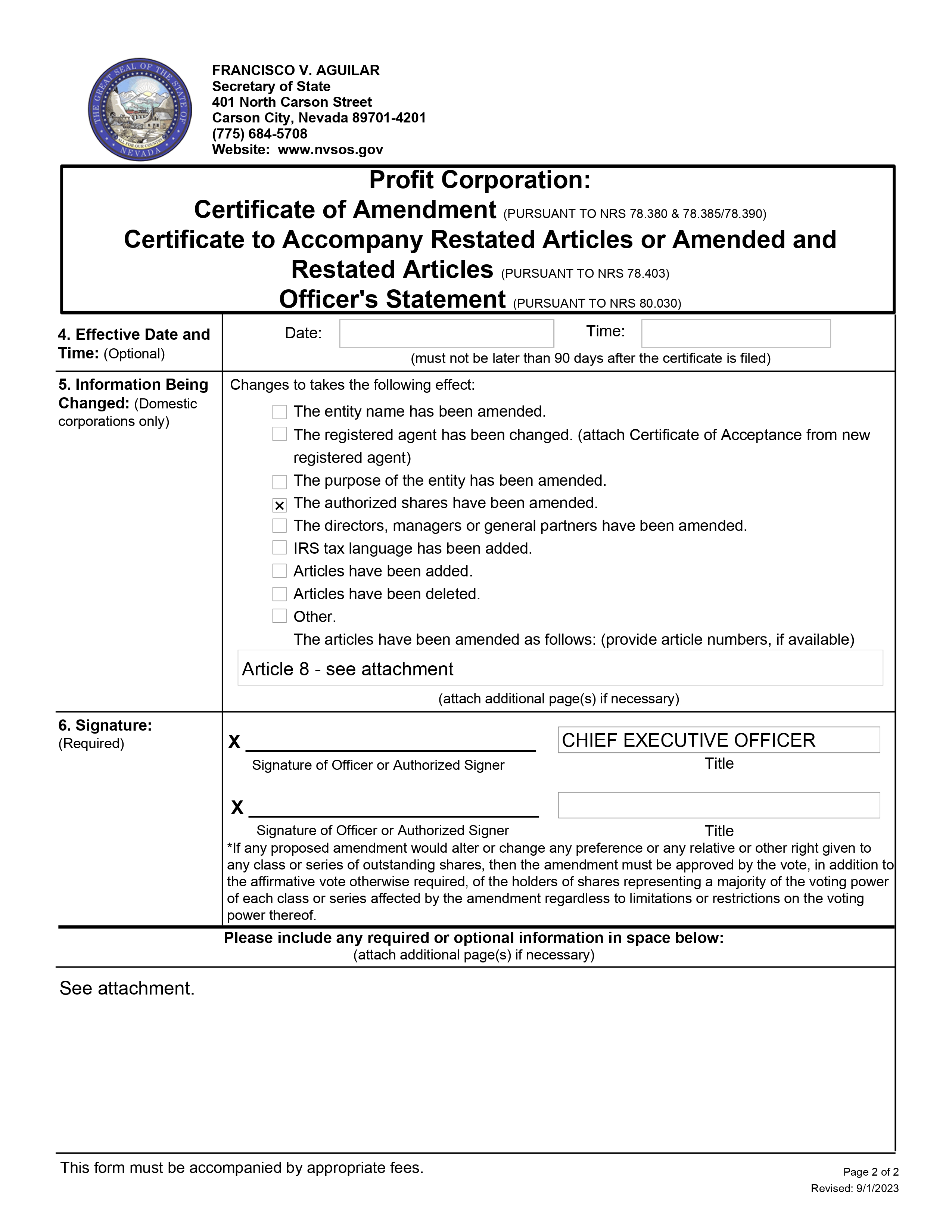 As of the Record Date, there were: (i) 37,107,807 shares of common stock outstanding (prior to the Reverse Stock Split); (ii) 181,564 shares of common stock issuable upon the exercise of stock options and restricted stock units outstanding (prior to the Reverse Stock Split); (iii) 2,773,750 shares (prior to the Reverse Stock Split) available for future issuance as awards under our 2021 Equity Incentive Plan, as amended (the “2021 Plan”). The additional shares of common stock to be authorized by adoption of the amendment would have rights identical to the currently outstanding shares of common stock. Adoption of the amendment would not affect the rights of the holders of currently outstanding common stock, except, to the extent the additional authorized shares are issued, for effects incidental to increasing the number of shares of common stock outstanding, such as dilution of earnings per share and voting rights of current holders of common stock. If the amendment is adopted, it will become effective upon the filing of the Certificate of Amendment to the Company’s Articles of Incorporation with the Secretary of State of the State of Nevada.