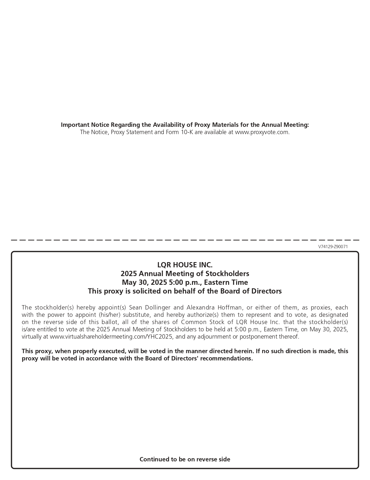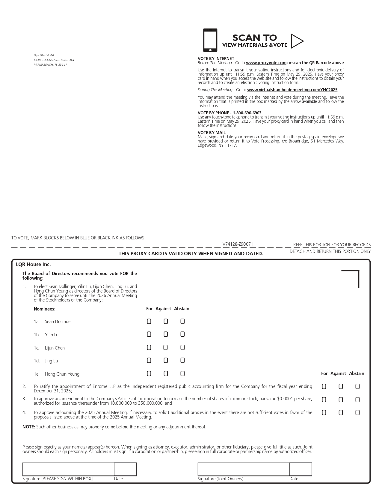 We are pleased to invite you to attend the 2025 Annual Meeting of Stockholders of LQR House Inc. (the “Annual Meeting”). The Annual Meeting will be held virtually via live webcast on Friday, May 30, 2025 at 5:00 p.m. Eastern Time.