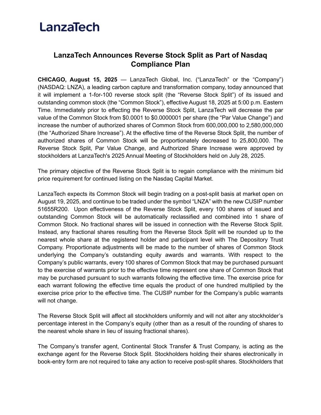 LanzaTech Announces Reverse Stock Split as Part of Nasdaq Compliance Plan CHICAGO, August 15, 2025 — LanzaTech Global, Inc. (“LanzaTech” or the “Company”) (NASDAQ: LNZA), a leading carbon capture and transformation company, today announced that it will implement a 1-for-100 reverse stock split (the “Reverse Stock Split”) of its issued and outstanding common stock (the “Common Stock”), effective August 18, 2025 at 5:00 p.m. Eastern Time. Immediately prior to effecting the Reverse Stock Split, LanzaTech will decrease the par value of the Common Stock from $0.0001 to $0.0000001 per share (the “Par Value Change”) and increase the number of authorized shares of Common Stock from 600,000,000 to 2,580,000,000 (the “Authorized Share Increase”). At the effective time of the Reverse Stock Split, the number of authorized shares of Common Stock will be proportionately decreased to 25,800,000. The Reverse Stock Split, Par Value Change, and Authorized Share Increase were approved by stockholders at LanzaTech's 2025 Annual Meeting of Stockholders held on July 28, 2025. The primary objective of the Reverse Stock Split is to regain compliance with the minimum bid price requirement for continued listing on the Nasdaq Capital Market. LanzaTech expects its Common Stock will begin trading on a post-split basis at market open on August 19, 2025, and continue to be traded under the symbol “LNZA” with the new CUSIP number 51655R200. Upon effectiveness of the Reverse Stock Split, every 100 shares of issued and outstanding Common Stock will be automatically reclassified and combined into 1 share of Common Stock. No fractional shares will be issued in connection with the Reverse Stock Split. Instead, any fractional shares resulting from the Reverse Stock Split will be rounded up to the nearest whole share at the registered holder and participant level with The Depository Trust Company. Proportionate adjustments will be made to the number of shares of Common Stock underlying the Company’s outstanding equity awards and warrants. With respect to the Company’s public warrants, every 100 shares of Common Stock that may be purchased pursuant to the exercise of warrants prior to the effective time represent one share of Common Stock that may be purchased pursuant to such warrants following the effective time. The exercise price for each warrant following the effective time equals the product of one hundred multiplied by the exercise price prior to the effective time. The CUSIP number for the Company’s public warrants will not change. The Reverse Stock Split will affect all stockholders uniformly and will not alter any stockholder’s percentage interest in the Company’s equity (other than as a result of the rounding of shares to the nearest whole share in lieu of issuing fractional shares). The Company’s transfer agent, Continental Stock Transfer & Trust Company, is acting as the exchange agent for the Reverse Stock Split. Stockholders holding their shares electronically in book-entry form are not required to take any action to receive post-split shares. Stockholders that