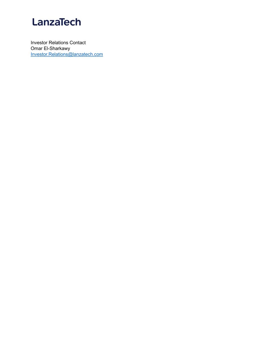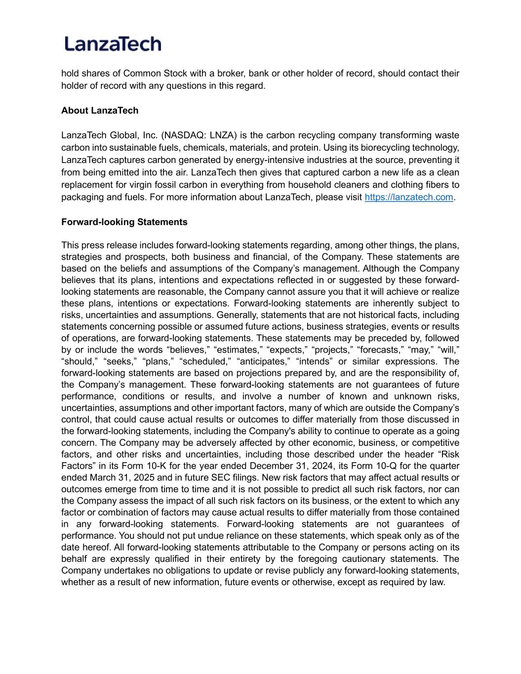 hold shares of Common Stock with a broker, bank or other holder of record, should contact their holder of record with any questions in this regard. About LanzaTech LanzaTech Global, Inc. (NASDAQ: LNZA) is the carbon recycling company transforming waste carbon into sustainable fuels, chemicals, materials, and protein. Using its biorecycling technology, LanzaTech captures carbon generated by energy-intensive industries at the source, preventing it from being emitted into the air. LanzaTech then gives that captured carbon a new life as a clean replacement for virgin fossil carbon in everything from household cleaners and clothing fibers to packaging and fuels. For more information about LanzaTech, please visit https://lanzatech.com. Forward-looking Statements This press release includes forward-looking statements regarding, among other things, the plans, strategies and prospects, both business and financial, of the Company. These statements are based on the beliefs and assumptions of the Company’s management. Although the Company believes that its plans, intentions and expectations reflected in or suggested by these forward- looking statements are reasonable, the Company cannot assure you that it will achieve or realize these plans, intentions or expectations. Forward-looking statements are inherently subject to risks, uncertainties and assumptions. Generally, statements that are not historical facts, including statements concerning possible or assumed future actions, business strategies, events or results of operations, are forward-looking statements. These statements may be preceded by, followed by or include the words “believes,” “estimates,” “expects,” “projects,” “forecasts,” “may,” “will,” “should,” “seeks,” “plans,” “scheduled,” “anticipates,” “intends” or similar expressions. The forward-looking statements are based on projections prepared by, and are the responsibility of, the Company’s management. These forward-looking statements are not guarantees of future performance, conditions or results, and involve a number of known and unknown risks, uncertainties, assumptions and other important factors, many of which are outside the Company’s control, that could cause actual results or outcomes to differ materially from those discussed in the forward-looking statements, including the Company's ability to continue to operate as a going concern. The Company may be adversely affected by other economic, business, or competitive factors, and other risks and uncertainties, including those described under the header “Risk Factors” in its Form 10-K for the year ended December 31, 2024, its Form 10-Q for the quarter ended March 31, 2025 and in future SEC filings. New risk factors that may affect actual results or outcomes emerge from time to time and it is not possible to predict all such risk factors, nor can the Company assess the impact of all such risk factors on its business, or the extent to which any factor or combination of factors may cause actual results to differ materially from those contained in any forward-looking statements. Forward-looking statements are not guarantees of performance. You should not put undue reliance on these statements, which speak only as of the date hereof. All forward-looking statements attributable to the Company or persons acting on its behalf are expressly qualified in their entirety by the foregoing cautionary statements. The Company undertakes no obligations to update or revise publicly any forward-looking statements, whether as a result of new information, future events or otherwise, except as required by law.