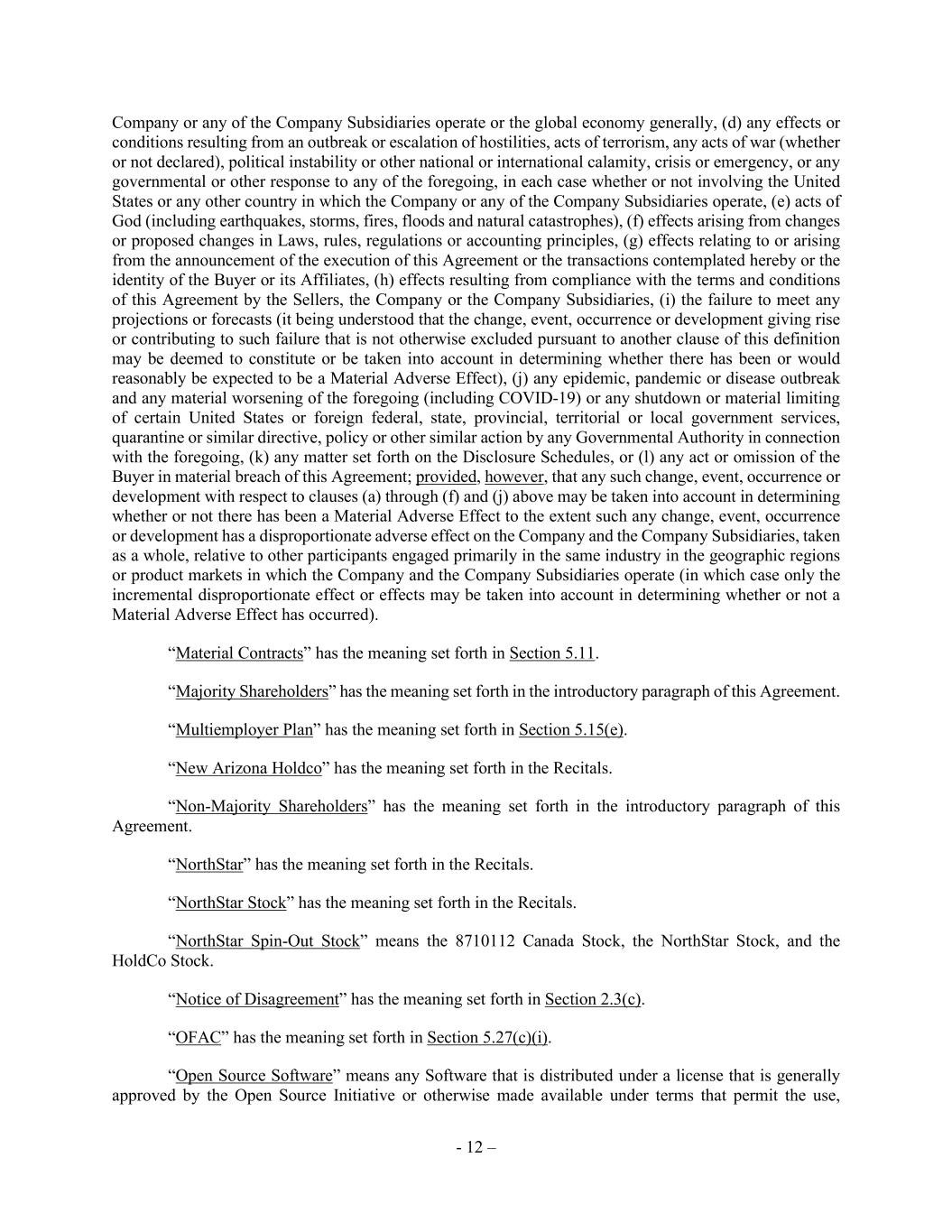 - 12 – Company or any of the Company Subsidiaries operate or the global economy generally, (d) any effects or conditions resulting from an outbreak or escalation of hostilities, acts of terrorism, any acts of war (whether or not declared), political instability or other national or international calamity, crisis or emergency, or any governmental or other response to any of the foregoing, in each case whether or not involving the United States or any other country in which the Company or any of the Company Subsidiaries operate, (e) acts of God (including earthquakes, storms, fires, floods and natural catastrophes), (f) effects arising from changes or proposed changes in Laws, rules, regulations or accounting principles, (g) effects relating to or arising from the announcement of the execution of this Agreement or the transactions contemplated hereby or the identity of the Buyer or its Affiliates, (h) effects resulting from compliance with the terms and conditions of this Agreement by the Sellers, the Company or the Company Subsidiaries, (i) the failure to meet any projections or forecasts (it being understood that the change, event, occurrence or development giving rise or contributing to such failure that is not otherwise excluded pursuant to another clause of this definition may be deemed to constitute or be taken into account in determining whether there has been or would reasonably be expected to be a Material Adverse Effect), (j) any epidemic, pandemic or disease outbreak and any material worsening of the foregoing (including COVID-19) or any shutdown or material limiting of certain United States or foreign federal, state, provincial, territorial or local government services, quarantine or similar directive, policy or other similar action by any Governmental Authority in connection with the foregoing, (k) any matter set forth on the Disclosure Schedules, or (l) any act or omission of the Buyer in material breach of this Agreement; provided, however, that any such change, event, occurrence or development with respect to clauses (a) through (f) and (j) above may be taken into account in determining whether or not there has been a Material Adverse Effect to the extent such any change, event, occurrence or development has a disproportionate adverse effect on the Company and the Company Subsidiaries, taken as a whole, relative to other participants engaged primarily in the same industry in the geographic regions or product markets in which the Company and the Company Subsidiaries operate (in which case only the incremental disproportionate effect or effects may be taken into account in determining whether or not a Material Adverse Effect has occurred). “Material Contracts” has the meaning set forth in Section 5.11. “Majority Shareholders” has the meaning set forth in the introductory paragraph of this Agreement. “Multiemployer Plan” has the meaning set forth in Section 5.15(e). “New Arizona Holdco” has the meaning set forth in the Recitals. “Non-Majority Shareholders” has the meaning set forth in the introductory paragraph of this Agreement. “NorthStar” has the meaning set forth in the Recitals. “NorthStar Stock” has the meaning set forth in the Recitals. “NorthStar Spin-Out Stock” means the 8710112 Canada Stock, the NorthStar Stock, and the HoldCo Stock. “Notice of Disagreement” has the meaning set forth in Section 2.3(c). “OFAC” has the meaning set forth in Section 5.27(c)(i). “Open Source Software” means any Software that is distributed under a license that is generally approved by the Open Source Initiative or otherwise made available under terms that permit the use,