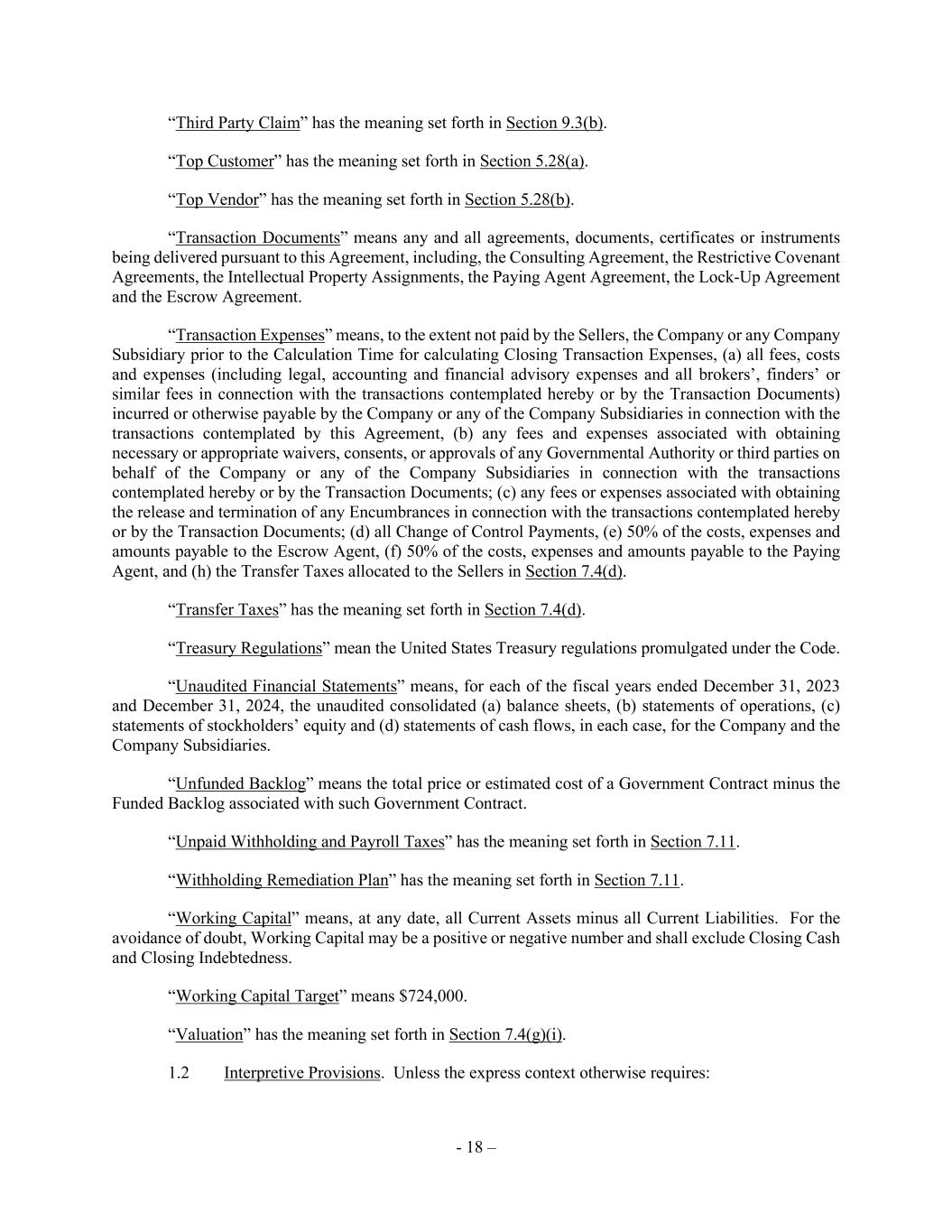 - 18 – “Third Party Claim” has the meaning set forth in Section 9.3(b). “Top Customer” has the meaning set forth in Section 5.28(a). “Top Vendor” has the meaning set forth in Section 5.28(b). “Transaction Documents” means any and all agreements, documents, certificates or instruments being delivered pursuant to this Agreement, including, the Consulting Agreement, the Restrictive Covenant Agreements, the Intellectual Property Assignments, the Paying Agent Agreement, the Lock-Up Agreement and the Escrow Agreement. “Transaction Expenses” means, to the extent not paid by the Sellers, the Company or any Company Subsidiary prior to the Calculation Time for calculating Closing Transaction Expenses, (a) all fees, costs and expenses (including legal, accounting and financial advisory expenses and all brokers’, finders’ or similar fees in connection with the transactions contemplated hereby or by the Transaction Documents) incurred or otherwise payable by the Company or any of the Company Subsidiaries in connection with the transactions contemplated by this Agreement, (b) any fees and expenses associated with obtaining necessary or appropriate waivers, consents, or approvals of any Governmental Authority or third parties on behalf of the Company or any of the Company Subsidiaries in connection with the transactions contemplated hereby or by the Transaction Documents; (c) any fees or expenses associated with obtaining the release and termination of any Encumbrances in connection with the transactions contemplated hereby or by the Transaction Documents; (d) all Change of Control Payments, (e) 50% of the costs, expenses and amounts payable to the Escrow Agent, (f) 50% of the costs, expenses and amounts payable to the Paying Agent, and (h) the Transfer Taxes allocated to the Sellers in Section 7.4(d). “Transfer Taxes” has the meaning set forth in Section 7.4(d). “Treasury Regulations” mean the United States Treasury regulations promulgated under the Code. “Unaudited Financial Statements” means, for each of the fiscal years ended December 31, 2023 and December 31, 2024, the unaudited consolidated (a) balance sheets, (b) statements of operations, (c) statements of stockholders’ equity and (d) statements of cash flows, in each case, for the Company and the Company Subsidiaries. “Unfunded Backlog” means the total price or estimated cost of a Government Contract minus the Funded Backlog associated with such Government Contract. “Unpaid Withholding and Payroll Taxes” has the meaning set forth in Section 7.11. “Withholding Remediation Plan” has the meaning set forth in Section 7.11. “Working Capital” means, at any date, all Current Assets minus all Current Liabilities. For the avoidance of doubt, Working Capital may be a positive or negative number and shall exclude Closing Cash and Closing Indebtedness. “Working Capital Target” means $724,000. “Valuation” has the meaning set forth in Section 7.4(g)(i). 1.2 Interpretive Provisions. Unless the express context otherwise requires:
