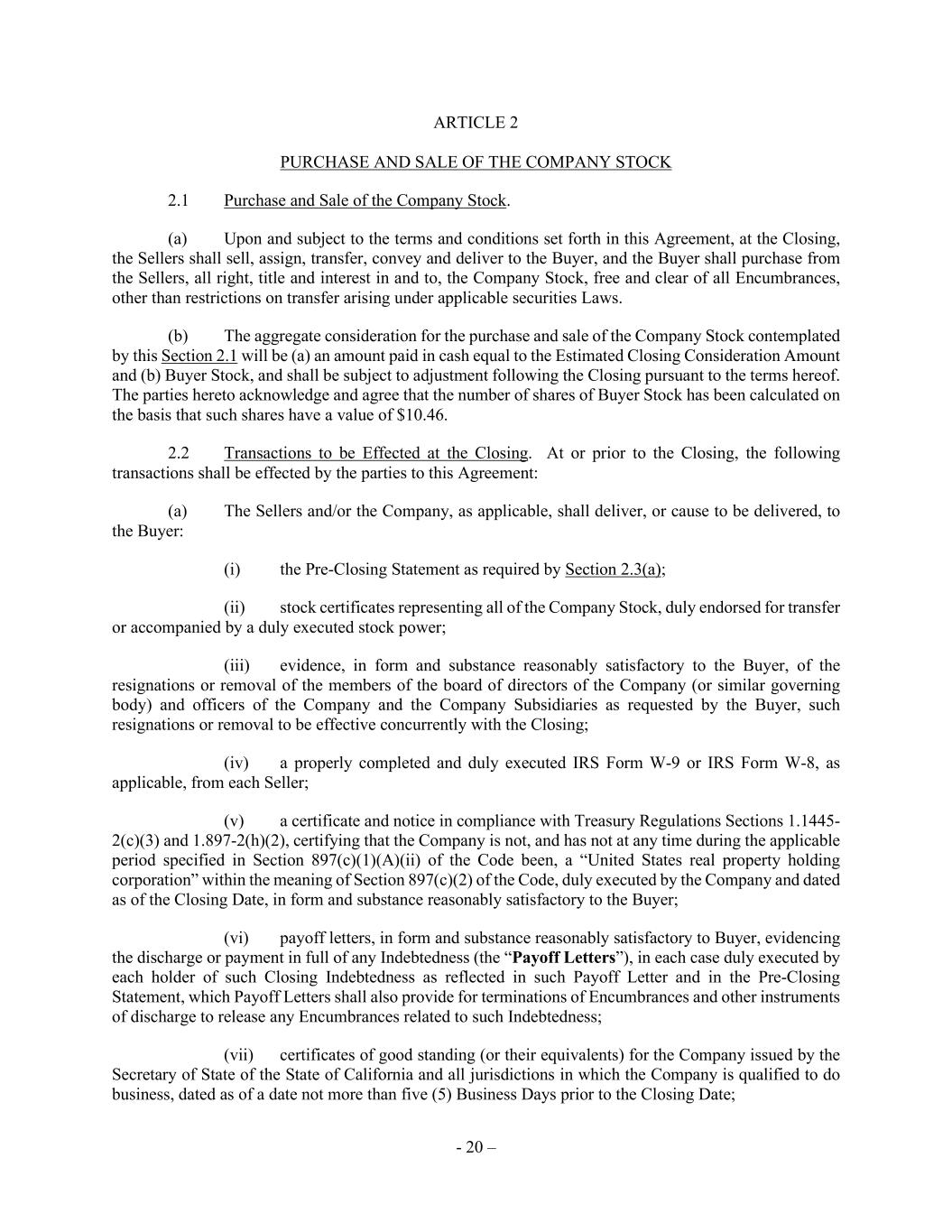 - 20 – ARTICLE 2 PURCHASE AND SALE OF THE COMPANY STOCK 2.1 Purchase and Sale of the Company Stock. (a) Upon and subject to the terms and conditions set forth in this Agreement, at the Closing, the Sellers shall sell, assign, transfer, convey and deliver to the Buyer, and the Buyer shall purchase from the Sellers, all right, title and interest in and to, the Company Stock, free and clear of all Encumbrances, other than restrictions on transfer arising under applicable securities Laws. (b) The aggregate consideration for the purchase and sale of the Company Stock contemplated by this Section 2.1 will be (a) an amount paid in cash equal to the Estimated Closing Consideration Amount and (b) Buyer Stock, and shall be subject to adjustment following the Closing pursuant to the terms hereof. The parties hereto acknowledge and agree that the number of shares of Buyer Stock has been calculated on the basis that such shares have a value of $10.46. 2.2 Transactions to be Effected at the Closing. At or prior to the Closing, the following transactions shall be effected by the parties to this Agreement: (a) The Sellers and/or the Company, as applicable, shall deliver, or cause to be delivered, to the Buyer: (i) the Pre-Closing Statement as required by Section 2.3(a); (ii) stock certificates representing all of the Company Stock, duly endorsed for transfer or accompanied by a duly executed stock power; (iii) evidence, in form and substance reasonably satisfactory to the Buyer, of the resignations or removal of the members of the board of directors of the Company (or similar governing body) and officers of the Company and the Company Subsidiaries as requested by the Buyer, such resignations or removal to be effective concurrently with the Closing; (iv) a properly completed and duly executed IRS Form W-9 or IRS Form W-8, as applicable, from each Seller; (v) a certificate and notice in compliance with Treasury Regulations Sections 1.1445- 2(c)(3) and 1.897-2(h)(2), certifying that the Company is not, and has not at any time during the applicable period specified in Section 897(c)(1)(A)(ii) of the Code been, a “United States real property holding corporation” within the meaning of Section 897(c)(2) of the Code, duly executed by the Company and dated as of the Closing Date, in form and substance reasonably satisfactory to the Buyer; (vi) payoff letters, in form and substance reasonably satisfactory to Buyer, evidencing the discharge or payment in full of any Indebtedness (the “Payoff Letters”), in each case duly executed by each holder of such Closing Indebtedness as reflected in such Payoff Letter and in the Pre-Closing Statement, which Payoff Letters shall also provide for terminations of Encumbrances and other instruments of discharge to release any Encumbrances related to such Indebtedness; (vii) certificates of good standing (or their equivalents) for the Company issued by the Secretary of State of the State of California and all jurisdictions in which the Company is qualified to do business, dated as of a date not more than five (5) Business Days prior to the Closing Date;