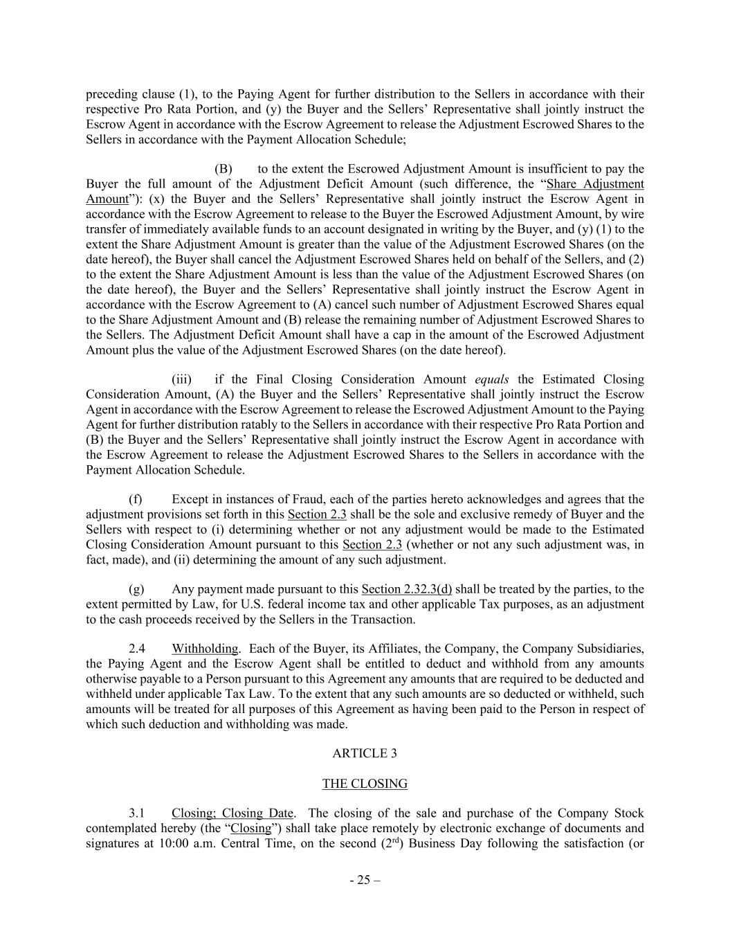 - 25 – preceding clause (1), to the Paying Agent for further distribution to the Sellers in accordance with their respective Pro Rata Portion, and (y) the Buyer and the Sellers’ Representative shall jointly instruct the Escrow Agent in accordance with the Escrow Agreement to release the Adjustment Escrowed Shares to the Sellers in accordance with the Payment Allocation Schedule; (B) to the extent the Escrowed Adjustment Amount is insufficient to pay the Buyer the full amount of the Adjustment Deficit Amount (such difference, the “Share Adjustment Amount”): (x) the Buyer and the Sellers’ Representative shall jointly instruct the Escrow Agent in accordance with the Escrow Agreement to release to the Buyer the Escrowed Adjustment Amount, by wire transfer of immediately available funds to an account designated in writing by the Buyer, and (y) (1) to the extent the Share Adjustment Amount is greater than the value of the Adjustment Escrowed Shares (on the date hereof), the Buyer shall cancel the Adjustment Escrowed Shares held on behalf of the Sellers, and (2) to the extent the Share Adjustment Amount is less than the value of the Adjustment Escrowed Shares (on the date hereof), the Buyer and the Sellers’ Representative shall jointly instruct the Escrow Agent in accordance with the Escrow Agreement to (A) cancel such number of Adjustment Escrowed Shares equal to the Share Adjustment Amount and (B) release the remaining number of Adjustment Escrowed Shares to the Sellers. The Adjustment Deficit Amount shall have a cap in the amount of the Escrowed Adjustment Amount plus the value of the Adjustment Escrowed Shares (on the date hereof). (iii) if the Final Closing Consideration Amount equals the Estimated Closing Consideration Amount, (A) the Buyer and the Sellers’ Representative shall jointly instruct the Escrow Agent in accordance with the Escrow Agreement to release the Escrowed Adjustment Amount to the Paying Agent for further distribution ratably to the Sellers in accordance with their respective Pro Rata Portion and (B) the Buyer and the Sellers’ Representative shall jointly instruct the Escrow Agent in accordance with the Escrow Agreement to release the Adjustment Escrowed Shares to the Sellers in accordance with the Payment Allocation Schedule. (f) Except in instances of Fraud, each of the parties hereto acknowledges and agrees that the adjustment provisions set forth in this Section 2.3 shall be the sole and exclusive remedy of Buyer and the Sellers with respect to (i) determining whether or not any adjustment would be made to the Estimated Closing Consideration Amount pursuant to this Section 2.3 (whether or not any such adjustment was, in fact, made), and (ii) determining the amount of any such adjustment. (g) Any payment made pursuant to this Section 2.32.3(d) shall be treated by the parties, to the extent permitted by Law, for U.S. federal income tax and other applicable Tax purposes, as an adjustment to the cash proceeds received by the Sellers in the Transaction. 2.4 Withholding. Each of the Buyer, its Affiliates, the Company, the Company Subsidiaries, the Paying Agent and the Escrow Agent shall be entitled to deduct and withhold from any amounts otherwise payable to a Person pursuant to this Agreement any amounts that are required to be deducted and withheld under applicable Tax Law. To the extent that any such amounts are so deducted or withheld, such amounts will be treated for all purposes of this Agreement as having been paid to the Person in respect of which such deduction and withholding was made. ARTICLE 3 THE CLOSING 3.1 Closing; Closing Date. The closing of the sale and purchase of the Company Stock contemplated hereby (the “Closing”) shall take place remotely by electronic exchange of documents and signatures at 10:00 a.m. Central Time, on the second (2rd) Business Day following the satisfaction (or