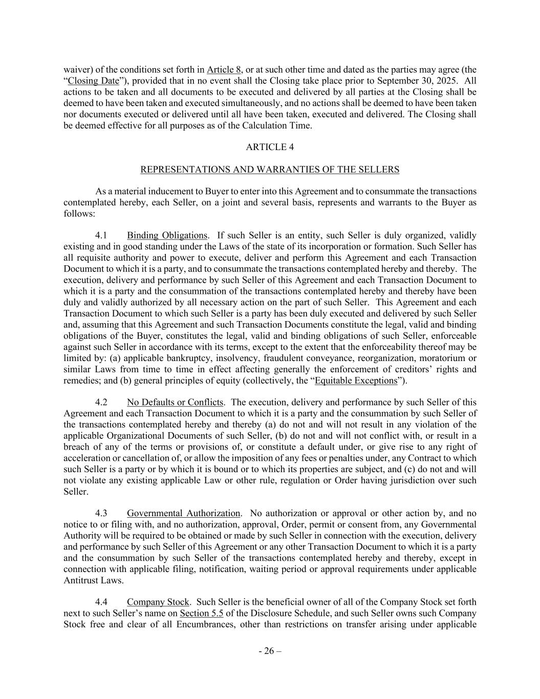 - 26 – waiver) of the conditions set forth in Article 8, or at such other time and dated as the parties may agree (the “Closing Date”), provided that in no event shall the Closing take place prior to September 30, 2025. All actions to be taken and all documents to be executed and delivered by all parties at the Closing shall be deemed to have been taken and executed simultaneously, and no actions shall be deemed to have been taken nor documents executed or delivered until all have been taken, executed and delivered. The Closing shall be deemed effective for all purposes as of the Calculation Time. ARTICLE 4 REPRESENTATIONS AND WARRANTIES OF THE SELLERS As a material inducement to Buyer to enter into this Agreement and to consummate the transactions contemplated hereby, each Seller, on a joint and several basis, represents and warrants to the Buyer as follows: 4.1 Binding Obligations. If such Seller is an entity, such Seller is duly organized, validly existing and in good standing under the Laws of the state of its incorporation or formation. Such Seller has all requisite authority and power to execute, deliver and perform this Agreement and each Transaction Document to which it is a party, and to consummate the transactions contemplated hereby and thereby. The execution, delivery and performance by such Seller of this Agreement and each Transaction Document to which it is a party and the consummation of the transactions contemplated hereby and thereby have been duly and validly authorized by all necessary action on the part of such Seller. This Agreement and each Transaction Document to which such Seller is a party has been duly executed and delivered by such Seller and, assuming that this Agreement and such Transaction Documents constitute the legal, valid and binding obligations of the Buyer, constitutes the legal, valid and binding obligations of such Seller, enforceable against such Seller in accordance with its terms, except to the extent that the enforceability thereof may be limited by: (a) applicable bankruptcy, insolvency, fraudulent conveyance, reorganization, moratorium or similar Laws from time to time in effect affecting generally the enforcement of creditors’ rights and remedies; and (b) general principles of equity (collectively, the “Equitable Exceptions”). 4.2 No Defaults or Conflicts. The execution, delivery and performance by such Seller of this Agreement and each Transaction Document to which it is a party and the consummation by such Seller of the transactions contemplated hereby and thereby (a) do not and will not result in any violation of the applicable Organizational Documents of such Seller, (b) do not and will not conflict with, or result in a breach of any of the terms or provisions of, or constitute a default under, or give rise to any right of acceleration or cancellation of, or allow the imposition of any fees or penalties under, any Contract to which such Seller is a party or by which it is bound or to which its properties are subject, and (c) do not and will not violate any existing applicable Law or other rule, regulation or Order having jurisdiction over such Seller. 4.3 Governmental Authorization. No authorization or approval or other action by, and no notice to or filing with, and no authorization, approval, Order, permit or consent from, any Governmental Authority will be required to be obtained or made by such Seller in connection with the execution, delivery and performance by such Seller of this Agreement or any other Transaction Document to which it is a party and the consummation by such Seller of the transactions contemplated hereby and thereby, except in connection with applicable filing, notification, waiting period or approval requirements under applicable Antitrust Laws. 4.4 Company Stock. Such Seller is the beneficial owner of all of the Company Stock set forth next to such Seller’s name on Section 5.5 of the Disclosure Schedule, and such Seller owns such Company Stock free and clear of all Encumbrances, other than restrictions on transfer arising under applicable