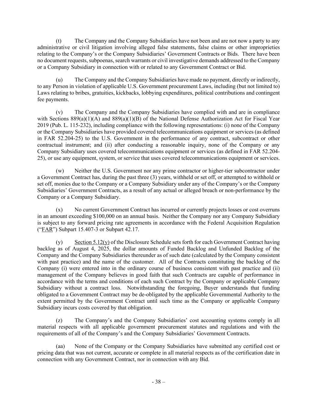 - 38 – (t) The Company and the Company Subsidiaries have not been and are not now a party to any administrative or civil litigation involving alleged false statements, false claims or other improprieties relating to the Company’s or the Company Subsidiaries’ Government Contracts or Bids. There have been no document requests, subpoenas, search warrants or civil investigative demands addressed to the Company or a Company Subsidiary in connection with or related to any Government Contract or Bid. (u) The Company and the Company Subsidiaries have made no payment, directly or indirectly, to any Person in violation of applicable U.S. Government procurement Laws, including (but not limited to) Laws relating to bribes, gratuities, kickbacks, lobbying expenditures, political contributions and contingent fee payments. (v) The Company and the Company Subsidiaries have complied with and are in compliance with Sections 889(a)(1)(A) and 889(a)(1)(B) of the National Defense Authorization Act for Fiscal Year 2019 (Pub. L. 115-232), including compliance with the following representations: (i) none of the Company or the Company Subsidiaries have provided covered telecommunications equipment or services (as defined in FAR 52.204-25) to the U.S. Government in the performance of any contract, subcontract or other contractual instrument; and (ii) after conducting a reasonable inquiry, none of the Company or any Company Subsidiary uses covered telecommunications equipment or services (as defined in FAR 52.204- 25), or use any equipment, system, or service that uses covered telecommunications equipment or services. (w) Neither the U.S. Government nor any prime contractor or higher-tier subcontractor under a Government Contract has, during the past three (3) years, withheld or set off, or attempted to withhold or set off, monies due to the Company or a Company Subsidiary under any of the Company’s or the Company Subsidiaries’ Government Contracts, as a result of any actual or alleged breach or non-performance by the Company or a Company Subsidiary. (x) No current Government Contract has incurred or currently projects losses or cost overruns in an amount exceeding $100,000 on an annual basis. Neither the Company nor any Company Subsidiary is subject to any forward pricing rate agreements in accordance with the Federal Acquisition Regulation (“FAR”) Subpart 15.407-3 or Subpart 42.17. (y) Section 5.12(y) of the Disclosure Schedule sets forth for each Government Contract having backlog as of August 4, 2025, the dollar amounts of Funded Backlog and Unfunded Backlog of the Company and the Company Subsidiaries thereunder as of such date (calculated by the Company consistent with past practice) and the name of the customer. All of the Contracts constituting the backlog of the Company (i) were entered into in the ordinary course of business consistent with past practice and (ii) management of the Company believes in good faith that such Contracts are capable of performance in accordance with the terms and conditions of each such Contract by the Company or applicable Company Subsidiary without a contract loss. Notwithstanding the foregoing, Buyer understands that funding obligated to a Government Contract may be de-obligated by the applicable Governmental Authority to the extent permitted by the Government Contract until such time as the Company or applicable Company Subsidiary incurs costs covered by that obligation. (z) The Company’s and the Company Subsidiaries’ cost accounting systems comply in all material respects with all applicable government procurement statutes and regulations and with the requirements of all of the Company’s and the Company Subsidiaries’ Government Contracts. (aa) None of the Company or the Company Subsidiaries have submitted any certified cost or pricing data that was not current, accurate or complete in all material respects as of the certification date in connection with any Government Contract, nor in connection with any Bid.