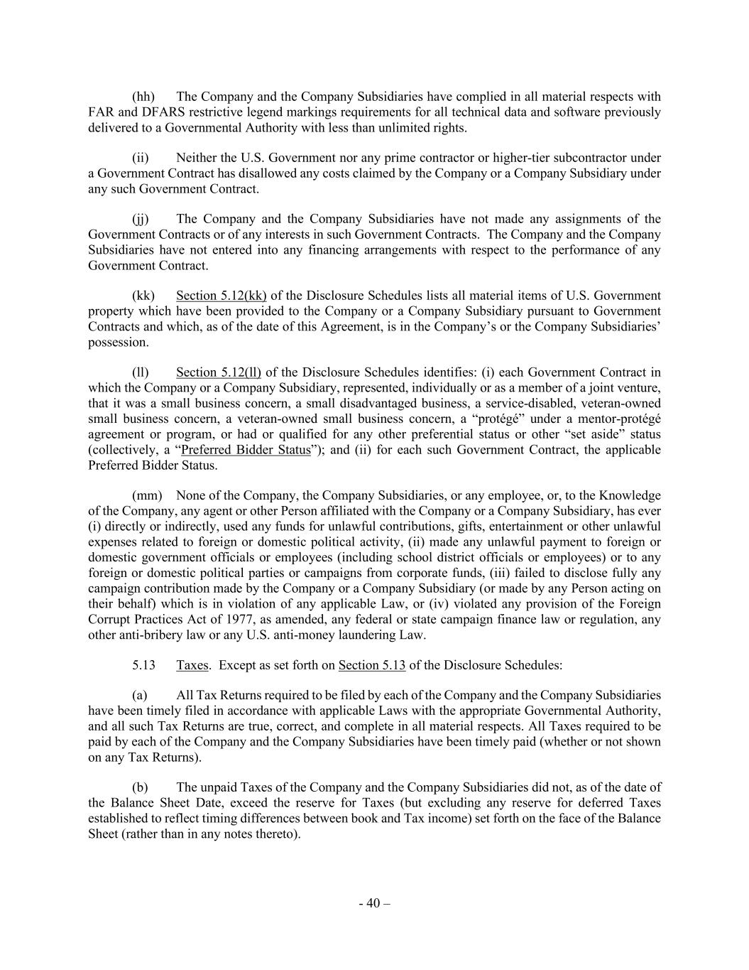 - 40 – (hh) The Company and the Company Subsidiaries have complied in all material respects with FAR and DFARS restrictive legend markings requirements for all technical data and software previously delivered to a Governmental Authority with less than unlimited rights. (ii) Neither the U.S. Government nor any prime contractor or higher-tier subcontractor under a Government Contract has disallowed any costs claimed by the Company or a Company Subsidiary under any such Government Contract. (jj) The Company and the Company Subsidiaries have not made any assignments of the Government Contracts or of any interests in such Government Contracts. The Company and the Company Subsidiaries have not entered into any financing arrangements with respect to the performance of any Government Contract. (kk) Section 5.12(kk) of the Disclosure Schedules lists all material items of U.S. Government property which have been provided to the Company or a Company Subsidiary pursuant to Government Contracts and which, as of the date of this Agreement, is in the Company’s or the Company Subsidiaries’ possession. (ll) Section 5.12(ll) of the Disclosure Schedules identifies: (i) each Government Contract in which the Company or a Company Subsidiary, represented, individually or as a member of a joint venture, that it was a small business concern, a small disadvantaged business, a service-disabled, veteran-owned small business concern, a veteran-owned small business concern, a “protégé” under a mentor-protégé agreement or program, or had or qualified for any other preferential status or other “set aside” status (collectively, a “Preferred Bidder Status”); and (ii) for each such Government Contract, the applicable Preferred Bidder Status. (mm) None of the Company, the Company Subsidiaries, or any employee, or, to the Knowledge of the Company, any agent or other Person affiliated with the Company or a Company Subsidiary, has ever (i) directly or indirectly, used any funds for unlawful contributions, gifts, entertainment or other unlawful expenses related to foreign or domestic political activity, (ii) made any unlawful payment to foreign or domestic government officials or employees (including school district officials or employees) or to any foreign or domestic political parties or campaigns from corporate funds, (iii) failed to disclose fully any campaign contribution made by the Company or a Company Subsidiary (or made by any Person acting on their behalf) which is in violation of any applicable Law, or (iv) violated any provision of the Foreign Corrupt Practices Act of 1977, as amended, any federal or state campaign finance law or regulation, any other anti-bribery law or any U.S. anti-money laundering Law. 5.13 Taxes. Except as set forth on Section 5.13 of the Disclosure Schedules: (a) All Tax Returns required to be filed by each of the Company and the Company Subsidiaries have been timely filed in accordance with applicable Laws with the appropriate Governmental Authority, and all such Tax Returns are true, correct, and complete in all material respects. All Taxes required to be paid by each of the Company and the Company Subsidiaries have been timely paid (whether or not shown on any Tax Returns). (b) The unpaid Taxes of the Company and the Company Subsidiaries did not, as of the date of the Balance Sheet Date, exceed the reserve for Taxes (but excluding any reserve for deferred Taxes established to reflect timing differences between book and Tax income) set forth on the face of the Balance Sheet (rather than in any notes thereto).