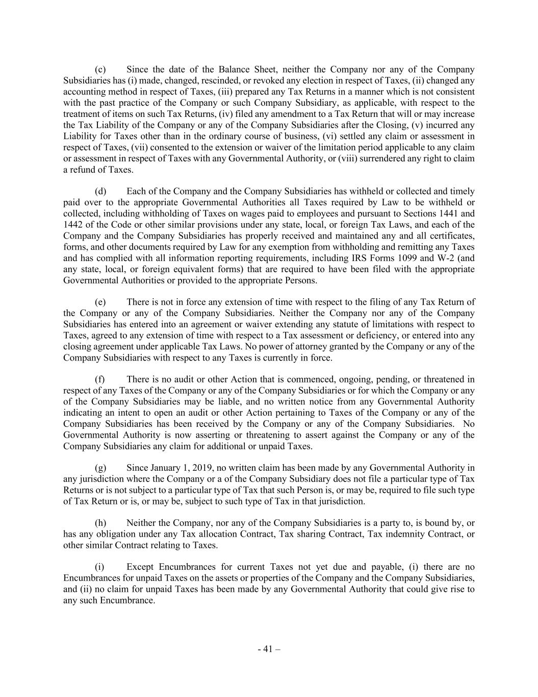 - 41 – (c) Since the date of the Balance Sheet, neither the Company nor any of the Company Subsidiaries has (i) made, changed, rescinded, or revoked any election in respect of Taxes, (ii) changed any accounting method in respect of Taxes, (iii) prepared any Tax Returns in a manner which is not consistent with the past practice of the Company or such Company Subsidiary, as applicable, with respect to the treatment of items on such Tax Returns, (iv) filed any amendment to a Tax Return that will or may increase the Tax Liability of the Company or any of the Company Subsidiaries after the Closing, (v) incurred any Liability for Taxes other than in the ordinary course of business, (vi) settled any claim or assessment in respect of Taxes, (vii) consented to the extension or waiver of the limitation period applicable to any claim or assessment in respect of Taxes with any Governmental Authority, or (viii) surrendered any right to claim a refund of Taxes. (d) Each of the Company and the Company Subsidiaries has withheld or collected and timely paid over to the appropriate Governmental Authorities all Taxes required by Law to be withheld or collected, including withholding of Taxes on wages paid to employees and pursuant to Sections 1441 and 1442 of the Code or other similar provisions under any state, local, or foreign Tax Laws, and each of the Company and the Company Subsidiaries has properly received and maintained any and all certificates, forms, and other documents required by Law for any exemption from withholding and remitting any Taxes and has complied with all information reporting requirements, including IRS Forms 1099 and W-2 (and any state, local, or foreign equivalent forms) that are required to have been filed with the appropriate Governmental Authorities or provided to the appropriate Persons. (e) There is not in force any extension of time with respect to the filing of any Tax Return of the Company or any of the Company Subsidiaries. Neither the Company nor any of the Company Subsidiaries has entered into an agreement or waiver extending any statute of limitations with respect to Taxes, agreed to any extension of time with respect to a Tax assessment or deficiency, or entered into any closing agreement under applicable Tax Laws. No power of attorney granted by the Company or any of the Company Subsidiaries with respect to any Taxes is currently in force. (f) There is no audit or other Action that is commenced, ongoing, pending, or threatened in respect of any Taxes of the Company or any of the Company Subsidiaries or for which the Company or any of the Company Subsidiaries may be liable, and no written notice from any Governmental Authority indicating an intent to open an audit or other Action pertaining to Taxes of the Company or any of the Company Subsidiaries has been received by the Company or any of the Company Subsidiaries. No Governmental Authority is now asserting or threatening to assert against the Company or any of the Company Subsidiaries any claim for additional or unpaid Taxes. (g) Since January 1, 2019, no written claim has been made by any Governmental Authority in any jurisdiction where the Company or a of the Company Subsidiary does not file a particular type of Tax Returns or is not subject to a particular type of Tax that such Person is, or may be, required to file such type of Tax Return or is, or may be, subject to such type of Tax in that jurisdiction. (h) Neither the Company, nor any of the Company Subsidiaries is a party to, is bound by, or has any obligation under any Tax allocation Contract, Tax sharing Contract, Tax indemnity Contract, or other similar Contract relating to Taxes. (i) Except Encumbrances for current Taxes not yet due and payable, (i) there are no Encumbrances for unpaid Taxes on the assets or properties of the Company and the Company Subsidiaries, and (ii) no claim for unpaid Taxes has been made by any Governmental Authority that could give rise to any such Encumbrance.