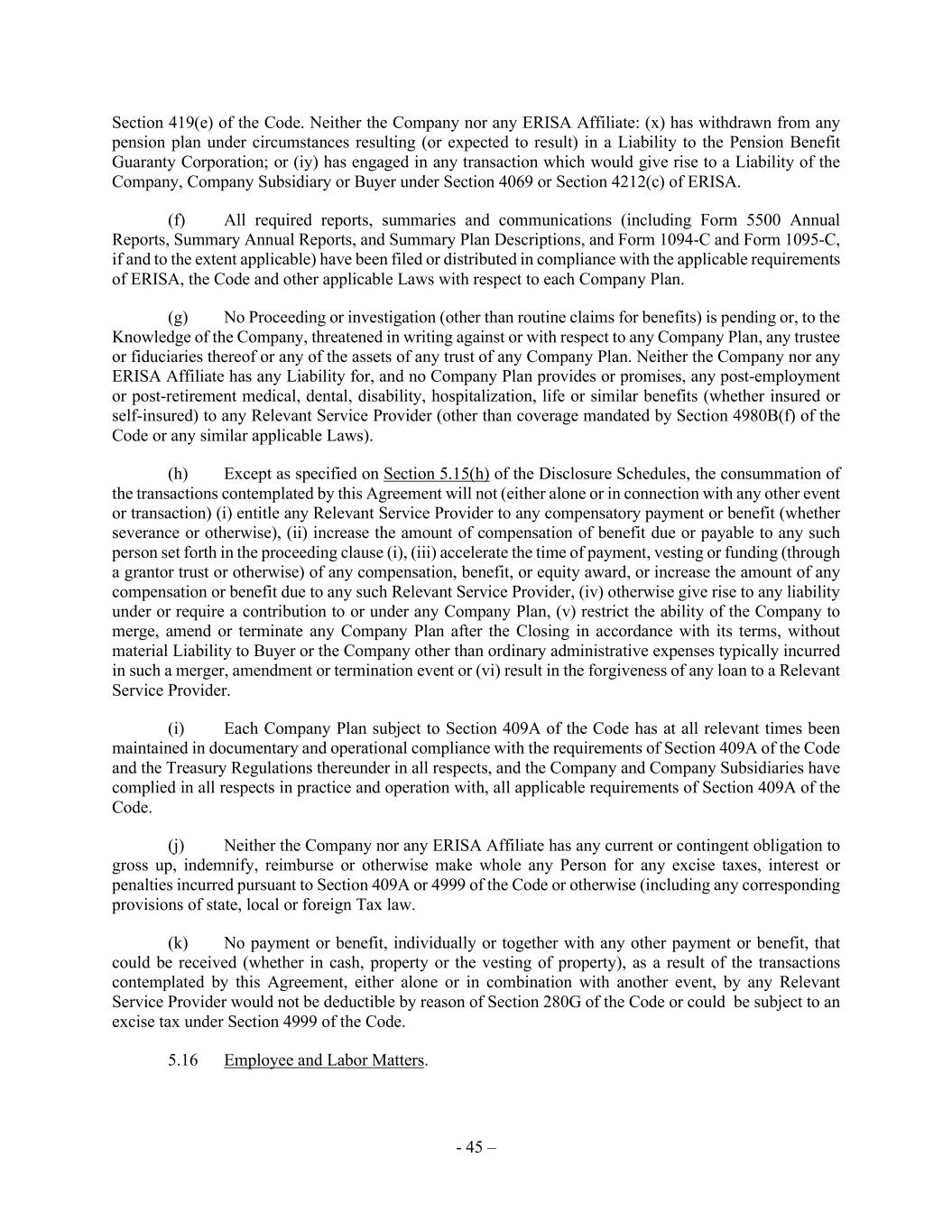- 45 – Section 419(e) of the Code. Neither the Company nor any ERISA Affiliate: (x) has withdrawn from any pension plan under circumstances resulting (or expected to result) in a Liability to the Pension Benefit Guaranty Corporation; or (iy) has engaged in any transaction which would give rise to a Liability of the Company, Company Subsidiary or Buyer under Section 4069 or Section 4212(c) of ERISA. (f) All required reports, summaries and communications (including Form 5500 Annual Reports, Summary Annual Reports, and Summary Plan Descriptions, and Form 1094-C and Form 1095-C, if and to the extent applicable) have been filed or distributed in compliance with the applicable requirements of ERISA, the Code and other applicable Laws with respect to each Company Plan. (g) No Proceeding or investigation (other than routine claims for benefits) is pending or, to the Knowledge of the Company, threatened in writing against or with respect to any Company Plan, any trustee or fiduciaries thereof or any of the assets of any trust of any Company Plan. Neither the Company nor any ERISA Affiliate has any Liability for, and no Company Plan provides or promises, any post-employment or post-retirement medical, dental, disability, hospitalization, life or similar benefits (whether insured or self-insured) to any Relevant Service Provider (other than coverage mandated by Section 4980B(f) of the Code or any similar applicable Laws). (h) Except as specified on Section 5.15(h) of the Disclosure Schedules, the consummation of the transactions contemplated by this Agreement will not (either alone or in connection with any other event or transaction) (i) entitle any Relevant Service Provider to any compensatory payment or benefit (whether severance or otherwise), (ii) increase the amount of compensation of benefit due or payable to any such person set forth in the proceeding clause (i), (iii) accelerate the time of payment, vesting or funding (through a grantor trust or otherwise) of any compensation, benefit, or equity award, or increase the amount of any compensation or benefit due to any such Relevant Service Provider, (iv) otherwise give rise to any liability under or require a contribution to or under any Company Plan, (v) restrict the ability of the Company to merge, amend or terminate any Company Plan after the Closing in accordance with its terms, without material Liability to Buyer or the Company other than ordinary administrative expenses typically incurred in such a merger, amendment or termination event or (vi) result in the forgiveness of any loan to a Relevant Service Provider. (i) Each Company Plan subject to Section 409A of the Code has at all relevant times been maintained in documentary and operational compliance with the requirements of Section 409A of the Code and the Treasury Regulations thereunder in all respects, and the Company and Company Subsidiaries have complied in all respects in practice and operation with, all applicable requirements of Section 409A of the Code. (j) Neither the Company nor any ERISA Affiliate has any current or contingent obligation to gross up, indemnify, reimburse or otherwise make whole any Person for any excise taxes, interest or penalties incurred pursuant to Section 409A or 4999 of the Code or otherwise (including any corresponding provisions of state, local or foreign Tax law. (k) No payment or benefit, individually or together with any other payment or benefit, that could be received (whether in cash, property or the vesting of property), as a result of the transactions contemplated by this Agreement, either alone or in combination with another event, by any Relevant Service Provider would not be deductible by reason of Section 280G of the Code or could be subject to an excise tax under Section 4999 of the Code. 5.16 Employee and Labor Matters.