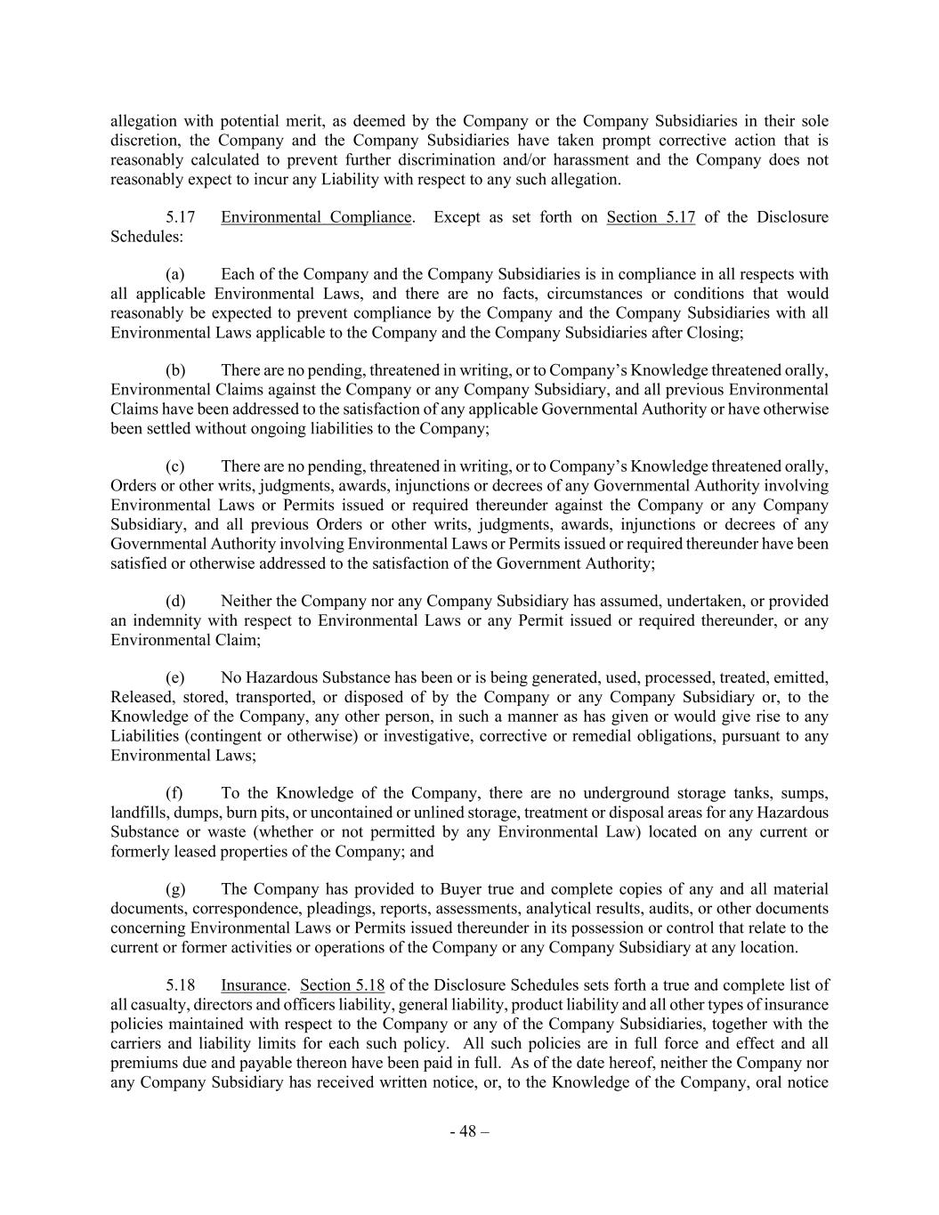 - 48 – allegation with potential merit, as deemed by the Company or the Company Subsidiaries in their sole discretion, the Company and the Company Subsidiaries have taken prompt corrective action that is reasonably calculated to prevent further discrimination and/or harassment and the Company does not reasonably expect to incur any Liability with respect to any such allegation. 5.17 Environmental Compliance. Except as set forth on Section 5.17 of the Disclosure Schedules: (a) Each of the Company and the Company Subsidiaries is in compliance in all respects with all applicable Environmental Laws, and there are no facts, circumstances or conditions that would reasonably be expected to prevent compliance by the Company and the Company Subsidiaries with all Environmental Laws applicable to the Company and the Company Subsidiaries after Closing; (b) There are no pending, threatened in writing, or to Company’s Knowledge threatened orally, Environmental Claims against the Company or any Company Subsidiary, and all previous Environmental Claims have been addressed to the satisfaction of any applicable Governmental Authority or have otherwise been settled without ongoing liabilities to the Company; (c) There are no pending, threatened in writing, or to Company’s Knowledge threatened orally, Orders or other writs, judgments, awards, injunctions or decrees of any Governmental Authority involving Environmental Laws or Permits issued or required thereunder against the Company or any Company Subsidiary, and all previous Orders or other writs, judgments, awards, injunctions or decrees of any Governmental Authority involving Environmental Laws or Permits issued or required thereunder have been satisfied or otherwise addressed to the satisfaction of the Government Authority; (d) Neither the Company nor any Company Subsidiary has assumed, undertaken, or provided an indemnity with respect to Environmental Laws or any Permit issued or required thereunder, or any Environmental Claim; (e) No Hazardous Substance has been or is being generated, used, processed, treated, emitted, Released, stored, transported, or disposed of by the Company or any Company Subsidiary or, to the Knowledge of the Company, any other person, in such a manner as has given or would give rise to any Liabilities (contingent or otherwise) or investigative, corrective or remedial obligations, pursuant to any Environmental Laws; (f) To the Knowledge of the Company, there are no underground storage tanks, sumps, landfills, dumps, burn pits, or uncontained or unlined storage, treatment or disposal areas for any Hazardous Substance or waste (whether or not permitted by any Environmental Law) located on any current or formerly leased properties of the Company; and (g) The Company has provided to Buyer true and complete copies of any and all material documents, correspondence, pleadings, reports, assessments, analytical results, audits, or other documents concerning Environmental Laws or Permits issued thereunder in its possession or control that relate to the current or former activities or operations of the Company or any Company Subsidiary at any location. 5.18 Insurance. Section 5.18 of the Disclosure Schedules sets forth a true and complete list of all casualty, directors and officers liability, general liability, product liability and all other types of insurance policies maintained with respect to the Company or any of the Company Subsidiaries, together with the carriers and liability limits for each such policy. All such policies are in full force and effect and all premiums due and payable thereon have been paid in full. As of the date hereof, neither the Company nor any Company Subsidiary has received written notice, or, to the Knowledge of the Company, oral notice