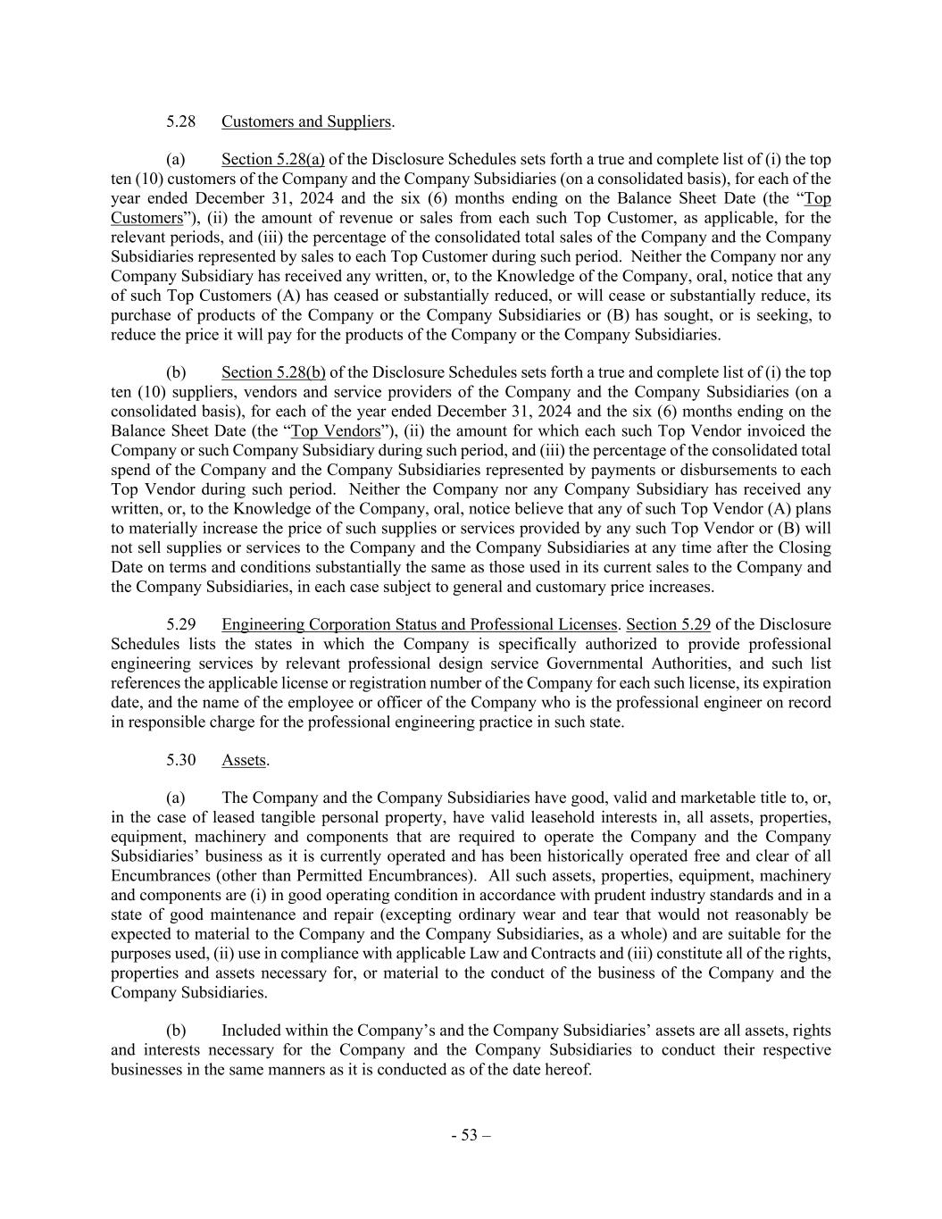 - 53 – 5.28 Customers and Suppliers. (a) Section 5.28(a) of the Disclosure Schedules sets forth a true and complete list of (i) the top ten (10) customers of the Company and the Company Subsidiaries (on a consolidated basis), for each of the year ended December 31, 2024 and the six (6) months ending on the Balance Sheet Date (the “Top Customers”), (ii) the amount of revenue or sales from each such Top Customer, as applicable, for the relevant periods, and (iii) the percentage of the consolidated total sales of the Company and the Company Subsidiaries represented by sales to each Top Customer during such period. Neither the Company nor any Company Subsidiary has received any written, or, to the Knowledge of the Company, oral, notice that any of such Top Customers (A) has ceased or substantially reduced, or will cease or substantially reduce, its purchase of products of the Company or the Company Subsidiaries or (B) has sought, or is seeking, to reduce the price it will pay for the products of the Company or the Company Subsidiaries. (b) Section 5.28(b) of the Disclosure Schedules sets forth a true and complete list of (i) the top ten (10) suppliers, vendors and service providers of the Company and the Company Subsidiaries (on a consolidated basis), for each of the year ended December 31, 2024 and the six (6) months ending on the Balance Sheet Date (the “Top Vendors”), (ii) the amount for which each such Top Vendor invoiced the Company or such Company Subsidiary during such period, and (iii) the percentage of the consolidated total spend of the Company and the Company Subsidiaries represented by payments or disbursements to each Top Vendor during such period. Neither the Company nor any Company Subsidiary has received any written, or, to the Knowledge of the Company, oral, notice believe that any of such Top Vendor (A) plans to materially increase the price of such supplies or services provided by any such Top Vendor or (B) will not sell supplies or services to the Company and the Company Subsidiaries at any time after the Closing Date on terms and conditions substantially the same as those used in its current sales to the Company and the Company Subsidiaries, in each case subject to general and customary price increases. 5.29 Engineering Corporation Status and Professional Licenses. Section 5.29 of the Disclosure Schedules lists the states in which the Company is specifically authorized to provide professional engineering services by relevant professional design service Governmental Authorities, and such list references the applicable license or registration number of the Company for each such license, its expiration date, and the name of the employee or officer of the Company who is the professional engineer on record in responsible charge for the professional engineering practice in such state. 5.30 Assets. (a) The Company and the Company Subsidiaries have good, valid and marketable title to, or, in the case of leased tangible personal property, have valid leasehold interests in, all assets, properties, equipment, machinery and components that are required to operate the Company and the Company Subsidiaries’ business as it is currently operated and has been historically operated free and clear of all Encumbrances (other than Permitted Encumbrances). All such assets, properties, equipment, machinery and components are (i) in good operating condition in accordance with prudent industry standards and in a state of good maintenance and repair (excepting ordinary wear and tear that would not reasonably be expected to material to the Company and the Company Subsidiaries, as a whole) and are suitable for the purposes used, (ii) use in compliance with applicable Law and Contracts and (iii) constitute all of the rights, properties and assets necessary for, or material to the conduct of the business of the Company and the Company Subsidiaries. (b) Included within the Company’s and the Company Subsidiaries’ assets are all assets, rights and interests necessary for the Company and the Company Subsidiaries to conduct their respective businesses in the same manners as it is conducted as of the date hereof.