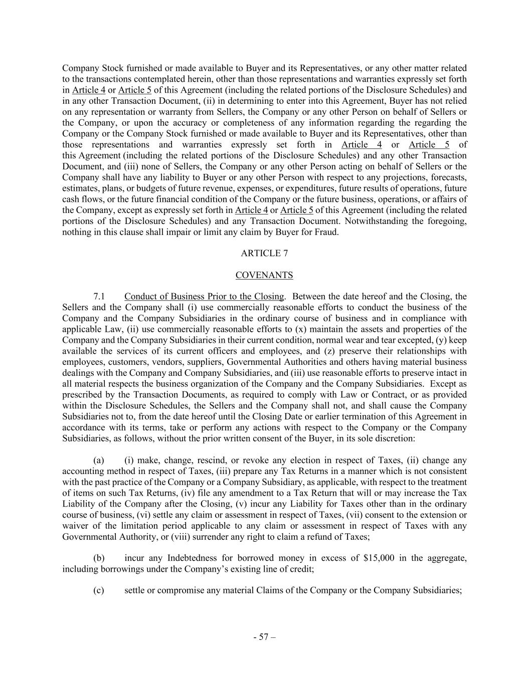 - 57 – Company Stock furnished or made available to Buyer and its Representatives, or any other matter related to the transactions contemplated herein, other than those representations and warranties expressly set forth in Article 4 or Article 5 of this Agreement (including the related portions of the Disclosure Schedules) and in any other Transaction Document, (ii) in determining to enter into this Agreement, Buyer has not relied on any representation or warranty from Sellers, the Company or any other Person on behalf of Sellers or the Company, or upon the accuracy or completeness of any information regarding the regarding the Company or the Company Stock furnished or made available to Buyer and its Representatives, other than those representations and warranties expressly set forth in Article 4 or Article 5 of this Agreement (including the related portions of the Disclosure Schedules) and any other Transaction Document, and (iii) none of Sellers, the Company or any other Person acting on behalf of Sellers or the Company shall have any liability to Buyer or any other Person with respect to any projections, forecasts, estimates, plans, or budgets of future revenue, expenses, or expenditures, future results of operations, future cash flows, or the future financial condition of the Company or the future business, operations, or affairs of the Company, except as expressly set forth in Article 4 or Article 5 of this Agreement (including the related portions of the Disclosure Schedules) and any Transaction Document. Notwithstanding the foregoing, nothing in this clause shall impair or limit any claim by Buyer for Fraud. ARTICLE 7 COVENANTS 7.1 Conduct of Business Prior to the Closing. Between the date hereof and the Closing, the Sellers and the Company shall (i) use commercially reasonable efforts to conduct the business of the Company and the Company Subsidiaries in the ordinary course of business and in compliance with applicable Law, (ii) use commercially reasonable efforts to (x) maintain the assets and properties of the Company and the Company Subsidiaries in their current condition, normal wear and tear excepted, (y) keep available the services of its current officers and employees, and (z) preserve their relationships with employees, customers, vendors, suppliers, Governmental Authorities and others having material business dealings with the Company and Company Subsidiaries, and (iii) use reasonable efforts to preserve intact in all material respects the business organization of the Company and the Company Subsidiaries. Except as prescribed by the Transaction Documents, as required to comply with Law or Contract, or as provided within the Disclosure Schedules, the Sellers and the Company shall not, and shall cause the Company Subsidiaries not to, from the date hereof until the Closing Date or earlier termination of this Agreement in accordance with its terms, take or perform any actions with respect to the Company or the Company Subsidiaries, as follows, without the prior written consent of the Buyer, in its sole discretion: (a) (i) make, change, rescind, or revoke any election in respect of Taxes, (ii) change any accounting method in respect of Taxes, (iii) prepare any Tax Returns in a manner which is not consistent with the past practice of the Company or a Company Subsidiary, as applicable, with respect to the treatment of items on such Tax Returns, (iv) file any amendment to a Tax Return that will or may increase the Tax Liability of the Company after the Closing, (v) incur any Liability for Taxes other than in the ordinary course of business, (vi) settle any claim or assessment in respect of Taxes, (vii) consent to the extension or waiver of the limitation period applicable to any claim or assessment in respect of Taxes with any Governmental Authority, or (viii) surrender any right to claim a refund of Taxes; (b) incur any Indebtedness for borrowed money in excess of $15,000 in the aggregate, including borrowings under the Company’s existing line of credit; (c) settle or compromise any material Claims of the Company or the Company Subsidiaries;
