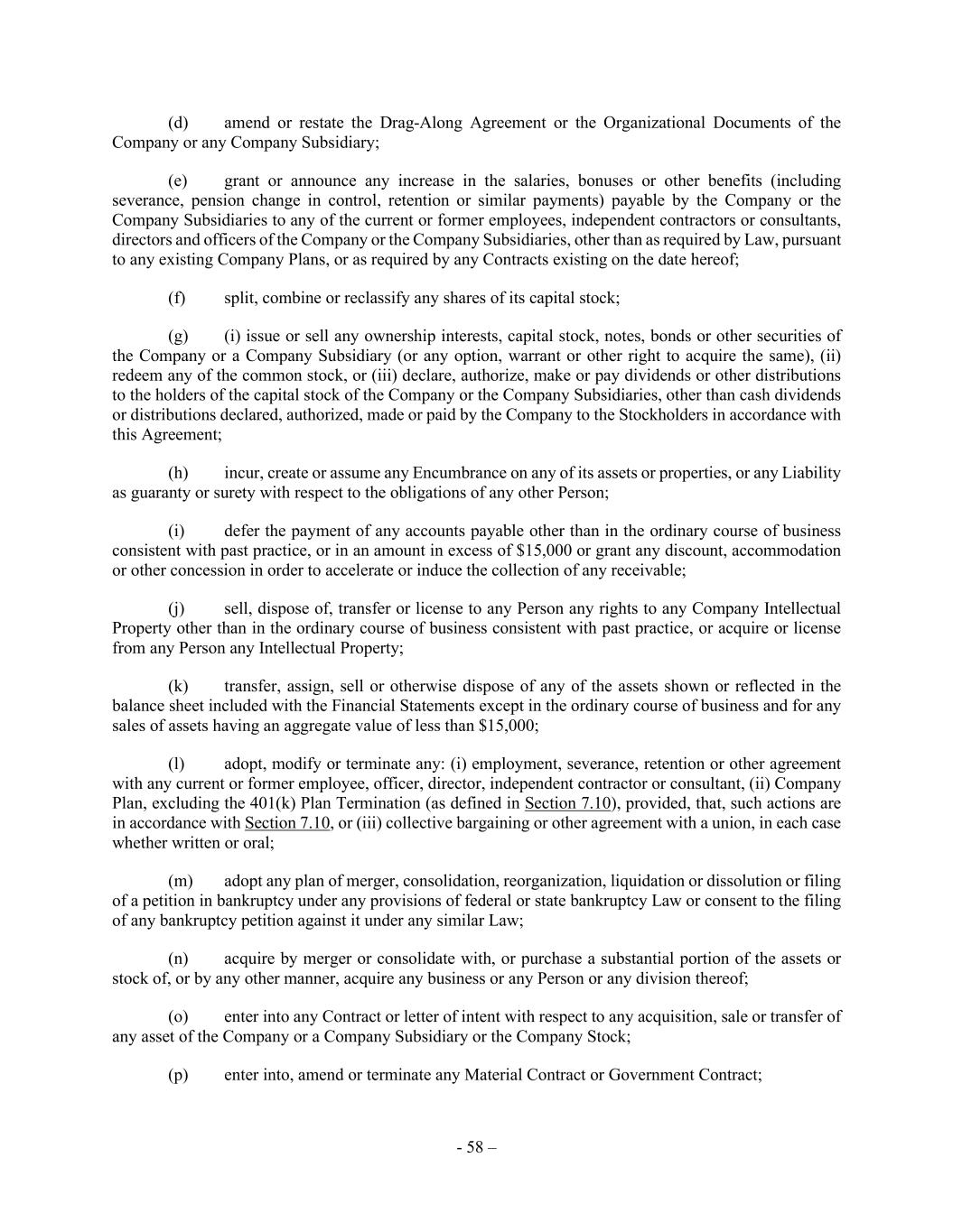 - 58 – (d) amend or restate the Drag-Along Agreement or the Organizational Documents of the Company or any Company Subsidiary; (e) grant or announce any increase in the salaries, bonuses or other benefits (including severance, pension change in control, retention or similar payments) payable by the Company or the Company Subsidiaries to any of the current or former employees, independent contractors or consultants, directors and officers of the Company or the Company Subsidiaries, other than as required by Law, pursuant to any existing Company Plans, or as required by any Contracts existing on the date hereof; (f) split, combine or reclassify any shares of its capital stock; (g) (i) issue or sell any ownership interests, capital stock, notes, bonds or other securities of the Company or a Company Subsidiary (or any option, warrant or other right to acquire the same), (ii) redeem any of the common stock, or (iii) declare, authorize, make or pay dividends or other distributions to the holders of the capital stock of the Company or the Company Subsidiaries, other than cash dividends or distributions declared, authorized, made or paid by the Company to the Stockholders in accordance with this Agreement; (h) incur, create or assume any Encumbrance on any of its assets or properties, or any Liability as guaranty or surety with respect to the obligations of any other Person; (i) defer the payment of any accounts payable other than in the ordinary course of business consistent with past practice, or in an amount in excess of $15,000 or grant any discount, accommodation or other concession in order to accelerate or induce the collection of any receivable; (j) sell, dispose of, transfer or license to any Person any rights to any Company Intellectual Property other than in the ordinary course of business consistent with past practice, or acquire or license from any Person any Intellectual Property; (k) transfer, assign, sell or otherwise dispose of any of the assets shown or reflected in the balance sheet included with the Financial Statements except in the ordinary course of business and for any sales of assets having an aggregate value of less than $15,000; (l) adopt, modify or terminate any: (i) employment, severance, retention or other agreement with any current or former employee, officer, director, independent contractor or consultant, (ii) Company Plan, excluding the 401(k) Plan Termination (as defined in Section 7.10), provided, that, such actions are in accordance with Section 7.10, or (iii) collective bargaining or other agreement with a union, in each case whether written or oral; (m) adopt any plan of merger, consolidation, reorganization, liquidation or dissolution or filing of a petition in bankruptcy under any provisions of federal or state bankruptcy Law or consent to the filing of any bankruptcy petition against it under any similar Law; (n) acquire by merger or consolidate with, or purchase a substantial portion of the assets or stock of, or by any other manner, acquire any business or any Person or any division thereof; (o) enter into any Contract or letter of intent with respect to any acquisition, sale or transfer of any asset of the Company or a Company Subsidiary or the Company Stock; (p) enter into, amend or terminate any Material Contract or Government Contract;