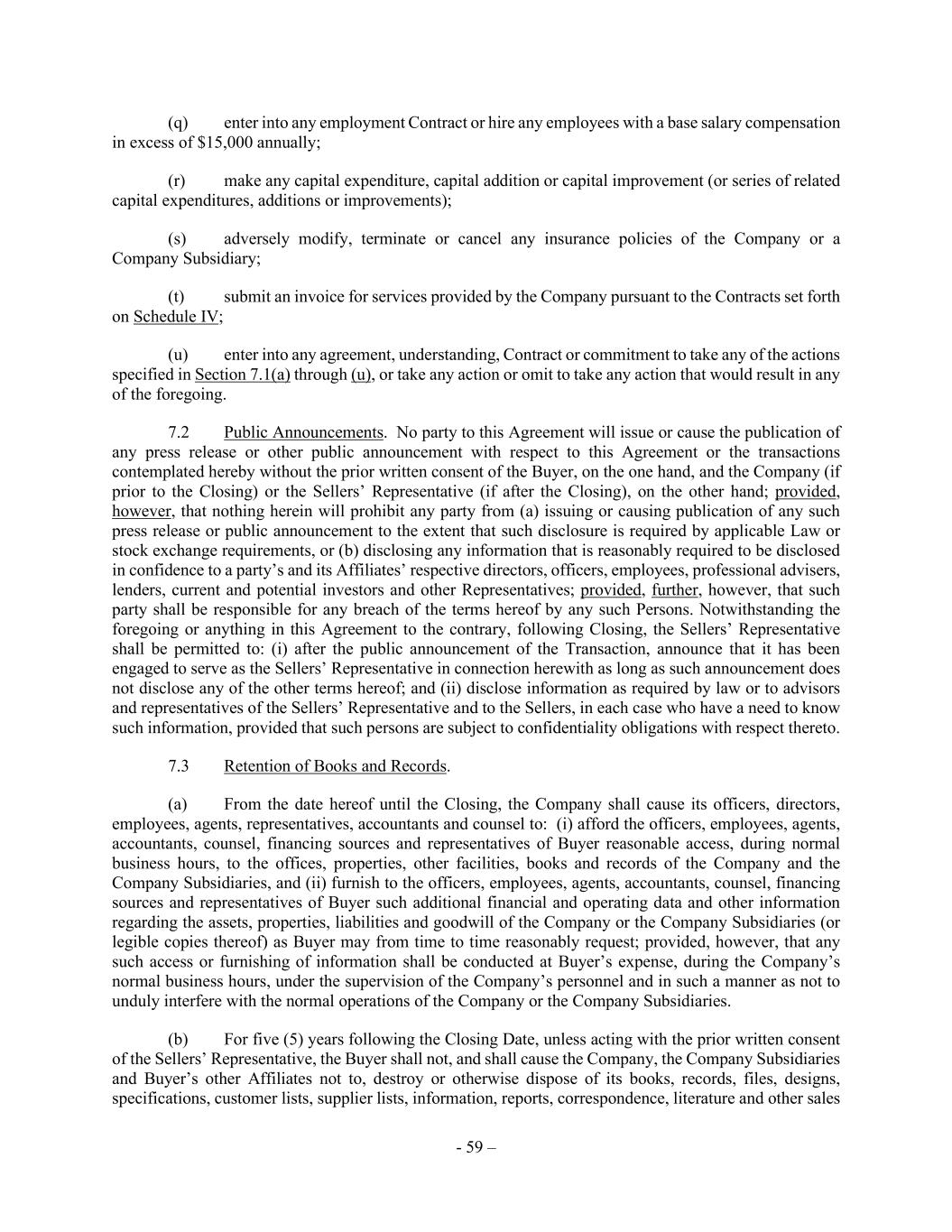 - 59 – (q) enter into any employment Contract or hire any employees with a base salary compensation in excess of $15,000 annually; (r) make any capital expenditure, capital addition or capital improvement (or series of related capital expenditures, additions or improvements); (s) adversely modify, terminate or cancel any insurance policies of the Company or a Company Subsidiary; (t) submit an invoice for services provided by the Company pursuant to the Contracts set forth on Schedule IV; (u) enter into any agreement, understanding, Contract or commitment to take any of the actions specified in Section 7.1(a) through (u), or take any action or omit to take any action that would result in any of the foregoing. 7.2 Public Announcements. No party to this Agreement will issue or cause the publication of any press release or other public announcement with respect to this Agreement or the transactions contemplated hereby without the prior written consent of the Buyer, on the one hand, and the Company (if prior to the Closing) or the Sellers’ Representative (if after the Closing), on the other hand; provided, however, that nothing herein will prohibit any party from (a) issuing or causing publication of any such press release or public announcement to the extent that such disclosure is required by applicable Law or stock exchange requirements, or (b) disclosing any information that is reasonably required to be disclosed in confidence to a party’s and its Affiliates’ respective directors, officers, employees, professional advisers, lenders, current and potential investors and other Representatives; provided, further, however, that such party shall be responsible for any breach of the terms hereof by any such Persons. Notwithstanding the foregoing or anything in this Agreement to the contrary, following Closing, the Sellers’ Representative shall be permitted to: (i) after the public announcement of the Transaction, announce that it has been engaged to serve as the Sellers’ Representative in connection herewith as long as such announcement does not disclose any of the other terms hereof; and (ii) disclose information as required by law or to advisors and representatives of the Sellers’ Representative and to the Sellers, in each case who have a need to know such information, provided that such persons are subject to confidentiality obligations with respect thereto. 7.3 Retention of Books and Records. (a) From the date hereof until the Closing, the Company shall cause its officers, directors, employees, agents, representatives, accountants and counsel to: (i) afford the officers, employees, agents, accountants, counsel, financing sources and representatives of Buyer reasonable access, during normal business hours, to the offices, properties, other facilities, books and records of the Company and the Company Subsidiaries, and (ii) furnish to the officers, employees, agents, accountants, counsel, financing sources and representatives of Buyer such additional financial and operating data and other information regarding the assets, properties, liabilities and goodwill of the Company or the Company Subsidiaries (or legible copies thereof) as Buyer may from time to time reasonably request; provided, however, that any such access or furnishing of information shall be conducted at Buyer’s expense, during the Company’s normal business hours, under the supervision of the Company’s personnel and in such a manner as not to unduly interfere with the normal operations of the Company or the Company Subsidiaries. (b) For five (5) years following the Closing Date, unless acting with the prior written consent of the Sellers’ Representative, the Buyer shall not, and shall cause the Company, the Company Subsidiaries and Buyer’s other Affiliates not to, destroy or otherwise dispose of its books, records, files, designs, specifications, customer lists, supplier lists, information, reports, correspondence, literature and other sales