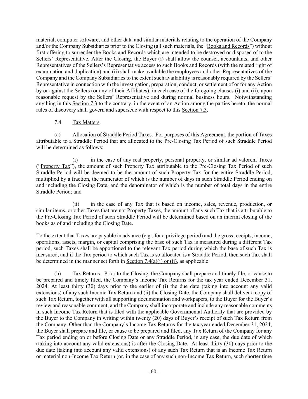- 60 – material, computer software, and other data and similar materials relating to the operation of the Company and/or the Company Subsidiaries prior to the Closing (all such materials, the “Books and Records”) without first offering to surrender the Books and Records which are intended to be destroyed or disposed of to the Sellers’ Representative. After the Closing, the Buyer (i) shall allow the counsel, accountants, and other Representatives of the Sellers’s Representative access to such Books and Records (with the related right of examination and duplication) and (ii) shall make available the employees and other Representatives of the Company and the Company Subsidiaries to the extent such availability is reasonably required by the Sellers’ Representative in connection with the investigation, preparation, conduct, or settlement of or for any Action by or against the Sellers (or any of their Affiliates), in each case of the foregoing clauses (i) and (ii), upon reasonable request by the Sellers’ Representative and during normal business hours. Notwithstanding anything in this Section 7.3 to the contrary, in the event of an Action among the parties hereto, the normal rules of discovery shall govern and supersede with respect to this Section 7.3. 7.4 Tax Matters. (a) Allocation of Straddle Period Taxes. For purposes of this Agreement, the portion of Taxes attributable to a Straddle Period that are allocated to the Pre-Closing Tax Period of such Straddle Period will be determined as follows: (i) in the case of any real property, personal property, or similar ad valorem Taxes (“Property Tax”), the amount of such Property Tax attributable to the Pre-Closing Tax Period of such Straddle Period will be deemed to be the amount of such Property Tax for the entire Straddle Period, multiplied by a fraction, the numerator of which is the number of days in such Straddle Period ending on and including the Closing Date, and the denominator of which is the number of total days in the entire Straddle Period; and (ii) in the case of any Tax that is based on income, sales, revenue, production, or similar items, or other Taxes that are not Property Taxes, the amount of any such Tax that is attributable to the Pre-Closing Tax Period of such Straddle Period will be determined based on an interim closing of the books as of and including the Closing Date. To the extent that Taxes are payable in advance (e.g., for a privilege period) and the gross receipts, income, operations, assets, margin, or capital comprising the base of such Tax is measured during a different Tax period, such Taxes shall be apportioned to the relevant Tax period during which the base of such Tax is measured, and if the Tax period to which such Tax is so allocated is a Straddle Period, then such Tax shall be determined in the manner set forth in Section 7.4(a)(i) or (ii), as applicable. (b) Tax Returns. Prior to the Closing, the Company shall prepare and timely file, or cause to be prepared and timely filed, the Company’s Income Tax Returns for the tax year ended December 31, 2024. At least thirty (30) days prior to the earlier of (i) the due date (taking into account any valid extensions) of any such Income Tax Return and (ii) the Closing Date, the Company shall deliver a copy of such Tax Return, together with all supporting documentation and workpapers, to the Buyer for the Buyer’s review and reasonable comment, and the Company shall incorporate and include any reasonable comments in such Income Tax Return that is filed with the applicable Governmental Authority that are provided by the Buyer to the Company in writing within twenty (20) days of Buyer’s receipt of such Tax Return from the Company. Other than the Company’s Income Tax Returns for the tax year ended December 31, 2024, the Buyer shall prepare and file, or cause to be prepared and filed, any Tax Return of the Company for any Tax period ending on or before Closing Date or any Straddle Period, in any case, the due date of which (taking into account any valid extensions) is after the Closing Date. At least thirty (30) days prior to the due date (taking into account any valid extensions) of any such Tax Return that is an Income Tax Return or material non-Income Tax Return (or, in the case of any such non-Income Tax Return, such shorter time