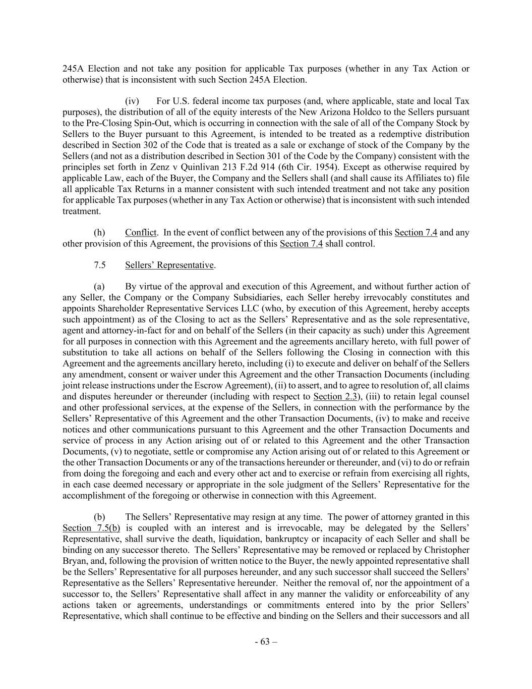 - 63 – 245A Election and not take any position for applicable Tax purposes (whether in any Tax Action or otherwise) that is inconsistent with such Section 245A Election. (iv) For U.S. federal income tax purposes (and, where applicable, state and local Tax purposes), the distribution of all of the equity interests of the New Arizona Holdco to the Sellers pursuant to the Pre-Closing Spin-Out, which is occurring in connection with the sale of all of the Company Stock by Sellers to the Buyer pursuant to this Agreement, is intended to be treated as a redemptive distribution described in Section 302 of the Code that is treated as a sale or exchange of stock of the Company by the Sellers (and not as a distribution described in Section 301 of the Code by the Company) consistent with the principles set forth in Zenz v Quinlivan 213 F.2d 914 (6th Cir. 1954). Except as otherwise required by applicable Law, each of the Buyer, the Company and the Sellers shall (and shall cause its Affiliates to) file all applicable Tax Returns in a manner consistent with such intended treatment and not take any position for applicable Tax purposes (whether in any Tax Action or otherwise) that is inconsistent with such intended treatment. (h) Conflict. In the event of conflict between any of the provisions of this Section 7.4 and any other provision of this Agreement, the provisions of this Section 7.4 shall control. 7.5 Sellers’ Representative. (a) By virtue of the approval and execution of this Agreement, and without further action of any Seller, the Company or the Company Subsidiaries, each Seller hereby irrevocably constitutes and appoints Shareholder Representative Services LLC (who, by execution of this Agreement, hereby accepts such appointment) as of the Closing to act as the Sellers’ Representative and as the sole representative, agent and attorney-in-fact for and on behalf of the Sellers (in their capacity as such) under this Agreement for all purposes in connection with this Agreement and the agreements ancillary hereto, with full power of substitution to take all actions on behalf of the Sellers following the Closing in connection with this Agreement and the agreements ancillary hereto, including (i) to execute and deliver on behalf of the Sellers any amendment, consent or waiver under this Agreement and the other Transaction Documents (including joint release instructions under the Escrow Agreement), (ii) to assert, and to agree to resolution of, all claims and disputes hereunder or thereunder (including with respect to Section 2.3), (iii) to retain legal counsel and other professional services, at the expense of the Sellers, in connection with the performance by the Sellers’ Representative of this Agreement and the other Transaction Documents, (iv) to make and receive notices and other communications pursuant to this Agreement and the other Transaction Documents and service of process in any Action arising out of or related to this Agreement and the other Transaction Documents, (v) to negotiate, settle or compromise any Action arising out of or related to this Agreement or the other Transaction Documents or any of the transactions hereunder or thereunder, and (vi) to do or refrain from doing the foregoing and each and every other act and to exercise or refrain from exercising all rights, in each case deemed necessary or appropriate in the sole judgment of the Sellers’ Representative for the accomplishment of the foregoing or otherwise in connection with this Agreement. (b) The Sellers’ Representative may resign at any time. The power of attorney granted in this Section 7.5(b) is coupled with an interest and is irrevocable, may be delegated by the Sellers’ Representative, shall survive the death, liquidation, bankruptcy or incapacity of each Seller and shall be binding on any successor thereto. The Sellers’ Representative may be removed or replaced by Christopher Bryan, and, following the provision of written notice to the Buyer, the newly appointed representative shall be the Sellers’ Representative for all purposes hereunder, and any such successor shall succeed the Sellers’ Representative as the Sellers’ Representative hereunder. Neither the removal of, nor the appointment of a successor to, the Sellers’ Representative shall affect in any manner the validity or enforceability of any actions taken or agreements, understandings or commitments entered into by the prior Sellers’ Representative, which shall continue to be effective and binding on the Sellers and their successors and all