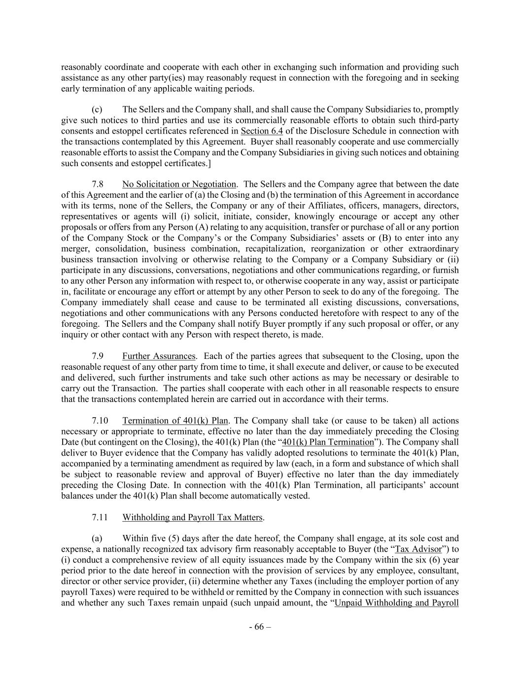 - 66 – reasonably coordinate and cooperate with each other in exchanging such information and providing such assistance as any other party(ies) may reasonably request in connection with the foregoing and in seeking early termination of any applicable waiting periods. (c) The Sellers and the Company shall, and shall cause the Company Subsidiaries to, promptly give such notices to third parties and use its commercially reasonable efforts to obtain such third-party consents and estoppel certificates referenced in Section 6.4 of the Disclosure Schedule in connection with the transactions contemplated by this Agreement. Buyer shall reasonably cooperate and use commercially reasonable efforts to assist the Company and the Company Subsidiaries in giving such notices and obtaining such consents and estoppel certificates.] 7.8 No Solicitation or Negotiation. The Sellers and the Company agree that between the date of this Agreement and the earlier of (a) the Closing and (b) the termination of this Agreement in accordance with its terms, none of the Sellers, the Company or any of their Affiliates, officers, managers, directors, representatives or agents will (i) solicit, initiate, consider, knowingly encourage or accept any other proposals or offers from any Person (A) relating to any acquisition, transfer or purchase of all or any portion of the Company Stock or the Company’s or the Company Subsidiaries’ assets or (B) to enter into any merger, consolidation, business combination, recapitalization, reorganization or other extraordinary business transaction involving or otherwise relating to the Company or a Company Subsidiary or (ii) participate in any discussions, conversations, negotiations and other communications regarding, or furnish to any other Person any information with respect to, or otherwise cooperate in any way, assist or participate in, facilitate or encourage any effort or attempt by any other Person to seek to do any of the foregoing. The Company immediately shall cease and cause to be terminated all existing discussions, conversations, negotiations and other communications with any Persons conducted heretofore with respect to any of the foregoing. The Sellers and the Company shall notify Buyer promptly if any such proposal or offer, or any inquiry or other contact with any Person with respect thereto, is made. 7.9 Further Assurances. Each of the parties agrees that subsequent to the Closing, upon the reasonable request of any other party from time to time, it shall execute and deliver, or cause to be executed and delivered, such further instruments and take such other actions as may be necessary or desirable to carry out the Transaction. The parties shall cooperate with each other in all reasonable respects to ensure that the transactions contemplated herein are carried out in accordance with their terms. 7.10 Termination of 401(k) Plan. The Company shall take (or cause to be taken) all actions necessary or appropriate to terminate, effective no later than the day immediately preceding the Closing Date (but contingent on the Closing), the 401(k) Plan (the “401(k) Plan Termination”). The Company shall deliver to Buyer evidence that the Company has validly adopted resolutions to terminate the 401(k) Plan, accompanied by a terminating amendment as required by law (each, in a form and substance of which shall be subject to reasonable review and approval of Buyer) effective no later than the day immediately preceding the Closing Date. In connection with the 401(k) Plan Termination, all participants’ account balances under the 401(k) Plan shall become automatically vested. 7.11 Withholding and Payroll Tax Matters. (a) Within five (5) days after the date hereof, the Company shall engage, at its sole cost and expense, a nationally recognized tax advisory firm reasonably acceptable to Buyer (the “Tax Advisor”) to (i) conduct a comprehensive review of all equity issuances made by the Company within the six (6) year period prior to the date hereof in connection with the provision of services by any employee, consultant, director or other service provider, (ii) determine whether any Taxes (including the employer portion of any payroll Taxes) were required to be withheld or remitted by the Company in connection with such issuances and whether any such Taxes remain unpaid (such unpaid amount, the “Unpaid Withholding and Payroll