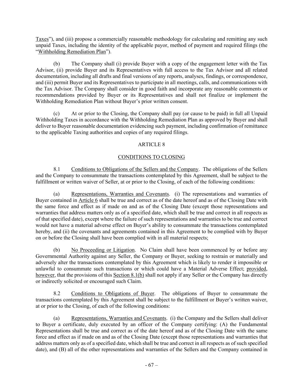- 67 – Taxes”), and (iii) propose a commercially reasonable methodology for calculating and remitting any such unpaid Taxes, including the identity of the applicable payor, method of payment and required filings (the “Withholding Remediation Plan”). (b) The Company shall (i) provide Buyer with a copy of the engagement letter with the Tax Advisor, (ii) provide Buyer and its Representatives with full access to the Tax Advisor and all related documentation, including all drafts and final versions of any reports, analyses, findings, or correspondence, and (iii) permit Buyer and its Representatives to participate in all meetings, calls, and communications with the Tax Advisor. The Company shall consider in good faith and incorporate any reasonable comments or recommendations provided by Buyer or its Representatives and shall not finalize or implement the Withholding Remediation Plan without Buyer’s prior written consent. (c) At or prior to the Closing, the Company shall pay (or cause to be paid) in full all Unpaid Withholding Taxes in accordance with the Withholding Remediation Plan as approved by Buyer and shall deliver to Buyer reasonable documentation evidencing such payment, including confirmation of remittance to the applicable Taxing authorities and copies of any required filings. ARTICLE 8 CONDITIONS TO CLOSING 8.1 Conditions to Obligations of the Sellers and the Company. The obligations of the Sellers and the Company to consummate the transactions contemplated by this Agreement, shall be subject to the fulfillment or written waiver of Seller, at or prior to the Closing, of each of the following conditions: (a) Representations, Warranties and Covenants. (i) The representations and warranties of Buyer contained in Article 6 shall be true and correct as of the date hereof and as of the Closing Date with the same force and effect as if made on and as of the Closing Date (except those representations and warranties that address matters only as of a specified date, which shall be true and correct in all respects as of that specified date), except where the failure of such representations and warranties to be true and correct would not have a material adverse effect on Buyer’s ability to consummate the transactions contemplated hereby, and (ii) the covenants and agreements contained in this Agreement to be complied with by Buyer on or before the Closing shall have been complied with in all material respects; (b) No Proceeding or Litigation. No Claim shall have been commenced by or before any Governmental Authority against any Seller, the Company or Buyer, seeking to restrain or materially and adversely alter the transactions contemplated by this Agreement which is likely to render it impossible or unlawful to consummate such transactions or which could have a Material Adverse Effect; provided, however, that the provisions of this Section 8.1(b) shall not apply if any Seller or the Company has directly or indirectly solicited or encouraged such Claim. 8.2 Conditions to Obligations of Buyer. The obligations of Buyer to consummate the transactions contemplated by this Agreement shall be subject to the fulfillment or Buyer’s written waiver, at or prior to the Closing, of each of the following conditions: (a) Representations, Warranties and Covenants. (i) the Company and the Sellers shall deliver to Buyer a certificate, duly executed by an officer of the Company certifying: (A) the Fundamental Representations shall be true and correct as of the date hereof and as of the Closing Date with the same force and effect as if made on and as of the Closing Date (except those representations and warranties that address matters only as of a specified date, which shall be true and correct in all respects as of such specified date), and (B) all of the other representations and warranties of the Sellers and the Company contained in