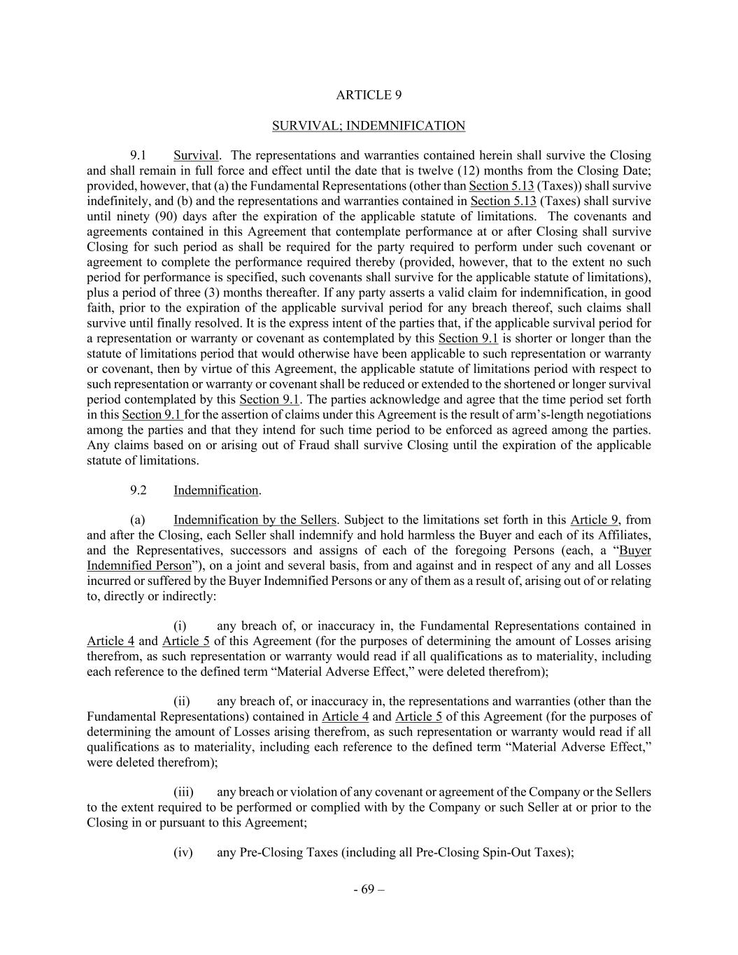 - 69 – ARTICLE 9 SURVIVAL; INDEMNIFICATION 9.1 Survival. The representations and warranties contained herein shall survive the Closing and shall remain in full force and effect until the date that is twelve (12) months from the Closing Date; provided, however, that (a) the Fundamental Representations (other than Section 5.13 (Taxes)) shall survive indefinitely, and (b) and the representations and warranties contained in Section 5.13 (Taxes) shall survive until ninety (90) days after the expiration of the applicable statute of limitations. The covenants and agreements contained in this Agreement that contemplate performance at or after Closing shall survive Closing for such period as shall be required for the party required to perform under such covenant or agreement to complete the performance required thereby (provided, however, that to the extent no such period for performance is specified, such covenants shall survive for the applicable statute of limitations), plus a period of three (3) months thereafter. If any party asserts a valid claim for indemnification, in good faith, prior to the expiration of the applicable survival period for any breach thereof, such claims shall survive until finally resolved. It is the express intent of the parties that, if the applicable survival period for a representation or warranty or covenant as contemplated by this Section 9.1 is shorter or longer than the statute of limitations period that would otherwise have been applicable to such representation or warranty or covenant, then by virtue of this Agreement, the applicable statute of limitations period with respect to such representation or warranty or covenant shall be reduced or extended to the shortened or longer survival period contemplated by this Section 9.1. The parties acknowledge and agree that the time period set forth in this Section 9.1 for the assertion of claims under this Agreement is the result of arm’s-length negotiations among the parties and that they intend for such time period to be enforced as agreed among the parties. Any claims based on or arising out of Fraud shall survive Closing until the expiration of the applicable statute of limitations. 9.2 Indemnification. (a) Indemnification by the Sellers. Subject to the limitations set forth in this Article 9, from and after the Closing, each Seller shall indemnify and hold harmless the Buyer and each of its Affiliates, and the Representatives, successors and assigns of each of the foregoing Persons (each, a “Buyer Indemnified Person”), on a joint and several basis, from and against and in respect of any and all Losses incurred or suffered by the Buyer Indemnified Persons or any of them as a result of, arising out of or relating to, directly or indirectly: (i) any breach of, or inaccuracy in, the Fundamental Representations contained in Article 4 and Article 5 of this Agreement (for the purposes of determining the amount of Losses arising therefrom, as such representation or warranty would read if all qualifications as to materiality, including each reference to the defined term “Material Adverse Effect,” were deleted therefrom); (ii) any breach of, or inaccuracy in, the representations and warranties (other than the Fundamental Representations) contained in Article 4 and Article 5 of this Agreement (for the purposes of determining the amount of Losses arising therefrom, as such representation or warranty would read if all qualifications as to materiality, including each reference to the defined term “Material Adverse Effect,” were deleted therefrom); (iii) any breach or violation of any covenant or agreement of the Company or the Sellers to the extent required to be performed or complied with by the Company or such Seller at or prior to the Closing in or pursuant to this Agreement; (iv) any Pre-Closing Taxes (including all Pre-Closing Spin-Out Taxes);