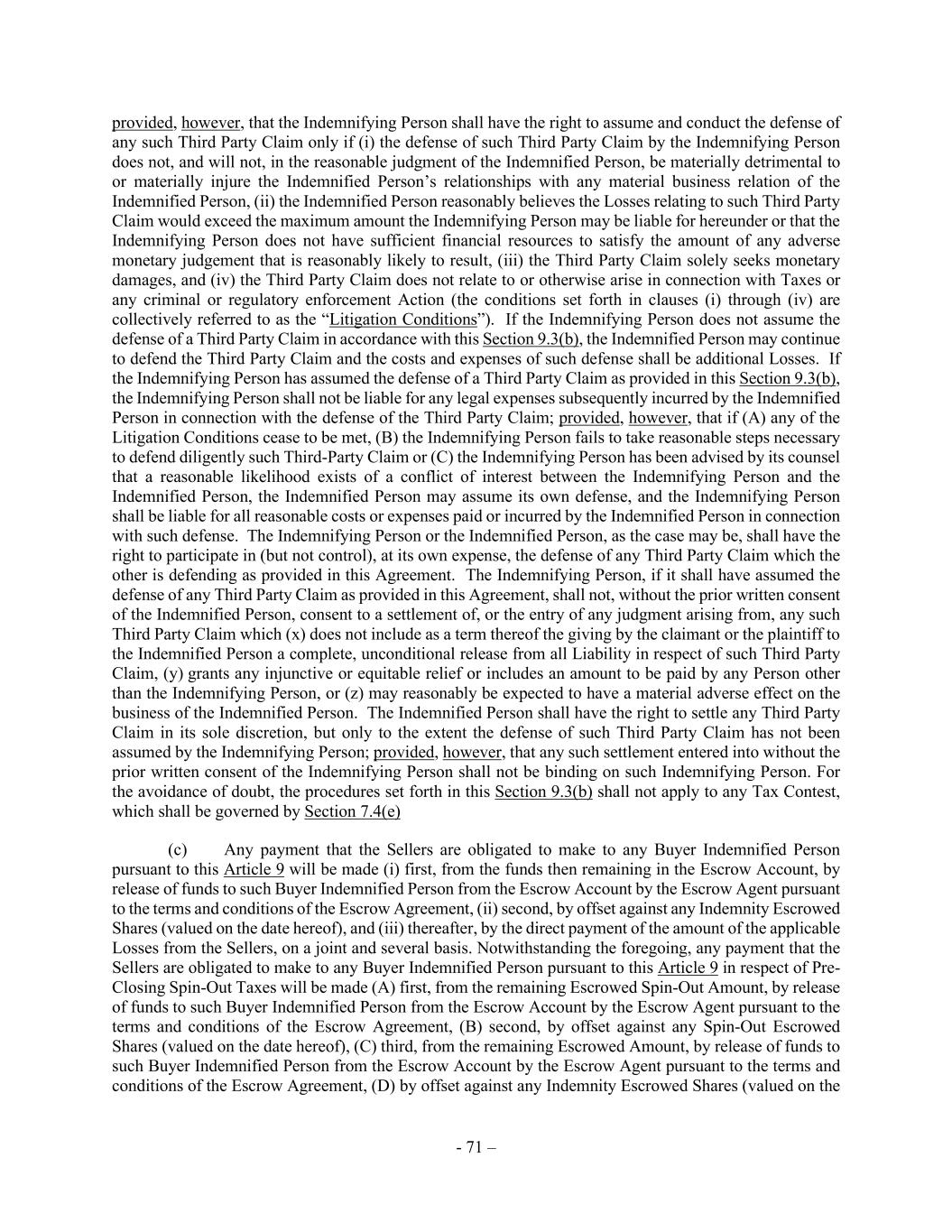 - 71 – provided, however, that the Indemnifying Person shall have the right to assume and conduct the defense of any such Third Party Claim only if (i) the defense of such Third Party Claim by the Indemnifying Person does not, and will not, in the reasonable judgment of the Indemnified Person, be materially detrimental to or materially injure the Indemnified Person’s relationships with any material business relation of the Indemnified Person, (ii) the Indemnified Person reasonably believes the Losses relating to such Third Party Claim would exceed the maximum amount the Indemnifying Person may be liable for hereunder or that the Indemnifying Person does not have sufficient financial resources to satisfy the amount of any adverse monetary judgement that is reasonably likely to result, (iii) the Third Party Claim solely seeks monetary damages, and (iv) the Third Party Claim does not relate to or otherwise arise in connection with Taxes or any criminal or regulatory enforcement Action (the conditions set forth in clauses (i) through (iv) are collectively referred to as the “Litigation Conditions”). If the Indemnifying Person does not assume the defense of a Third Party Claim in accordance with this Section 9.3(b), the Indemnified Person may continue to defend the Third Party Claim and the costs and expenses of such defense shall be additional Losses. If the Indemnifying Person has assumed the defense of a Third Party Claim as provided in this Section 9.3(b), the Indemnifying Person shall not be liable for any legal expenses subsequently incurred by the Indemnified Person in connection with the defense of the Third Party Claim; provided, however, that if (A) any of the Litigation Conditions cease to be met, (B) the Indemnifying Person fails to take reasonable steps necessary to defend diligently such Third-Party Claim or (C) the Indemnifying Person has been advised by its counsel that a reasonable likelihood exists of a conflict of interest between the Indemnifying Person and the Indemnified Person, the Indemnified Person may assume its own defense, and the Indemnifying Person shall be liable for all reasonable costs or expenses paid or incurred by the Indemnified Person in connection with such defense. The Indemnifying Person or the Indemnified Person, as the case may be, shall have the right to participate in (but not control), at its own expense, the defense of any Third Party Claim which the other is defending as provided in this Agreement. The Indemnifying Person, if it shall have assumed the defense of any Third Party Claim as provided in this Agreement, shall not, without the prior written consent of the Indemnified Person, consent to a settlement of, or the entry of any judgment arising from, any such Third Party Claim which (x) does not include as a term thereof the giving by the claimant or the plaintiff to the Indemnified Person a complete, unconditional release from all Liability in respect of such Third Party Claim, (y) grants any injunctive or equitable relief or includes an amount to be paid by any Person other than the Indemnifying Person, or (z) may reasonably be expected to have a material adverse effect on the business of the Indemnified Person. The Indemnified Person shall have the right to settle any Third Party Claim in its sole discretion, but only to the extent the defense of such Third Party Claim has not been assumed by the Indemnifying Person; provided, however, that any such settlement entered into without the prior written consent of the Indemnifying Person shall not be binding on such Indemnifying Person. For the avoidance of doubt, the procedures set forth in this Section 9.3(b) shall not apply to any Tax Contest, which shall be governed by Section 7.4(e) (c) Any payment that the Sellers are obligated to make to any Buyer Indemnified Person pursuant to this Article 9 will be made (i) first, from the funds then remaining in the Escrow Account, by release of funds to such Buyer Indemnified Person from the Escrow Account by the Escrow Agent pursuant to the terms and conditions of the Escrow Agreement, (ii) second, by offset against any Indemnity Escrowed Shares (valued on the date hereof), and (iii) thereafter, by the direct payment of the amount of the applicable Losses from the Sellers, on a joint and several basis. Notwithstanding the foregoing, any payment that the Sellers are obligated to make to any Buyer Indemnified Person pursuant to this Article 9 in respect of Pre- Closing Spin-Out Taxes will be made (A) first, from the remaining Escrowed Spin-Out Amount, by release of funds to such Buyer Indemnified Person from the Escrow Account by the Escrow Agent pursuant to the terms and conditions of the Escrow Agreement, (B) second, by offset against any Spin-Out Escrowed Shares (valued on the date hereof), (C) third, from the remaining Escrowed Amount, by release of funds to such Buyer Indemnified Person from the Escrow Account by the Escrow Agent pursuant to the terms and conditions of the Escrow Agreement, (D) by offset against any Indemnity Escrowed Shares (valued on the