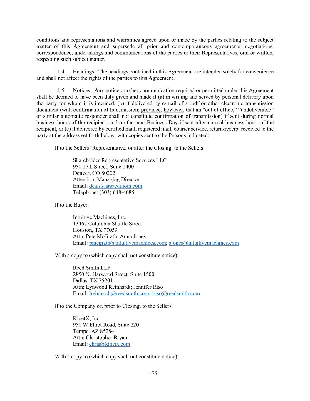 - 75 – conditions and representations and warranties agreed upon or made by the parties relating to the subject matter of this Agreement and supersede all prior and contemporaneous agreements, negotiations, correspondence, undertakings and communications of the parties or their Representatives, oral or written, respecting such subject matter. 11.4 Headings. The headings contained in this Agreement are intended solely for convenience and shall not affect the rights of the parties to this Agreement. 11.5 Notices. Any notice or other communication required or permitted under this Agreement shall be deemed to have been duly given and made if (a) in writing and served by personal delivery upon the party for whom it is intended, (b) if delivered by e-mail of a .pdf or other electronic transmission document (with confirmation of transmission; provided, however, that an “out of office,” “undeliverable” or similar automatic responder shall not constitute confirmation of transmission) if sent during normal business hours of the recipient, and on the next Business Day if sent after normal business hours of the recipient, or (c) if delivered by certified mail, registered mail, courier service, return-receipt received to the party at the address set forth below, with copies sent to the Persons indicated: If to the Sellers’ Representative, or after the Closing, to the Sellers: Shareholder Representative Services LLC 950 17th Street, Suite 1400 Denver, CO 80202 Attention: Managing Director Email: deals@srsacquiom.com Telephone: (303) 648-4085 If to the Buyer: Intuitive Machines, Inc. 13467 Columbia Shuttle Street Houston, TX 77059 Attn: Pete McGrath; Anna Jones Email: pmcgrath@intuitivemachines.com; ajones@intuitivemachines.com With a copy to (which copy shall not constitute notice): Reed Smith LLP 2850 N. Harwood Street, Suite 1500 Dallas, TX 75201 Attn: Lynwood Reinhardt; Jennifer Riso Email: lreinhardt@reedsmith.com; jriso@reedsmith.com If to the Company or, prior to Closing, to the Sellers: KinetX, Inc. 950 W Elliot Road, Suite 220 Tempe, AZ 85284 Attn: Christopher Bryan Email: chris@kinetx.com With a copy to (which copy shall not constitute notice):