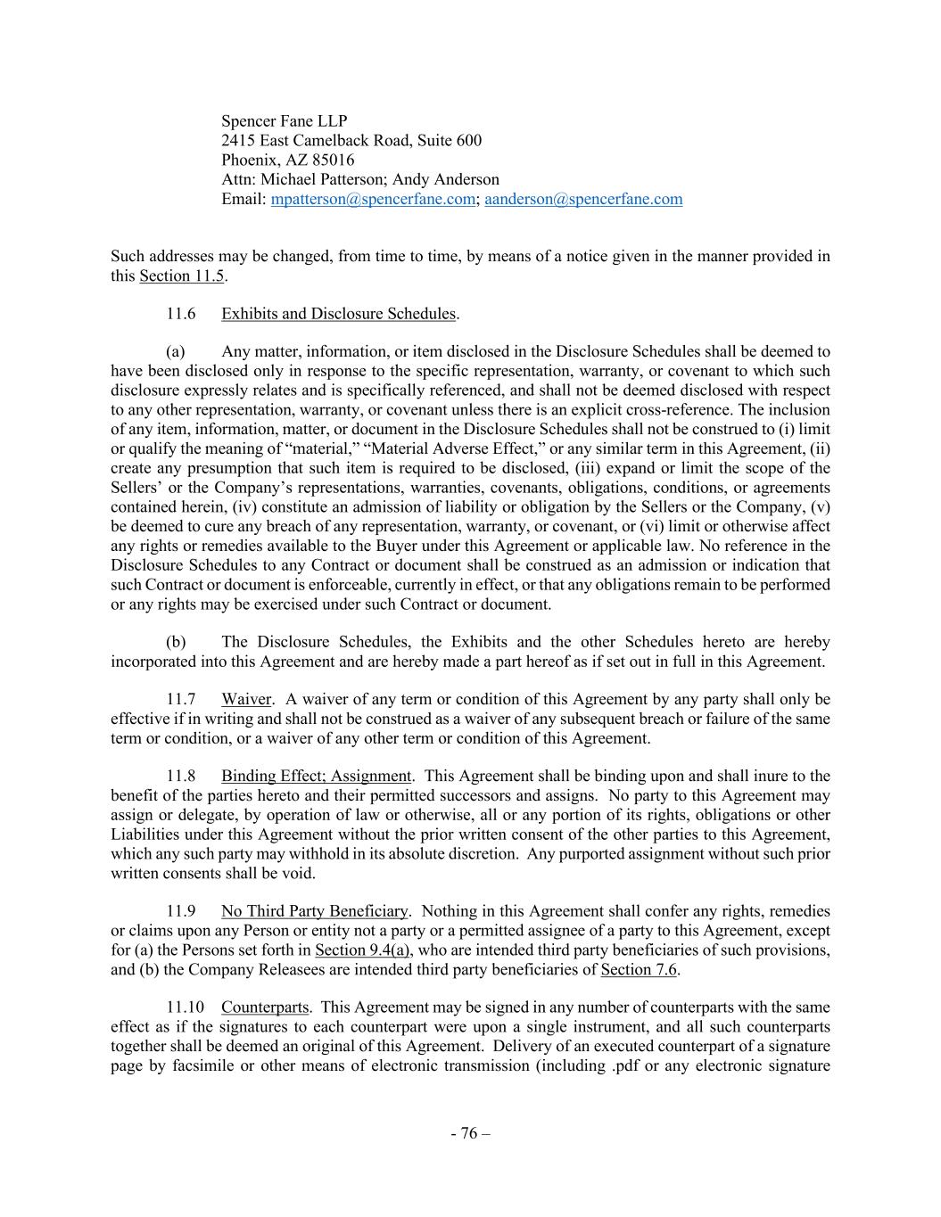 - 76 – Spencer Fane LLP 2415 East Camelback Road, Suite 600 Phoenix, AZ 85016 Attn: Michael Patterson; Andy Anderson Email: mpatterson@spencerfane.com; aanderson@spencerfane.com Such addresses may be changed, from time to time, by means of a notice given in the manner provided in this Section 11.5. 11.6 Exhibits and Disclosure Schedules. (a) Any matter, information, or item disclosed in the Disclosure Schedules shall be deemed to have been disclosed only in response to the specific representation, warranty, or covenant to which such disclosure expressly relates and is specifically referenced, and shall not be deemed disclosed with respect to any other representation, warranty, or covenant unless there is an explicit cross-reference. The inclusion of any item, information, matter, or document in the Disclosure Schedules shall not be construed to (i) limit or qualify the meaning of “material,” “Material Adverse Effect,” or any similar term in this Agreement, (ii) create any presumption that such item is required to be disclosed, (iii) expand or limit the scope of the Sellers’ or the Company’s representations, warranties, covenants, obligations, conditions, or agreements contained herein, (iv) constitute an admission of liability or obligation by the Sellers or the Company, (v) be deemed to cure any breach of any representation, warranty, or covenant, or (vi) limit or otherwise affect any rights or remedies available to the Buyer under this Agreement or applicable law. No reference in the Disclosure Schedules to any Contract or document shall be construed as an admission or indication that such Contract or document is enforceable, currently in effect, or that any obligations remain to be performed or any rights may be exercised under such Contract or document. (b) The Disclosure Schedules, the Exhibits and the other Schedules hereto are hereby incorporated into this Agreement and are hereby made a part hereof as if set out in full in this Agreement. 11.7 Waiver. A waiver of any term or condition of this Agreement by any party shall only be effective if in writing and shall not be construed as a waiver of any subsequent breach or failure of the same term or condition, or a waiver of any other term or condition of this Agreement. 11.8 Binding Effect; Assignment. This Agreement shall be binding upon and shall inure to the benefit of the parties hereto and their permitted successors and assigns. No party to this Agreement may assign or delegate, by operation of law or otherwise, all or any portion of its rights, obligations or other Liabilities under this Agreement without the prior written consent of the other parties to this Agreement, which any such party may withhold in its absolute discretion. Any purported assignment without such prior written consents shall be void. 11.9 No Third Party Beneficiary. Nothing in this Agreement shall confer any rights, remedies or claims upon any Person or entity not a party or a permitted assignee of a party to this Agreement, except for (a) the Persons set forth in Section 9.4(a), who are intended third party beneficiaries of such provisions, and (b) the Company Releasees are intended third party beneficiaries of Section 7.6. 11.10 Counterparts. This Agreement may be signed in any number of counterparts with the same effect as if the signatures to each counterpart were upon a single instrument, and all such counterparts together shall be deemed an original of this Agreement. Delivery of an executed counterpart of a signature page by facsimile or other means of electronic transmission (including .pdf or any electronic signature