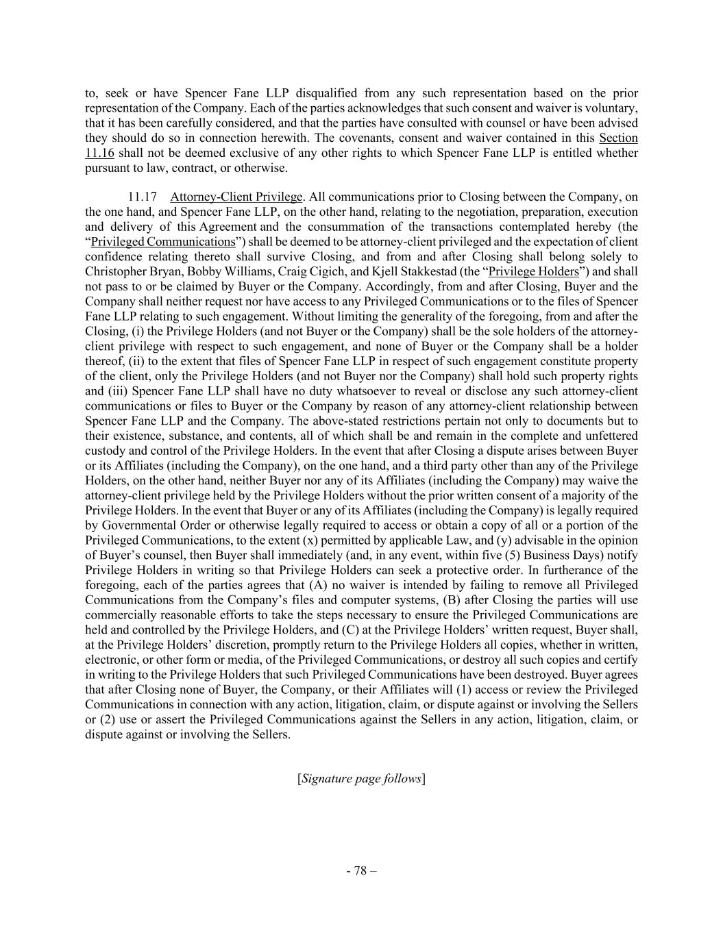- 78 – to, seek or have Spencer Fane LLP disqualified from any such representation based on the prior representation of the Company. Each of the parties acknowledges that such consent and waiver is voluntary, that it has been carefully considered, and that the parties have consulted with counsel or have been advised they should do so in connection herewith. The covenants, consent and waiver contained in this Section 11.16 shall not be deemed exclusive of any other rights to which Spencer Fane LLP is entitled whether pursuant to law, contract, or otherwise. 11.17 Attorney-Client Privilege. All communications prior to Closing between the Company, on the one hand, and Spencer Fane LLP, on the other hand, relating to the negotiation, preparation, execution and delivery of this Agreement and the consummation of the transactions contemplated hereby (the “Privileged Communications”) shall be deemed to be attorney-client privileged and the expectation of client confidence relating thereto shall survive Closing, and from and after Closing shall belong solely to Christopher Bryan, Bobby Williams, Craig Cigich, and Kjell Stakkestad (the “Privilege Holders”) and shall not pass to or be claimed by Buyer or the Company. Accordingly, from and after Closing, Buyer and the Company shall neither request nor have access to any Privileged Communications or to the files of Spencer Fane LLP relating to such engagement. Without limiting the generality of the foregoing, from and after the Closing, (i) the Privilege Holders (and not Buyer or the Company) shall be the sole holders of the attorney- client privilege with respect to such engagement, and none of Buyer or the Company shall be a holder thereof, (ii) to the extent that files of Spencer Fane LLP in respect of such engagement constitute property of the client, only the Privilege Holders (and not Buyer nor the Company) shall hold such property rights and (iii) Spencer Fane LLP shall have no duty whatsoever to reveal or disclose any such attorney-client communications or files to Buyer or the Company by reason of any attorney-client relationship between Spencer Fane LLP and the Company. The above-stated restrictions pertain not only to documents but to their existence, substance, and contents, all of which shall be and remain in the complete and unfettered custody and control of the Privilege Holders. In the event that after Closing a dispute arises between Buyer or its Affiliates (including the Company), on the one hand, and a third party other than any of the Privilege Holders, on the other hand, neither Buyer nor any of its Affiliates (including the Company) may waive the attorney-client privilege held by the Privilege Holders without the prior written consent of a majority of the Privilege Holders. In the event that Buyer or any of its Affiliates (including the Company) is legally required by Governmental Order or otherwise legally required to access or obtain a copy of all or a portion of the Privileged Communications, to the extent (x) permitted by applicable Law, and (y) advisable in the opinion of Buyer’s counsel, then Buyer shall immediately (and, in any event, within five (5) Business Days) notify Privilege Holders in writing so that Privilege Holders can seek a protective order. In furtherance of the foregoing, each of the parties agrees that (A) no waiver is intended by failing to remove all Privileged Communications from the Company’s files and computer systems, (B) after Closing the parties will use commercially reasonable efforts to take the steps necessary to ensure the Privileged Communications are held and controlled by the Privilege Holders, and (C) at the Privilege Holders’ written request, Buyer shall, at the Privilege Holders’ discretion, promptly return to the Privilege Holders all copies, whether in written, electronic, or other form or media, of the Privileged Communications, or destroy all such copies and certify in writing to the Privilege Holders that such Privileged Communications have been destroyed. Buyer agrees that after Closing none of Buyer, the Company, or their Affiliates will (1) access or review the Privileged Communications in connection with any action, litigation, claim, or dispute against or involving the Sellers or (2) use or assert the Privileged Communications against the Sellers in any action, litigation, claim, or dispute against or involving the Sellers. [Signature page follows]