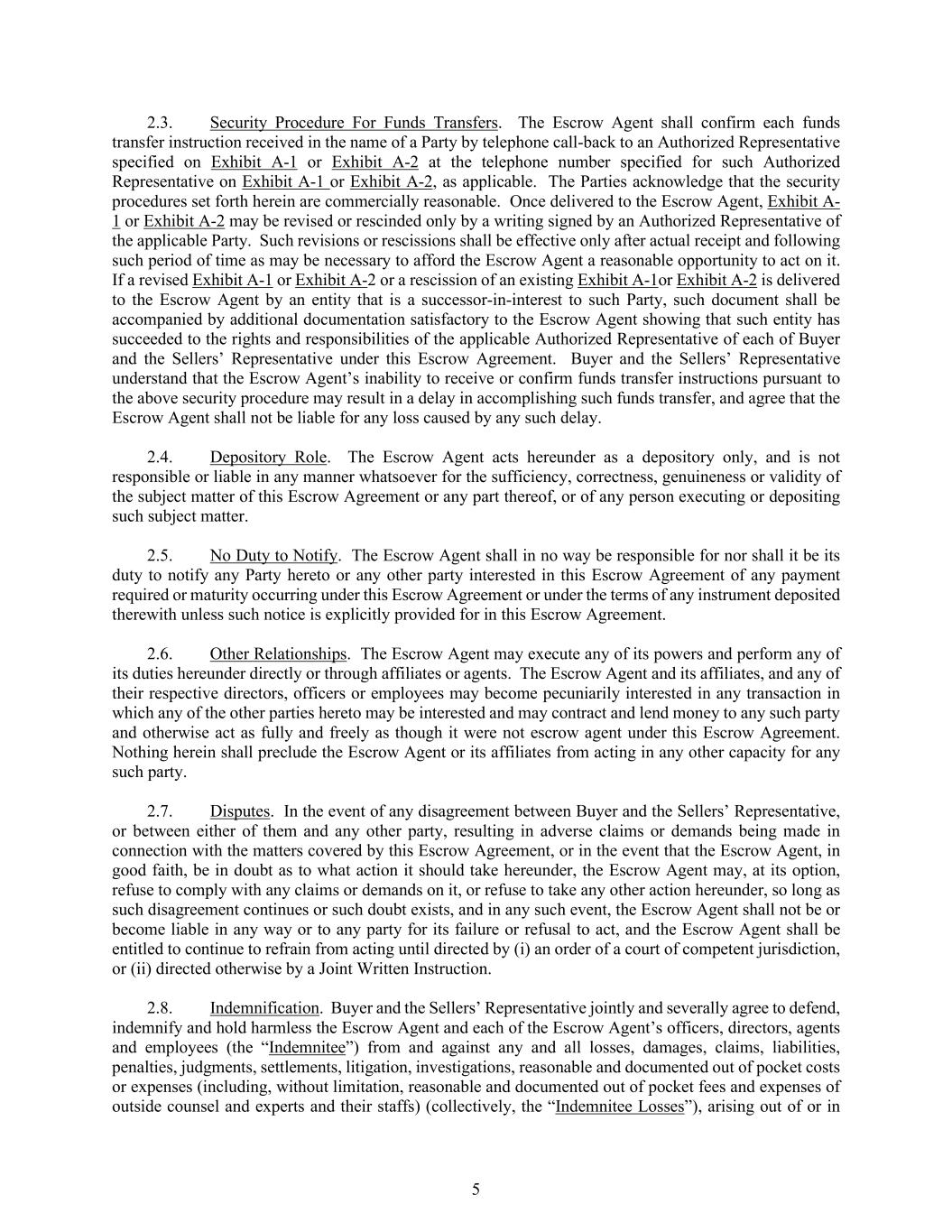 5 2.3. Security Procedure For Funds Transfers. The Escrow Agent shall confirm each funds transfer instruction received in the name of a Party by telephone call-back to an Authorized Representative specified on Exhibit A-1 or Exhibit A-2 at the telephone number specified for such Authorized Representative on Exhibit A-1 or Exhibit A-2, as applicable. The Parties acknowledge that the security procedures set forth herein are commercially reasonable. Once delivered to the Escrow Agent, Exhibit A- 1 or Exhibit A-2 may be revised or rescinded only by a writing signed by an Authorized Representative of the applicable Party. Such revisions or rescissions shall be effective only after actual receipt and following such period of time as may be necessary to afford the Escrow Agent a reasonable opportunity to act on it. If a revised Exhibit A-1 or Exhibit A-2 or a rescission of an existing Exhibit A-1or Exhibit A-2 is delivered to the Escrow Agent by an entity that is a successor-in-interest to such Party, such document shall be accompanied by additional documentation satisfactory to the Escrow Agent showing that such entity has succeeded to the rights and responsibilities of the applicable Authorized Representative of each of Buyer and the Sellers’ Representative under this Escrow Agreement. Buyer and the Sellers’ Representative understand that the Escrow Agent’s inability to receive or confirm funds transfer instructions pursuant to the above security procedure may result in a delay in accomplishing such funds transfer, and agree that the Escrow Agent shall not be liable for any loss caused by any such delay. 2.4. Depository Role. The Escrow Agent acts hereunder as a depository only, and is not responsible or liable in any manner whatsoever for the sufficiency, correctness, genuineness or validity of the subject matter of this Escrow Agreement or any part thereof, or of any person executing or depositing such subject matter. 2.5. No Duty to Notify. The Escrow Agent shall in no way be responsible for nor shall it be its duty to notify any Party hereto or any other party interested in this Escrow Agreement of any payment required or maturity occurring under this Escrow Agreement or under the terms of any instrument deposited therewith unless such notice is explicitly provided for in this Escrow Agreement. 2.6. Other Relationships. The Escrow Agent may execute any of its powers and perform any of its duties hereunder directly or through affiliates or agents. The Escrow Agent and its affiliates, and any of their respective directors, officers or employees may become pecuniarily interested in any transaction in which any of the other parties hereto may be interested and may contract and lend money to any such party and otherwise act as fully and freely as though it were not escrow agent under this Escrow Agreement. Nothing herein shall preclude the Escrow Agent or its affiliates from acting in any other capacity for any such party. 2.7. Disputes. In the event of any disagreement between Buyer and the Sellers’ Representative, or between either of them and any other party, resulting in adverse claims or demands being made in connection with the matters covered by this Escrow Agreement, or in the event that the Escrow Agent, in good faith, be in doubt as to what action it should take hereunder, the Escrow Agent may, at its option, refuse to comply with any claims or demands on it, or refuse to take any other action hereunder, so long as such disagreement continues or such doubt exists, and in any such event, the Escrow Agent shall not be or become liable in any way or to any party for its failure or refusal to act, and the Escrow Agent shall be entitled to continue to refrain from acting until directed by (i) an order of a court of competent jurisdiction, or (ii) directed otherwise by a Joint Written Instruction. 2.8. Indemnification. Buyer and the Sellers’ Representative jointly and severally agree to defend, indemnify and hold harmless the Escrow Agent and each of the Escrow Agent’s officers, directors, agents and employees (the “Indemnitee”) from and against any and all losses, damages, claims, liabilities, penalties, judgments, settlements, litigation, investigations, reasonable and documented out of pocket costs or expenses (including, without limitation, reasonable and documented out of pocket fees and expenses of outside counsel and experts and their staffs) (collectively, the “Indemnitee Losses”), arising out of or in