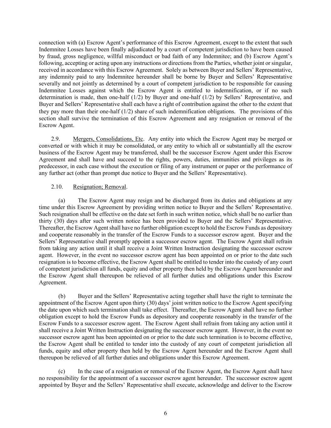 6 connection with (a) Escrow Agent’s performance of this Escrow Agreement, except to the extent that such Indemnitee Losses have been finally adjudicated by a court of competent jurisdiction to have been caused by fraud, gross negligence, willful misconduct or bad faith of any Indemnitee; and (b) Escrow Agent’s following, accepting or acting upon any instructions or directions from the Parties, whether joint or singular, received in accordance with this Escrow Agreement. Solely as between Buyer and Sellers’ Representative, any indemnity paid to any Indemnitee hereunder shall be borne by Buyer and Sellers’ Representative severally and not jointly as determined by a court of competent jurisdiction to be responsible for causing Indemnitee Losses against which the Escrow Agent is entitled to indemnification, or if no such determination is made, then one-half (1/2) by Buyer and one-half (1/2) by Sellers’ Representative, and Buyer and Sellers’ Representative shall each have a right of contribution against the other to the extent that they pay more than their one-half (1/2) share of such indemnification obligations. The provisions of this section shall survive the termination of this Escrow Agreement and any resignation or removal of the Escrow Agent. 2.9. Mergers, Consolidations, Etc. Any entity into which the Escrow Agent may be merged or converted or with which it may be consolidated, or any entity to which all or substantially all the escrow business of the Escrow Agent may be transferred, shall be the successor Escrow Agent under this Escrow Agreement and shall have and succeed to the rights, powers, duties, immunities and privileges as its predecessor, in each case without the execution or filing of any instrument or paper or the performance of any further act (other than prompt due notice to Buyer and the Sellers’ Representative). 2.10. Resignation; Removal. (a) The Escrow Agent may resign and be discharged from its duties and obligations at any time under this Escrow Agreement by providing written notice to Buyer and the Sellers’ Representative. Such resignation shall be effective on the date set forth in such written notice, which shall be no earlier than thirty (30) days after such written notice has been provided to Buyer and the Sellers’ Representative. Thereafter, the Escrow Agent shall have no further obligation except to hold the Escrow Funds as depository and cooperate reasonably in the transfer of the Escrow Funds to a successor escrow agent. Buyer and the Sellers’ Representative shall promptly appoint a successor escrow agent. The Escrow Agent shall refrain from taking any action until it shall receive a Joint Written Instruction designating the successor escrow agent. However, in the event no successor escrow agent has been appointed on or prior to the date such resignation is to become effective, the Escrow Agent shall be entitled to tender into the custody of any court of competent jurisdiction all funds, equity and other property then held by the Escrow Agent hereunder and the Escrow Agent shall thereupon be relieved of all further duties and obligations under this Escrow Agreement. (b) Buyer and the Sellers’ Representative acting together shall have the right to terminate the appointment of the Escrow Agent upon thirty (30) days’ joint written notice to the Escrow Agent specifying the date upon which such termination shall take effect. Thereafter, the Escrow Agent shall have no further obligation except to hold the Escrow Funds as depository and cooperate reasonably in the transfer of the Escrow Funds to a successor escrow agent. The Escrow Agent shall refrain from taking any action until it shall receive a Joint Written Instruction designating the successor escrow agent. However, in the event no successor escrow agent has been appointed on or prior to the date such termination is to become effective, the Escrow Agent shall be entitled to tender into the custody of any court of competent jurisdiction all funds, equity and other property then held by the Escrow Agent hereunder and the Escrow Agent shall thereupon be relieved of all further duties and obligations under this Escrow Agreement. (c) In the case of a resignation or removal of the Escrow Agent, the Escrow Agent shall have no responsibility for the appointment of a successor escrow agent hereunder. The successor escrow agent appointed by Buyer and the Sellers’ Representative shall execute, acknowledge and deliver to the Escrow