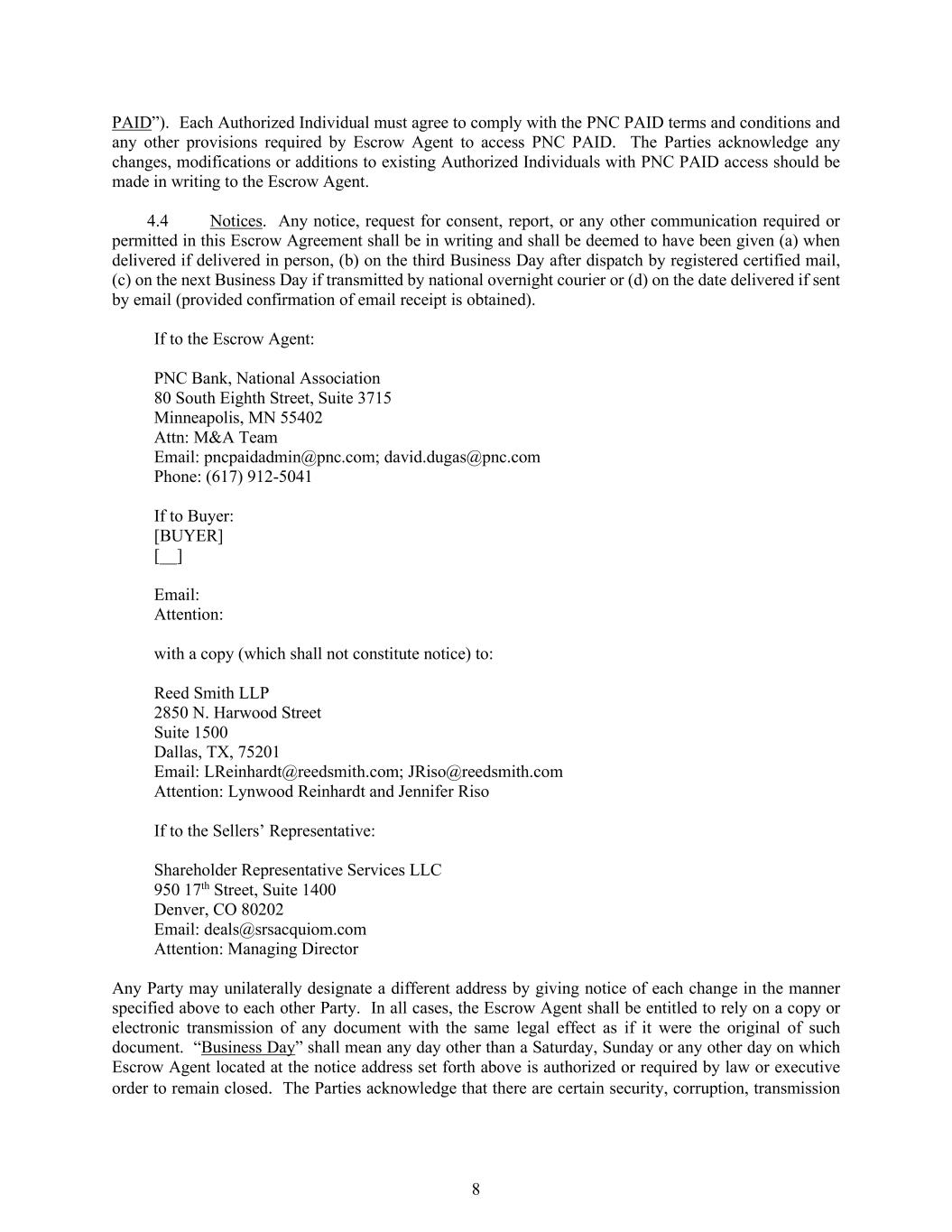 8 PAID”). Each Authorized Individual must agree to comply with the PNC PAID terms and conditions and any other provisions required by Escrow Agent to access PNC PAID. The Parties acknowledge any changes, modifications or additions to existing Authorized Individuals with PNC PAID access should be made in writing to the Escrow Agent. 4.4 Notices. Any notice, request for consent, report, or any other communication required or permitted in this Escrow Agreement shall be in writing and shall be deemed to have been given (a) when delivered if delivered in person, (b) on the third Business Day after dispatch by registered certified mail, (c) on the next Business Day if transmitted by national overnight courier or (d) on the date delivered if sent by email (provided confirmation of email receipt is obtained). If to the Escrow Agent: PNC Bank, National Association 80 South Eighth Street, Suite 3715 Minneapolis, MN 55402 Attn: M&A Team Email: pncpaidadmin@pnc.com; david.dugas@pnc.com Phone: (617) 912-5041 If to Buyer: [BUYER] [__] Email: Attention: with a copy (which shall not constitute notice) to: Reed Smith LLP 2850 N. Harwood Street Suite 1500 Dallas, TX, 75201 Email: LReinhardt@reedsmith.com; JRiso@reedsmith.com Attention: Lynwood Reinhardt and Jennifer Riso If to the Sellers’ Representative: Shareholder Representative Services LLC 950 17th Street, Suite 1400 Denver, CO 80202 Email: deals@srsacquiom.com Attention: Managing Director Any Party may unilaterally designate a different address by giving notice of each change in the manner specified above to each other Party. In all cases, the Escrow Agent shall be entitled to rely on a copy or electronic transmission of any document with the same legal effect as if it were the original of such document. “Business Day” shall mean any day other than a Saturday, Sunday or any other day on which Escrow Agent located at the notice address set forth above is authorized or required by law or executive order to remain closed. The Parties acknowledge that there are certain security, corruption, transmission