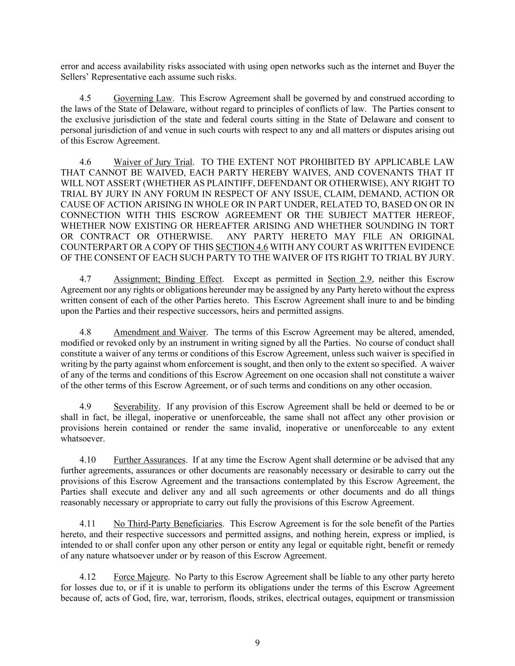9 error and access availability risks associated with using open networks such as the internet and Buyer the Sellers’ Representative each assume such risks. 4.5 Governing Law. This Escrow Agreement shall be governed by and construed according to the laws of the State of Delaware, without regard to principles of conflicts of law. The Parties consent to the exclusive jurisdiction of the state and federal courts sitting in the State of Delaware and consent to personal jurisdiction of and venue in such courts with respect to any and all matters or disputes arising out of this Escrow Agreement. 4.6 Waiver of Jury Trial. TO THE EXTENT NOT PROHIBITED BY APPLICABLE LAW THAT CANNOT BE WAIVED, EACH PARTY HEREBY WAIVES, AND COVENANTS THAT IT WILL NOT ASSERT (WHETHER AS PLAINTIFF, DEFENDANT OR OTHERWISE), ANY RIGHT TO TRIAL BY JURY IN ANY FORUM IN RESPECT OF ANY ISSUE, CLAIM, DEMAND, ACTION OR CAUSE OF ACTION ARISING IN WHOLE OR IN PART UNDER, RELATED TO, BASED ON OR IN CONNECTION WITH THIS ESCROW AGREEMENT OR THE SUBJECT MATTER HEREOF, WHETHER NOW EXISTING OR HEREAFTER ARISING AND WHETHER SOUNDING IN TORT OR CONTRACT OR OTHERWISE. ANY PARTY HERETO MAY FILE AN ORIGINAL COUNTERPART OR A COPY OF THIS SECTION 4.6 WITH ANY COURT AS WRITTEN EVIDENCE OF THE CONSENT OF EACH SUCH PARTY TO THE WAIVER OF ITS RIGHT TO TRIAL BY JURY. 4.7 Assignment; Binding Effect. Except as permitted in Section 2.9, neither this Escrow Agreement nor any rights or obligations hereunder may be assigned by any Party hereto without the express written consent of each of the other Parties hereto. This Escrow Agreement shall inure to and be binding upon the Parties and their respective successors, heirs and permitted assigns. 4.8 Amendment and Waiver. The terms of this Escrow Agreement may be altered, amended, modified or revoked only by an instrument in writing signed by all the Parties. No course of conduct shall constitute a waiver of any terms or conditions of this Escrow Agreement, unless such waiver is specified in writing by the party against whom enforcement is sought, and then only to the extent so specified. A waiver of any of the terms and conditions of this Escrow Agreement on one occasion shall not constitute a waiver of the other terms of this Escrow Agreement, or of such terms and conditions on any other occasion. 4.9 Severability. If any provision of this Escrow Agreement shall be held or deemed to be or shall in fact, be illegal, inoperative or unenforceable, the same shall not affect any other provision or provisions herein contained or render the same invalid, inoperative or unenforceable to any extent whatsoever. 4.10 Further Assurances. If at any time the Escrow Agent shall determine or be advised that any further agreements, assurances or other documents are reasonably necessary or desirable to carry out the provisions of this Escrow Agreement and the transactions contemplated by this Escrow Agreement, the Parties shall execute and deliver any and all such agreements or other documents and do all things reasonably necessary or appropriate to carry out fully the provisions of this Escrow Agreement. 4.11 No Third-Party Beneficiaries. This Escrow Agreement is for the sole benefit of the Parties hereto, and their respective successors and permitted assigns, and nothing herein, express or implied, is intended to or shall confer upon any other person or entity any legal or equitable right, benefit or remedy of any nature whatsoever under or by reason of this Escrow Agreement. 4.12 Force Majeure. No Party to this Escrow Agreement shall be liable to any other party hereto for losses due to, or if it is unable to perform its obligations under the terms of this Escrow Agreement because of, acts of God, fire, war, terrorism, floods, strikes, electrical outages, equipment or transmission