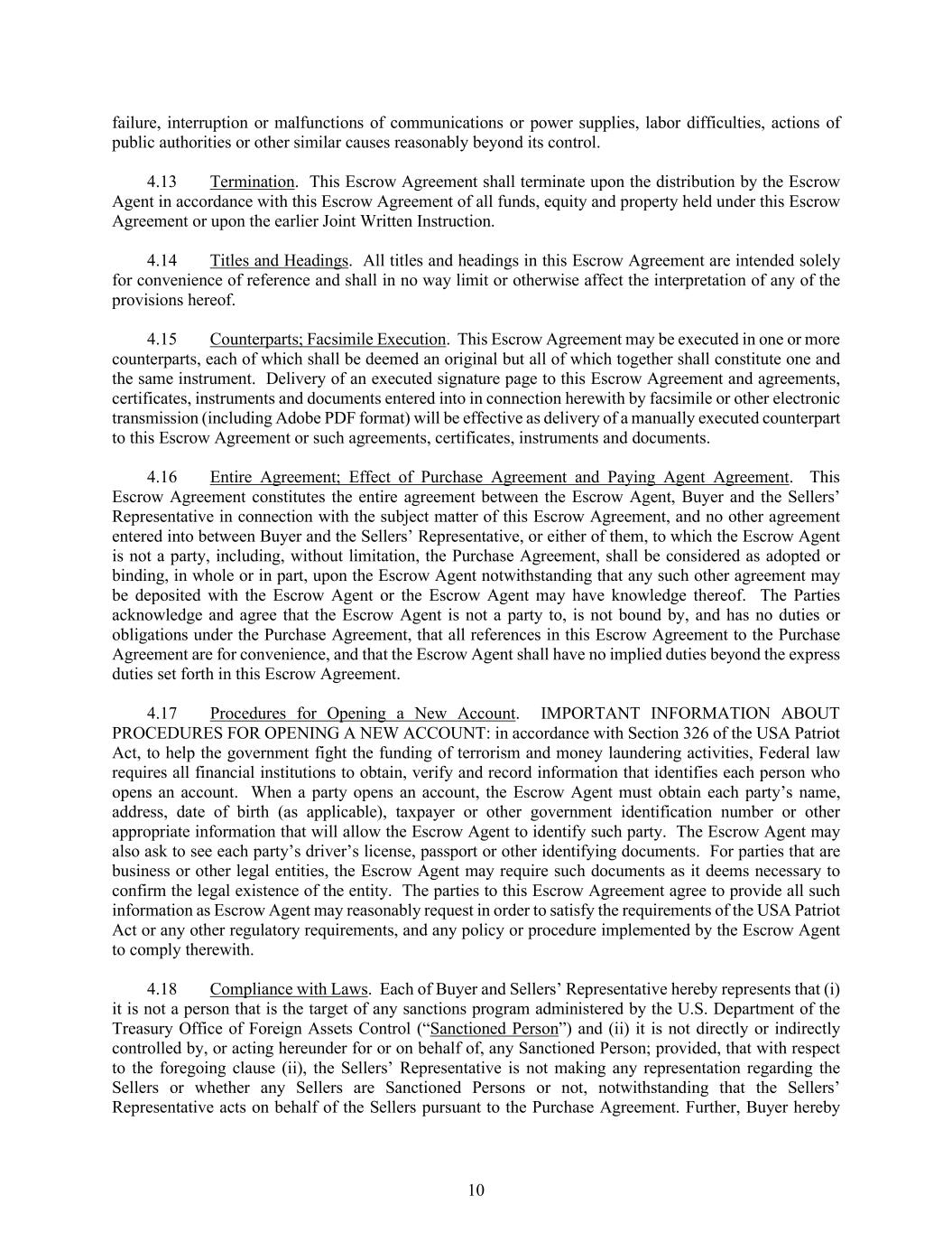 10 failure, interruption or malfunctions of communications or power supplies, labor difficulties, actions of public authorities or other similar causes reasonably beyond its control. 4.13 Termination. This Escrow Agreement shall terminate upon the distribution by the Escrow Agent in accordance with this Escrow Agreement of all funds, equity and property held under this Escrow Agreement or upon the earlier Joint Written Instruction. 4.14 Titles and Headings. All titles and headings in this Escrow Agreement are intended solely for convenience of reference and shall in no way limit or otherwise affect the interpretation of any of the provisions hereof. 4.15 Counterparts; Facsimile Execution. This Escrow Agreement may be executed in one or more counterparts, each of which shall be deemed an original but all of which together shall constitute one and the same instrument. Delivery of an executed signature page to this Escrow Agreement and agreements, certificates, instruments and documents entered into in connection herewith by facsimile or other electronic transmission (including Adobe PDF format) will be effective as delivery of a manually executed counterpart to this Escrow Agreement or such agreements, certificates, instruments and documents. 4.16 Entire Agreement; Effect of Purchase Agreement and Paying Agent Agreement. This Escrow Agreement constitutes the entire agreement between the Escrow Agent, Buyer and the Sellers’ Representative in connection with the subject matter of this Escrow Agreement, and no other agreement entered into between Buyer and the Sellers’ Representative, or either of them, to which the Escrow Agent is not a party, including, without limitation, the Purchase Agreement, shall be considered as adopted or binding, in whole or in part, upon the Escrow Agent notwithstanding that any such other agreement may be deposited with the Escrow Agent or the Escrow Agent may have knowledge thereof. The Parties acknowledge and agree that the Escrow Agent is not a party to, is not bound by, and has no duties or obligations under the Purchase Agreement, that all references in this Escrow Agreement to the Purchase Agreement are for convenience, and that the Escrow Agent shall have no implied duties beyond the express duties set forth in this Escrow Agreement. 4.17 Procedures for Opening a New Account. IMPORTANT INFORMATION ABOUT PROCEDURES FOR OPENING A NEW ACCOUNT: in accordance with Section 326 of the USA Patriot Act, to help the government fight the funding of terrorism and money laundering activities, Federal law requires all financial institutions to obtain, verify and record information that identifies each person who opens an account. When a party opens an account, the Escrow Agent must obtain each party’s name, address, date of birth (as applicable), taxpayer or other government identification number or other appropriate information that will allow the Escrow Agent to identify such party. The Escrow Agent may also ask to see each party’s driver’s license, passport or other identifying documents. For parties that are business or other legal entities, the Escrow Agent may require such documents as it deems necessary to confirm the legal existence of the entity. The parties to this Escrow Agreement agree to provide all such information as Escrow Agent may reasonably request in order to satisfy the requirements of the USA Patriot Act or any other regulatory requirements, and any policy or procedure implemented by the Escrow Agent to comply therewith. 4.18 Compliance with Laws. Each of Buyer and Sellers’ Representative hereby represents that (i) it is not a person that is the target of any sanctions program administered by the U.S. Department of the Treasury Office of Foreign Assets Control (“Sanctioned Person”) and (ii) it is not directly or indirectly controlled by, or acting hereunder for or on behalf of, any Sanctioned Person; provided, that with respect to the foregoing clause (ii), the Sellers’ Representative is not making any representation regarding the Sellers or whether any Sellers are Sanctioned Persons or not, notwithstanding that the Sellers’ Representative acts on behalf of the Sellers pursuant to the Purchase Agreement. Further, Buyer hereby