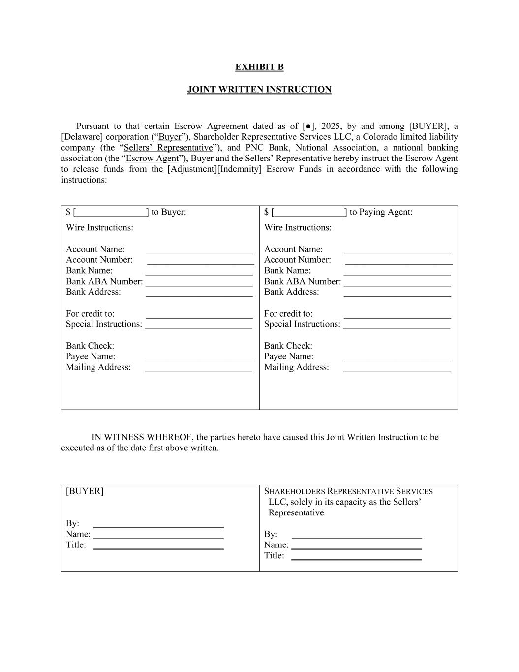 EXHIBIT B JOINT WRITTEN INSTRUCTION Pursuant to that certain Escrow Agreement dated as of [●], 2025, by and among [BUYER], a [Delaware] corporation (“Buyer”), Shareholder Representative Services LLC, a Colorado limited liability company (the “Sellers’ Representative”), and PNC Bank, National Association, a national banking association (the “Escrow Agent”), Buyer and the Sellers’ Representative hereby instruct the Escrow Agent to release funds from the [Adjustment][Indemnity] Escrow Funds in accordance with the following instructions: $ [_______________] to Buyer: Wire Instructions: Account Name: _______________________ Account Number: _______________________ Bank Name: _______________________ Bank ABA Number: _______________________ Bank Address: _______________________ For credit to: _______________________ Special Instructions: _______________________ Bank Check: Payee Name: _______________________ Mailing Address: _______________________ $ [_______________] to Paying Agent: Wire Instructions: Account Name: _______________________ Account Number: _______________________ Bank Name: _______________________ Bank ABA Number: _______________________ Bank Address: _______________________ For credit to: _______________________ Special Instructions: _______________________ Bank Check: Payee Name: _______________________ Mailing Address: _______________________ IN WITNESS WHEREOF, the parties hereto have caused this Joint Written Instruction to be executed as of the date first above written. [BUYER] By: ____________________________ Name: ____________________________ Title: ____________________________ SHAREHOLDERS REPRESENTATIVE SERVICES LLC, solely in its capacity as the Sellers’ Representative By: ____________________________ Name: ____________________________ Title: ____________________________