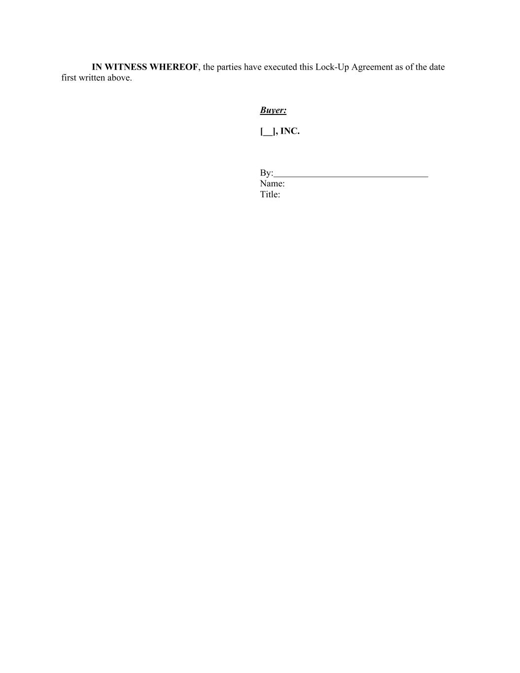 IN WITNESS WHEREOF, the parties have executed this Lock-Up Agreement as of the date first written above. Buyer: [__], INC. By: Name: Title: