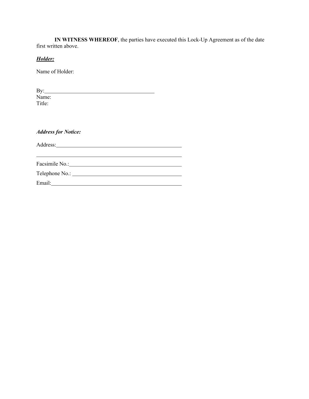 IN WITNESS WHEREOF, the parties have executed this Lock-Up Agreement as of the date first written above. Holder: Name of Holder: By: Name: Title: Address for Notice: Address: Facsimile No.: Telephone No.: Email:
