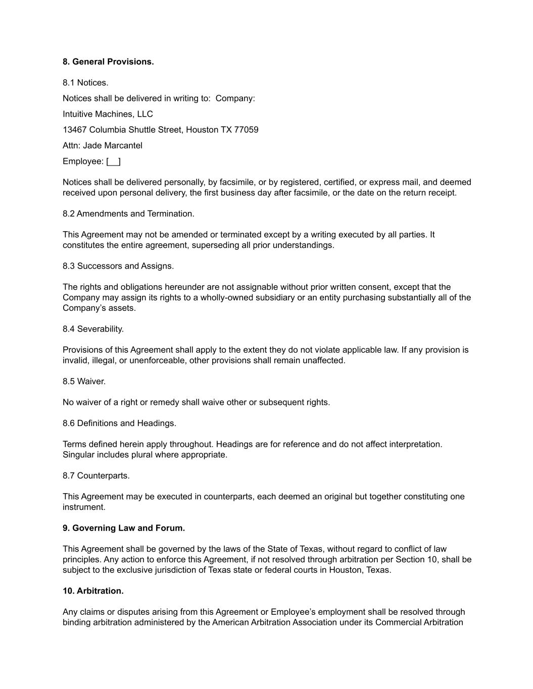 8. General Provisions. 8.1 Notices. Notices shall be delivered in writing to: Company: Intuitive Machines, LLC 13467 Columbia Shuttle Street, Houston TX 77059 Attn: Jade Marcantel Employee: [__] Notices shall be delivered personally, by facsimile, or by registered, certified, or express mail, and deemed received upon personal delivery, the first business day after facsimile, or the date on the return receipt. 8.2 Amendments and Termination. This Agreement may not be amended or terminated except by a writing executed by all parties. It constitutes the entire agreement, superseding all prior understandings. 8.3 Successors and Assigns. The rights and obligations hereunder are not assignable without prior written consent, except that the Company may assign its rights to a wholly-owned subsidiary or an entity purchasing substantially all of the Company’s assets. 8.4 Severability. Provisions of this Agreement shall apply to the extent they do not violate applicable law. If any provision is invalid, illegal, or unenforceable, other provisions shall remain unaffected. 8.5 Waiver. No waiver of a right or remedy shall waive other or subsequent rights. 8.6 Definitions and Headings. Terms defined herein apply throughout. Headings are for reference and do not affect interpretation. Singular includes plural where appropriate. 8.7 Counterparts. This Agreement may be executed in counterparts, each deemed an original but together constituting one instrument. 9. Governing Law and Forum. This Agreement shall be governed by the laws of the State of Texas, without regard to conflict of law principles. Any action to enforce this Agreement, if not resolved through arbitration per Section 10, shall be subject to the exclusive jurisdiction of Texas state or federal courts in Houston, Texas. 10. Arbitration. Any claims or disputes arising from this Agreement or Employee’s employment shall be resolved through binding arbitration administered by the American Arbitration Association under its Commercial Arbitration