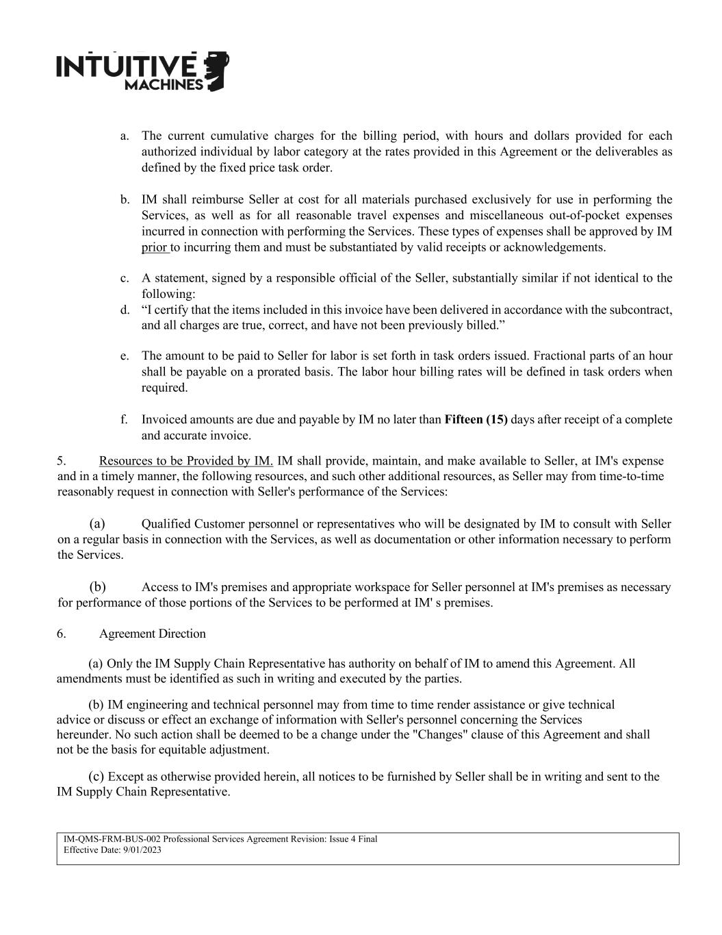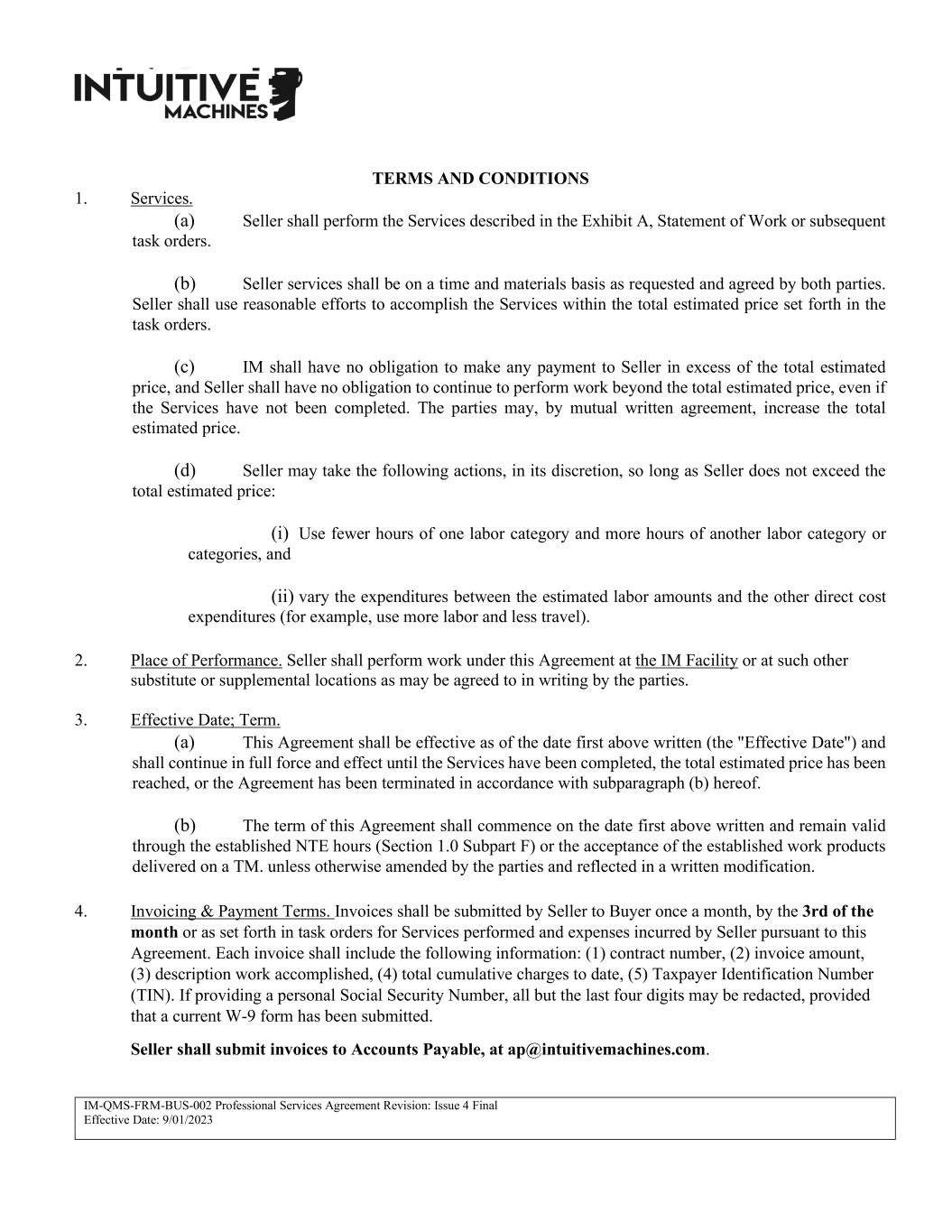 IM-QMS-FRM-BUS-002 Professional Services Agreement Revision: Issue 4 Final Effective Date: 9/01/2023 TERMS AND CONDITIONS 1. Services. (a) Seller shall perform the Services described in the Exhibit A, Statement of Work or subsequent task orders. (b) Seller services shall be on a time and materials basis as requested and agreed by both parties. Seller shall use reasonable efforts to accomplish the Services within the total estimated price set forth in the task orders. (c) IM shall have no obligation to make any payment to Seller in excess of the total estimated price, and Seller shall have no obligation to continue to perform work beyond the total estimated price, even if the Services have not been completed. The parties may, by mutual written agreement, increase the total estimated price. (d) Seller may take the following actions, in its discretion, so long as Seller does not exceed the total estimated price: (i) Use fewer hours of one labor category and more hours of another labor category or categories, and (ii) vary the expenditures between the estimated labor amounts and the other direct cost expenditures (for example, use more labor and less travel). 2. Place of Performance. Seller shall perform work under this Agreement at the IM Facility or at such other substitute or supplemental locations as may be agreed to in writing by the parties. 3. Effective Date; Term. (a) This Agreement shall be effective as of the date first above written (the "Effective Date") and shall continue in full force and effect until the Services have been completed, the total estimated price has been reached, or the Agreement has been terminated in accordance with subparagraph (b) hereof. (b) The term of this Agreement shall commence on the date first above written and remain valid through the established NTE hours (Section 1.0 Subpart F) or the acceptance of the established work products delivered on a TM. unless otherwise amended by the parties and reflected in a written modification. 4. Invoicing & Payment Terms. Invoices shall be submitted by Seller to Buyer once a month, by the 3rd of the month or as set forth in task orders for Services performed and expenses incurred by Seller pursuant to this Agreement. Each invoice shall include the following information: (1) contract number, (2) invoice amount, (3) description work accomplished, (4) total cumulative charges to date, (5) Taxpayer Identification Number (TIN). If providing a personal Social Security Number, all but the last four digits may be redacted, provided that a current W-9 form has been submitted. Seller shall submit invoices to Accounts Payable, at ap@intuitivemachines.com.