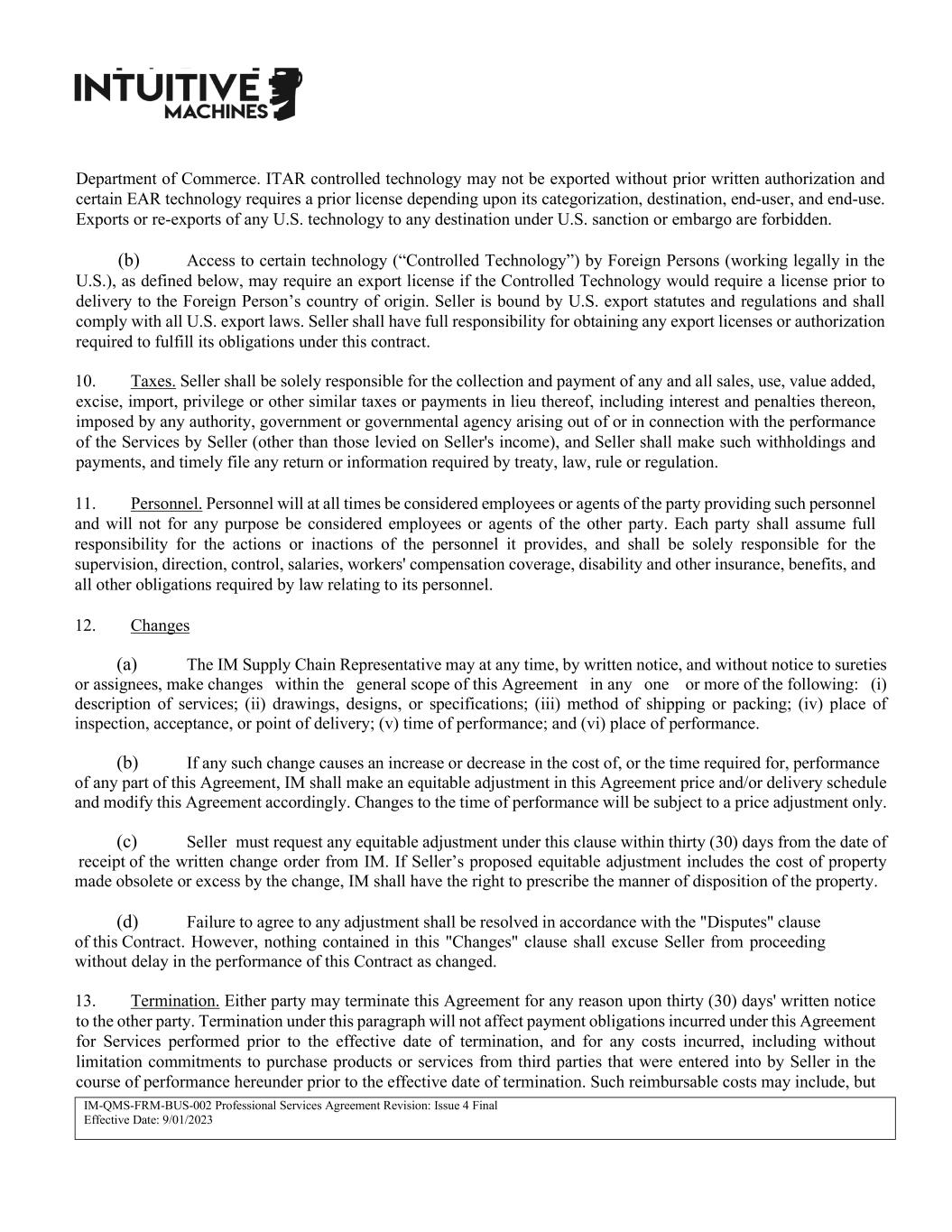 IM-QMS-FRM-BUS-002 Professional Services Agreement Revision: Issue 4 Final Effective Date: 9/01/2023 Department of Commerce. ITAR controlled technology may not be exported without prior written authorization and certain EAR technology requires a prior license depending upon its categorization, destination, end-user, and end-use. Exports or re-exports of any U.S. technology to any destination under U.S. sanction or embargo are forbidden. (b) Access to certain technology (“Controlled Technology”) by Foreign Persons (working legally in the U.S.), as defined below, may require an export license if the Controlled Technology would require a license prior to delivery to the Foreign Person’s country of origin. Seller is bound by U.S. export statutes and regulations and shall comply with all U.S. export laws. Seller shall have full responsibility for obtaining any export licenses or authorization required to fulfill its obligations under this contract. 10. Taxes. Seller shall be solely responsible for the collection and payment of any and all sales, use, value added, excise, import, privilege or other similar taxes or payments in lieu thereof, including interest and penalties thereon, imposed by any authority, government or governmental agency arising out of or in connection with the performance of the Services by Seller (other than those levied on Seller's income), and Seller shall make such withholdings and payments, and timely file any return or information required by treaty, law, rule or regulation. 11. Personnel. Personnel will at all times be considered employees or agents of the party providing such personnel and will not for any purpose be considered employees or agents of the other party. Each party shall assume full responsibility for the actions or inactions of the personnel it provides, and shall be solely responsible for the supervision, direction, control, salaries, workers' compensation coverage, disability and other insurance, benefits, and all other obligations required by law relating to its personnel. 12. Changes (a) The IM Supply Chain Representative may at any time, by written notice, and without notice to sureties or assignees, make changes within the general scope of this Agreement in any one or more of the following: (i) description of services; (ii) drawings, designs, or specifications; (iii) method of shipping or packing; (iv) place of inspection, acceptance, or point of delivery; (v) time of performance; and (vi) place of performance. (b) If any such change causes an increase or decrease in the cost of, or the time required for, performance of any part of this Agreement, IM shall make an equitable adjustment in this Agreement price and/or delivery schedule and modify this Agreement accordingly. Changes to the time of performance will be subject to a price adjustment only. (c) Seller must request any equitable adjustment under this clause within thirty (30) days from the date of receipt of the written change order from IM. If Seller’s proposed equitable adjustment includes the cost of property made obsolete or excess by the change, IM shall have the right to prescribe the manner of disposition of the property. (d) Failure to agree to any adjustment shall be resolved in accordance with the "Disputes" clause of this Contract. However, nothing contained in this "Changes" clause shall excuse Seller from proceeding without delay in the performance of this Contract as changed. 13. Termination. Either party may terminate this Agreement for any reason upon thirty (30) days' written notice to the other party. Termination under this paragraph will not affect payment obligations incurred under this Agreement for Services performed prior to the effective date of termination, and for any costs incurred, including without limitation commitments to purchase products or services from third parties that were entered into by Seller in the course of performance hereunder prior to the effective date of termination. Such reimbursable costs may include, but