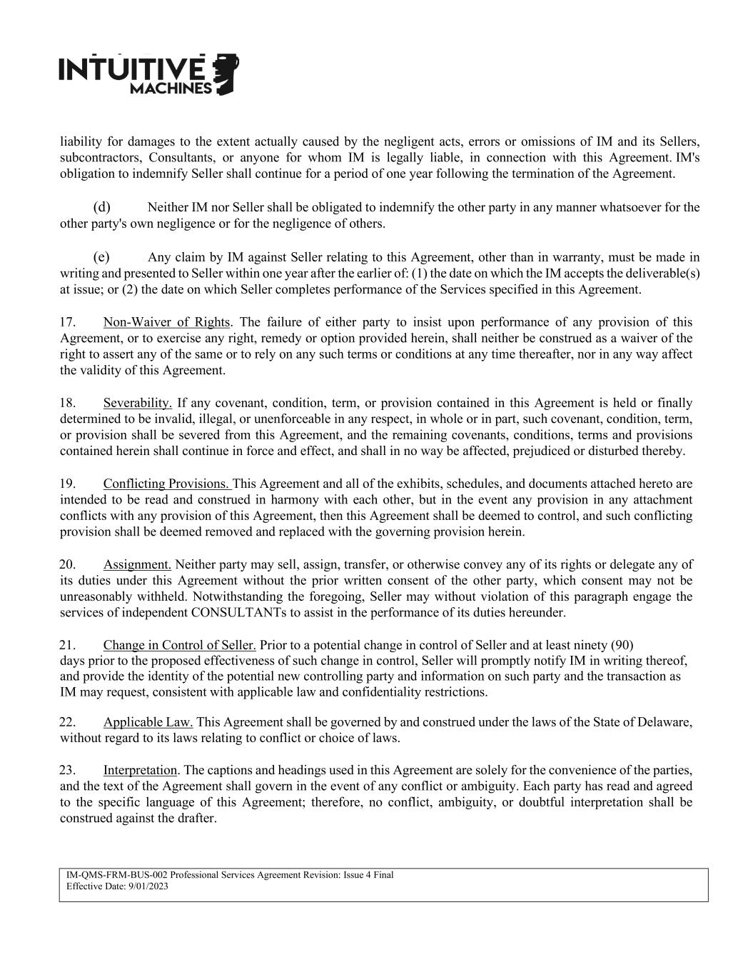 IM-QMS-FRM-BUS-002 Professional Services Agreement Revision: Issue 4 Final Effective Date: 9/01/2023 liability for damages to the extent actually caused by the negligent acts, errors or omissions of IM and its Sellers, subcontractors, Consultants, or anyone for whom IM is legally liable, in connection with this Agreement. IM's obligation to indemnify Seller shall continue for a period of one year following the termination of the Agreement. (d) Neither IM nor Seller shall be obligated to indemnify the other party in any manner whatsoever for the other party's own negligence or for the negligence of others. (e) Any claim by IM against Seller relating to this Agreement, other than in warranty, must be made in writing and presented to Seller within one year after the earlier of: (1) the date on which the IM accepts the deliverable(s) at issue; or (2) the date on which Seller completes performance of the Services specified in this Agreement. 17. Non-Waiver of Rights. The failure of either party to insist upon performance of any provision of this Agreement, or to exercise any right, remedy or option provided herein, shall neither be construed as a waiver of the right to assert any of the same or to rely on any such terms or conditions at any time thereafter, nor in any way affect the validity of this Agreement. 18. Severability. If any covenant, condition, term, or provision contained in this Agreement is held or finally determined to be invalid, illegal, or unenforceable in any respect, in whole or in part, such covenant, condition, term, or provision shall be severed from this Agreement, and the remaining covenants, conditions, terms and provisions contained herein shall continue in force and effect, and shall in no way be affected, prejudiced or disturbed thereby. 19. Conflicting Provisions. This Agreement and all of the exhibits, schedules, and documents attached hereto are intended to be read and construed in harmony with each other, but in the event any provision in any attachment conflicts with any provision of this Agreement, then this Agreement shall be deemed to control, and such conflicting provision shall be deemed removed and replaced with the governing provision herein. 20. Assignment. Neither party may sell, assign, transfer, or otherwise convey any of its rights or delegate any of its duties under this Agreement without the prior written consent of the other party, which consent may not be unreasonably withheld. Notwithstanding the foregoing, Seller may without violation of this paragraph engage the services of independent CONSULTANTs to assist in the performance of its duties hereunder. 21. Change in Control of Seller. Prior to a potential change in control of Seller and at least ninety (90) days prior to the proposed effectiveness of such change in control, Seller will promptly notify IM in writing thereof, and provide the identity of the potential new controlling party and information on such party and the transaction as IM may request, consistent with applicable law and confidentiality restrictions. 22. Applicable Law. This Agreement shall be governed by and construed under the laws of the State of Delaware, without regard to its laws relating to conflict or choice of laws. 23. Interpretation. The captions and headings used in this Agreement are solely for the convenience of the parties, and the text of the Agreement shall govern in the event of any conflict or ambiguity. Each party has read and agreed to the specific language of this Agreement; therefore, no conflict, ambiguity, or doubtful interpretation shall be construed against the drafter.