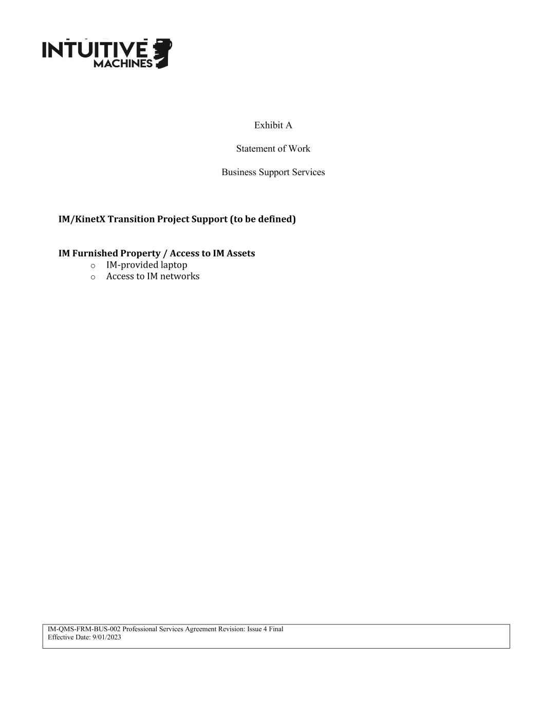 IM-QMS-FRM-BUS-002 Professional Services Agreement Revision: Issue 4 Final Effective Date: 9/01/2023 Exhibit A Statement of Work Business Support Services IM/KinetX Transition Project Support (to be defined) IM Furnished Property / Access to IM Assets o IM-provided laptop o Access to IM networks
