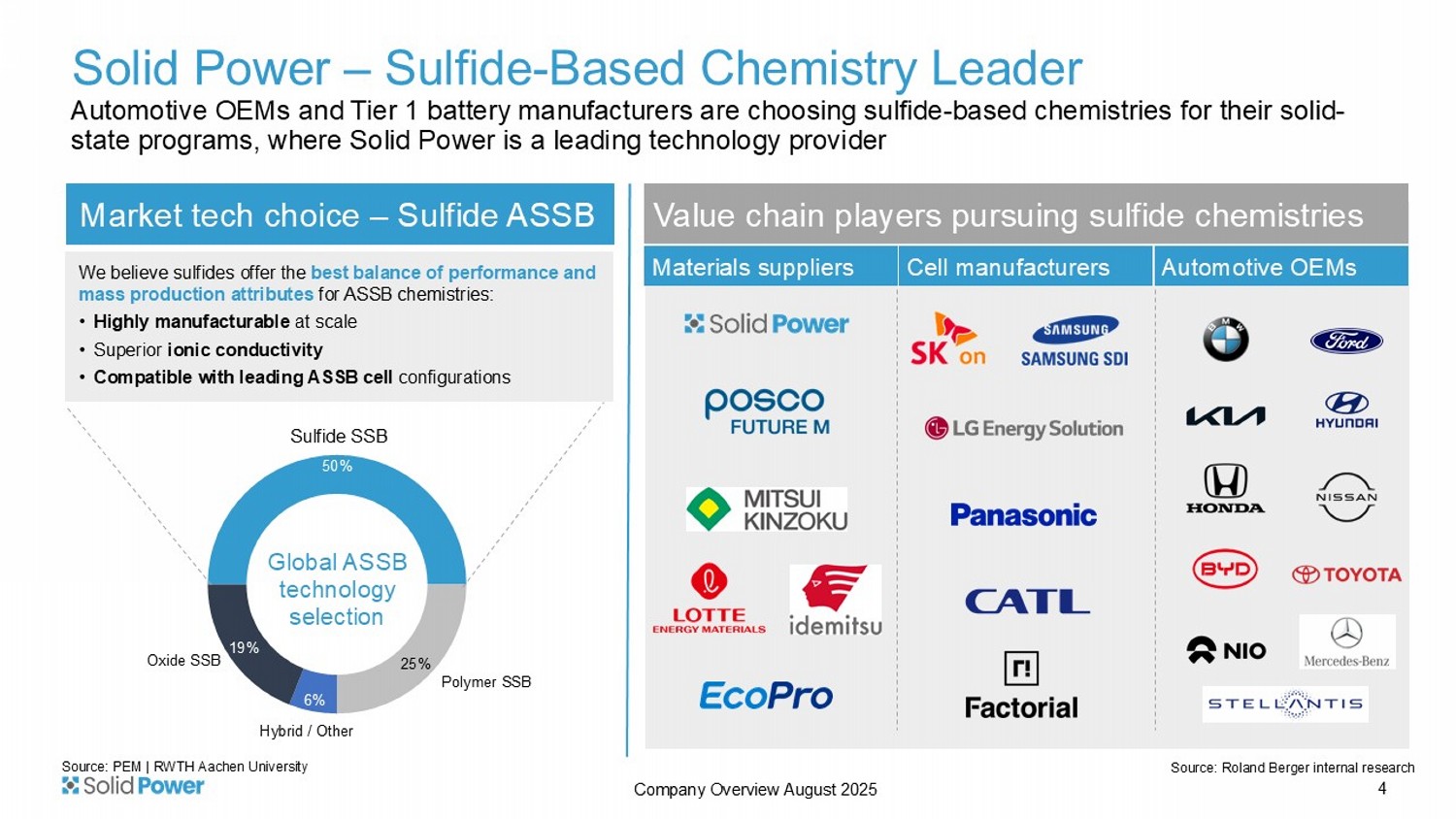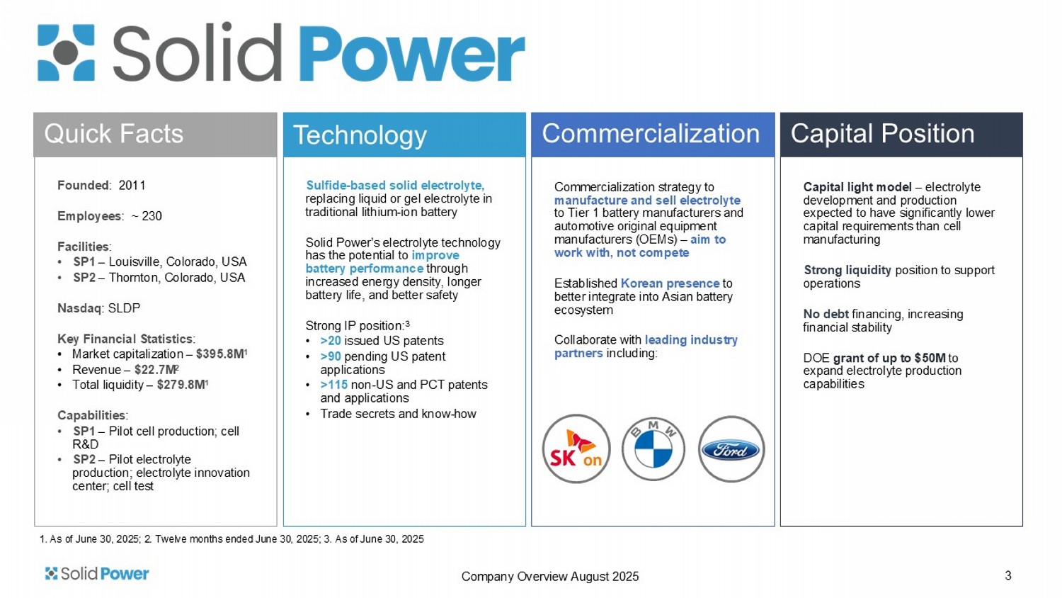 Cautionary Note Regarding Forward - Looking Statements All statements other than statements of present or historical fact contained herein are “forward - looking statements” within the meaning of Section 27A of the Securities Act of 1933, as amended, and Section 21E of the Securities Exchange Act of 1934, as amended, including Solid Power’s or its management team’s expectations, objectives, beliefs, intenti ons or strategies regarding the future. When used herein, the words “could,” “should,” “will,” “may,” “believe,” “anticipate,” “intend,” “estimate,” “expect,” “project,” “plan,” “outlook,” “seek,” the negative of such terms, an d o ther similar expressions are intended to identify forward - looking statements, although not all forward - looking statements contain such identifying words. These statements may include, but are not limited to, our financial guidance for 2 025 ; our future financial performance, strategy, expansion plans, including plans related to the expansion of our electrolyte production capabilities, market opportunity, operations, and operating results; estimated revenues or losses; pr ojected costs; future prospects; and plans and objectives of management. These forward - looking statements are based on management’s current expectations and assumptions about future events and are based on currently available infor mat ion as to the outcome and timing of future events. Except as otherwise required by applicable law, Solid Power disclaims any duty to update any forward - looking statements, all of which are expressly qualified by the statements in this section, to reflect events or circumstances after the date hereof. Readers are cautioned not to put undue reliance on forward - looking statements and Solid Power cautions you that these forward - looking statements are subject to n umerous risks and uncertainties, most of which are difficult to predict and many of which are beyond the control of Solid Power, including the following factors: ( i ) risks relating to the uncertainty of the success of our research and development efforts, including our ability to achieve the technological objectives or results that our partners require and our ability to commercialize our technology in advance of competing technologies and our competitors; (ii) risks rel ating to our status as a research and development stage company with a history of financial losses with an expectation of incurring significant expenses and continuing losses for the foreseeable future, including execution of our bu sin ess plan and the timing of expected business milestones; (iii) risks relating to the non - exclusive nature of our partnerships, our ability to secure new business relationships, and our ability to manage these relationships; (iv) our abili ty to negotiate and execute commercial agreements with our partners and customers on commercially reasonable terms; (v) broad market adoption of EVs and other technologies where we are able to deploy our technology, if developed succe ssf ully; (vi) our success attracting and retaining our executive officers, key employees, and other qualified personnel; (vii) our ability to protect and maintain our intellectual property, including in jurisdictions outside of the Uni ted States; (viii) our ability to secure government contracts and grants, changes in government priorities with respect to our government contracts and grants, and the availability of government subsidies and economic incentives; (ix) delays in the construction and operation of facilities that meet our short - term research and development and long - term electrolyte production requirements; (x) changes in applicable laws or regulations; (xi) risks relating to our information te chn ology infrastructure and data security breaches; and (xii) risks relating to other economic, business, or competitive factors in the United States and other jurisdictions, including supply chain interruptions and changes in market con ditions, and our ability to manage these risks and uncertainties. Additional information concerning these and other factors that may impact the operations and projections discussed herein can be found in the “Risk Factors” sections of Sol id Power’s Annual Report on Form 10 - K for the year ended December 31, 2024 , Solid Power's Quarterly Report on Form 10 - Q for the quarter ended June 30, 2025, and other documents filed by Solid Power from time to time with the Securities and Exchange Commission (the “SEC”), all of which ar e available on the SEC’s website at www.sec.gov. These filings identify and address other important risks and uncertainties that could cause actual events and re sul ts to differ materially from those contained in the forward - looking statements. Solid Power gives no assurance that it will achieve its expectations. Trademarks and Trade Names Solid Power owns or has rights to various trademarks, service marks and trade names that it uses in connection with its opera tio ns. This presentation may also contain trademarks, service marks, and trade names of third parties which are the property of their respective owners. The use or display of third parties’ trademarks, service marks, trade names, or pro ducts in this presentation is not intended to, and does not imply, a relationship with Solid Power, or an endorsement or sponsorship by or of Solid Power. Solely for convenience, the trademarks, service marks, and trade names refer red to in this presentation may appear with the ®, TM, or SM symbols, but such references are not intended to indicate, in any way, that Solid Power will not assert, to the fullest extent under applicable law, its rights or th e right of the applicable licensor to these trademarks, service marks, and trade names. Industry and Market Data Although all information, opinions, and other information expressed in this presentation, including market data and other sta 