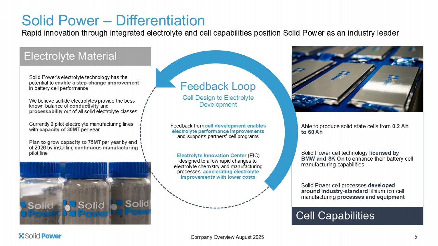 Solid Power – Sulfide - Based Chemistry Leader Materials suppliers Cell manufacturers Automotive OEMs Value chain players pursuing sulfide chemistries 50% 25% 6% 19% Sulfide SSB Polymer SSB Hybrid / Other Oxide SSB Global ASSB technology selection We believe sulfides offer the best balance of performance and mass production attributes for ASSB chemistries: • Highly manufacturable at scale • Superior ionic conductivity • Compatible with leading ASSB cell configurations Market tech choice – Sulfide ASSB Source: PEM | RWTH Aachen University 4 Automotive OEMs and Tier 1 battery manufacturers are choosing sulfide - based chemistries for their solid - state programs, where Solid Power is a leading technology provider Company Overview August 2025 Source: Roland Berger internal research