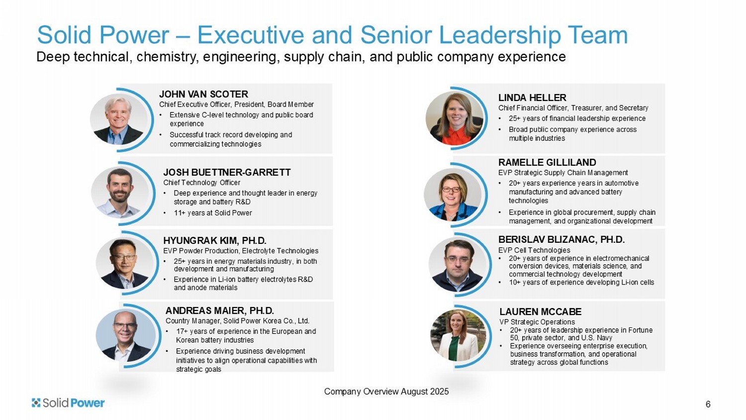 Solid Power – Differentiation Solid Power’s electrolyte technology has the potential to enable a step - change improvement in battery cell performance We believe sulfide electrolytes provide the best - known balance of conductivity and processability out of all solid electrolyte classes Currently 2 pilot electrolyte manufacturing lines with capacity of 30MT per year Plan to grow capacity to 75MT per year by end of 2026 by installing continuous manufacturing pilot line Electrolyte Material Feedback Loop Cell Design to Electrolyte Development Feedback from cell development enables electrolyte performance improvements and supports partners’ cell programs Electrolyte Innovation Center (EIC) designed to allow rapid changes to electrolyte chemistry and manufacturing processes, accelerating electrolyte improvements with lower costs Able to produce solid - state cells from 0.2 Ah to 60 Ah Solid Power cell technology licensed by BMW and SK On to enhance their battery cell manufacturing capabilities Solid Power cell processes developed around industry - standard lithium - ion cell manufacturing processes and equipment Cell Capabilities Rapid innovation through integrated electrolyte and cell capabilities position Solid Power as an industry leader 5 Company Overview August 2025