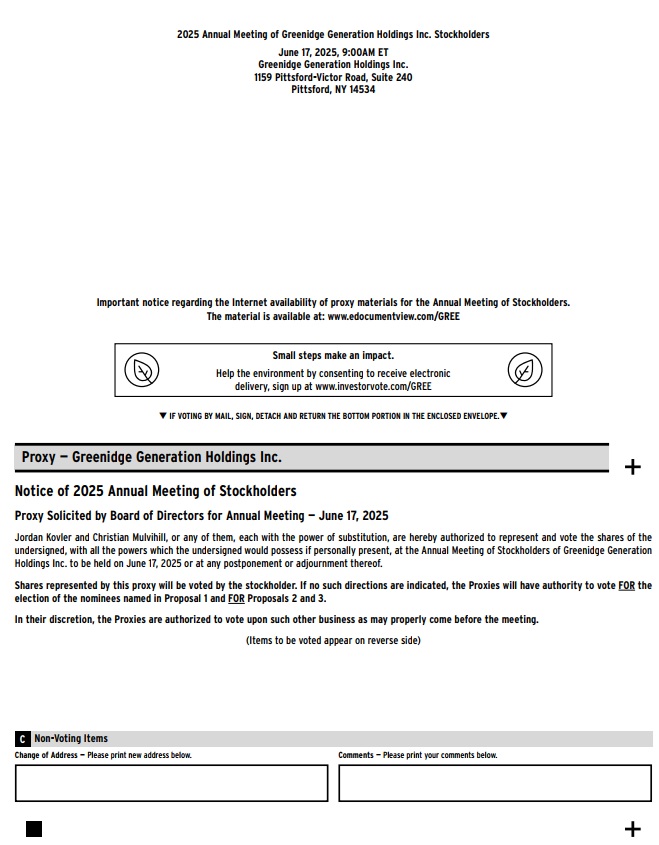 You are cordially invited to attend the 2025 Annual Meeting of Stockholders (the “Annual Meeting”) of Greenidge Generation Holdings Inc. (“Greenidge,” the “Company,” “we,” “us,” and “our”), which will be held on June 17, 2025, at 9:00 a.m. EDT at the Company’s headquarters located at 1159 Pittsford-Victor Road, Suite 240, Pittsford, NY 14534.
