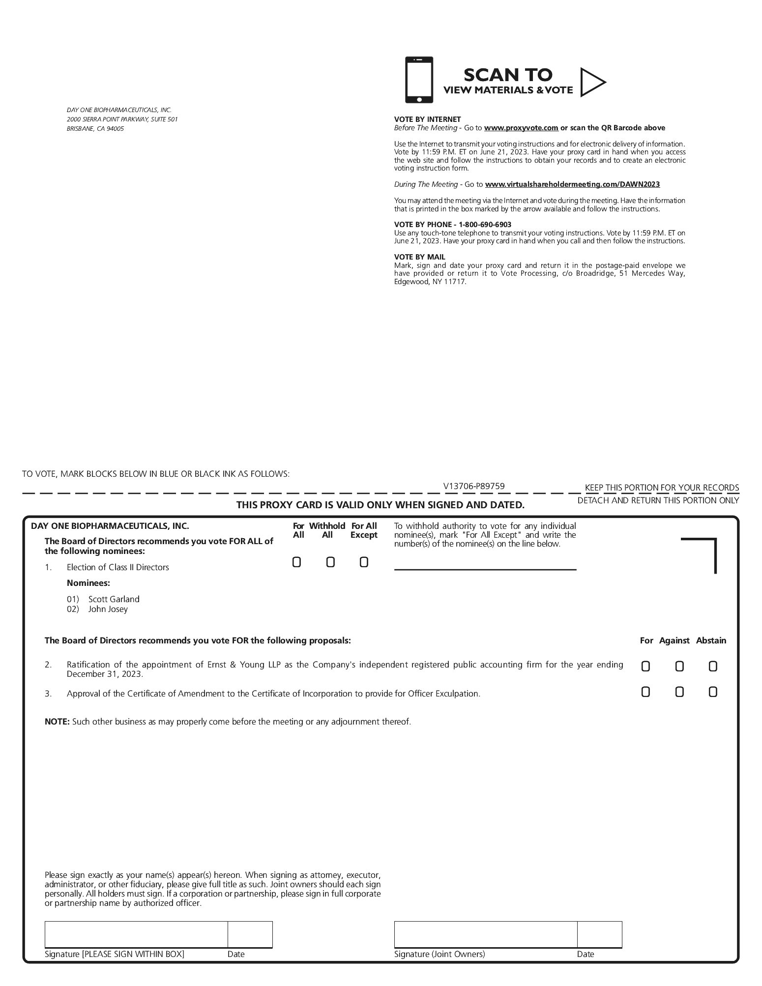 You may vote via the virtual meeting website-any stockholder can attend the Annual Meeting by visiting www.virtualshareholdermeeting.com/DAWN2023, where stockholders may vote and submit questions during the meeting. The meeting starts at 9:00 a.m. Pacific Time. Please have your 16-Digit Control Number to join the Annual Meeting. Instructions on how to attend and participate via the Internet, including how to demonstrate proof of stock ownership, are posted at www.virtualshareholdermeeting.com/DAWN2023. | | | You may vote by telephone or through the Internet-in order to do so, please follow the instructions shown on your proxy card. | | | You may vote by mail-if you request or receive a paper proxy card and voting instructions by mail, simply complete, sign and date the enclosed proxy card and promptly return it in the envelope provided or, if the envelope is missing, please mail your completed proxy card to Vote Processing, c/o Broadridge Financial Solutions, Inc., 51 Mercedes Way, Edgewood, New York 11717. Your completed, signed, and dated proxy card must be received prior to the Annual Meeting. |