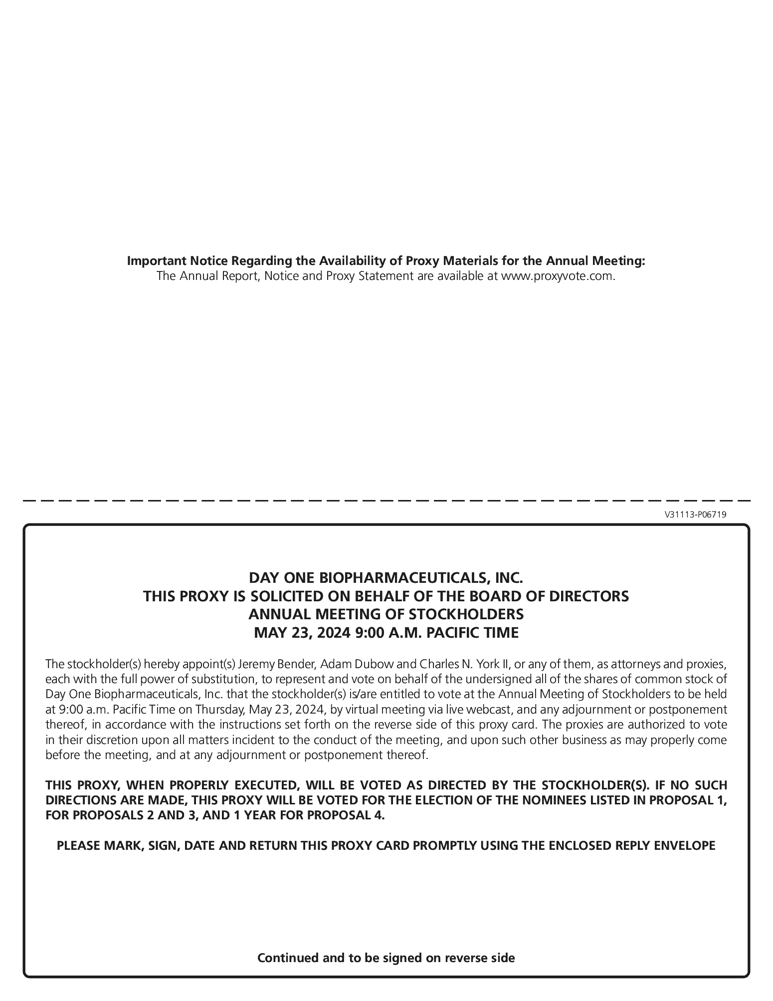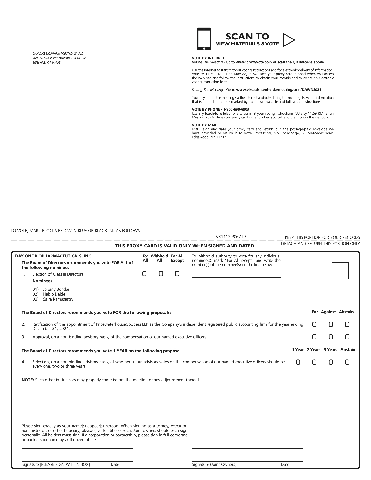 • | If you wish to submit a question during the Annual Meeting, log into the virtual meeting platform at www.virtualshareholdermeeting.com/DAWN2024, type your question into the “Ask a Question” field, and click “Submit.” If your question is properly submitted during the relevant portion of the meeting agenda, we will respond to your question during the live webcast, subject to time constraints. Questions that are substantially similar may be grouped and answered together to avoid repetition. We reserve the right to exclude questions that are irrelevant to meeting matters, irrelevant to the business of Day One, or derogatory or in bad taste; that relate to pending or threatened litigation; that are personal grievances; or that are otherwise inappropriate (as determined by the chair of the Annual Meeting). |